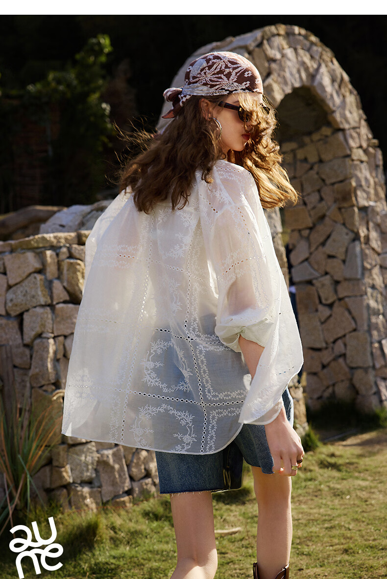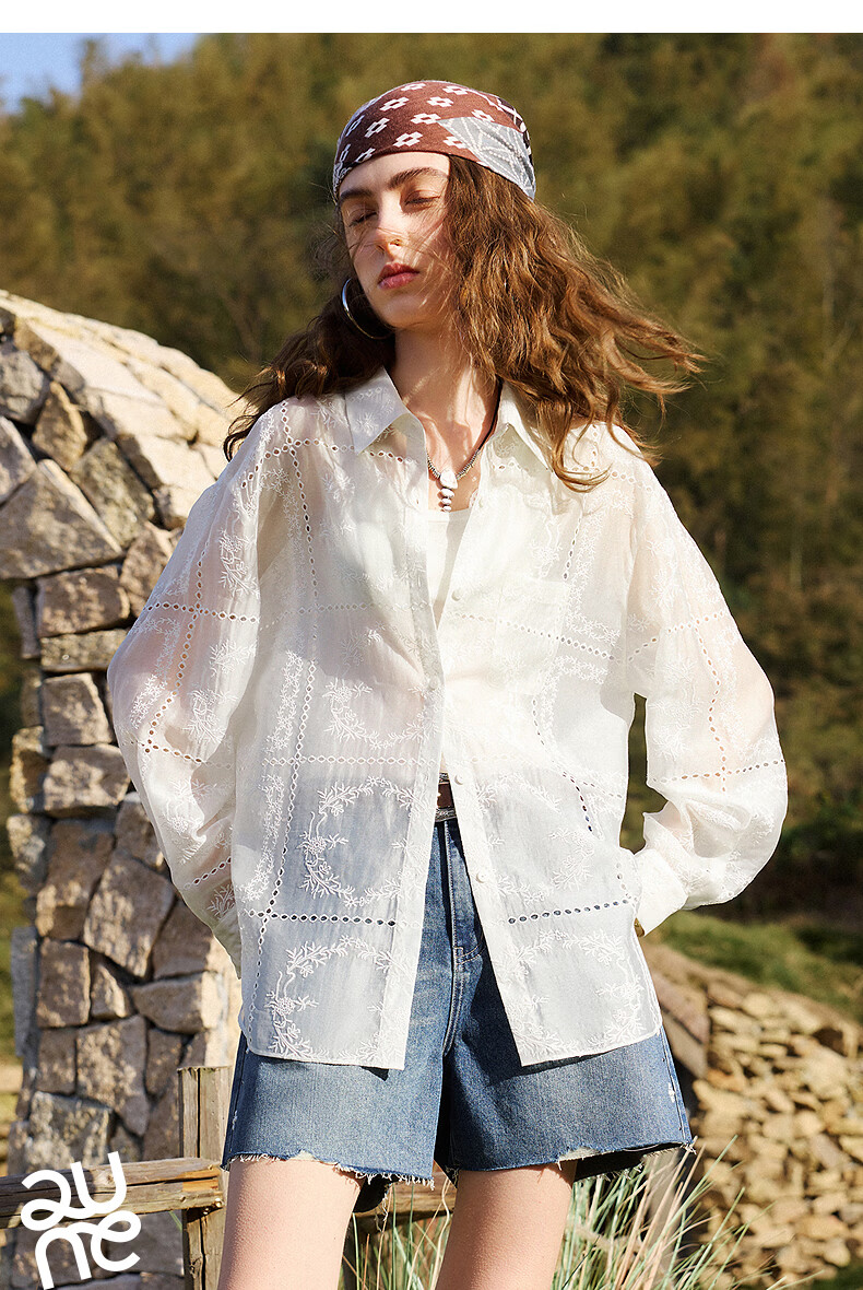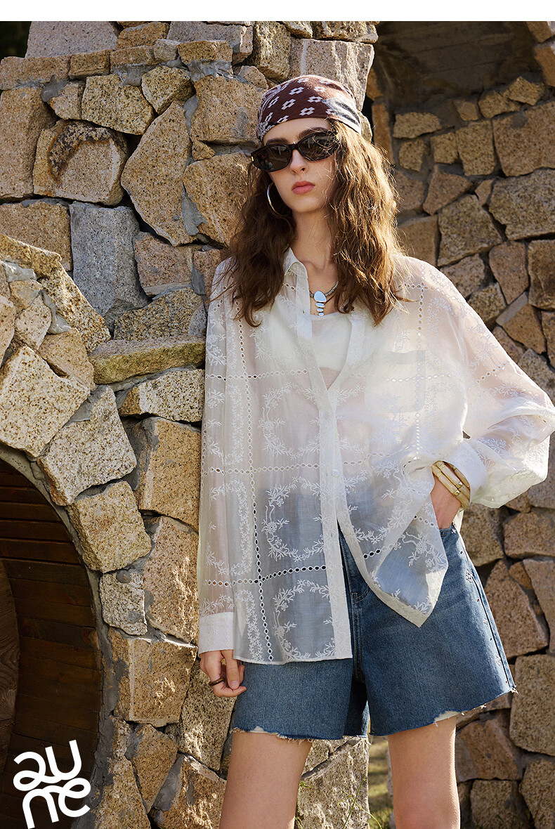Chuyu Lyocell heavy industry embroidered white shirt for women 2026 spring new loose mid-length hollow cardigan top off-white S