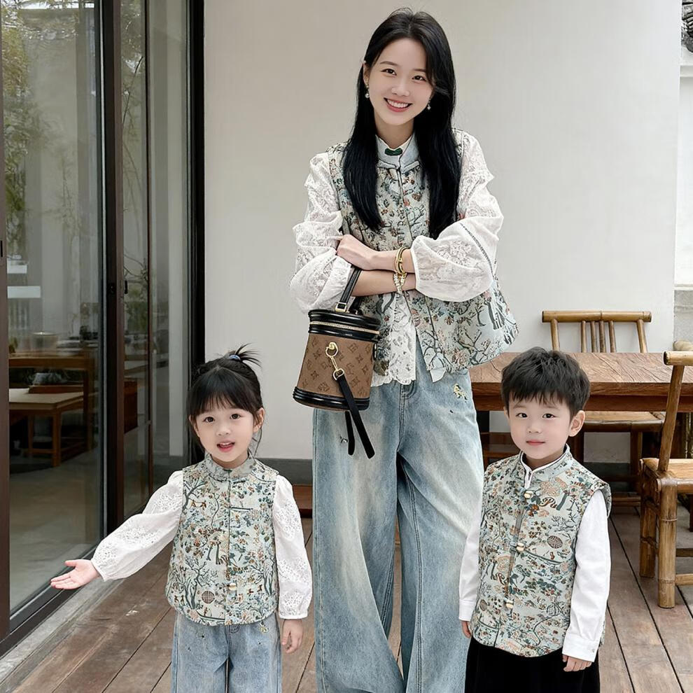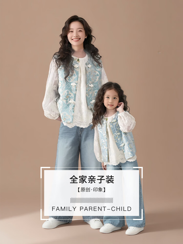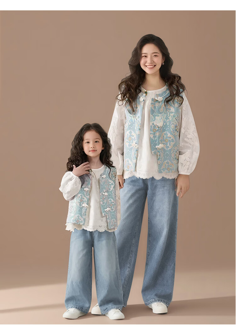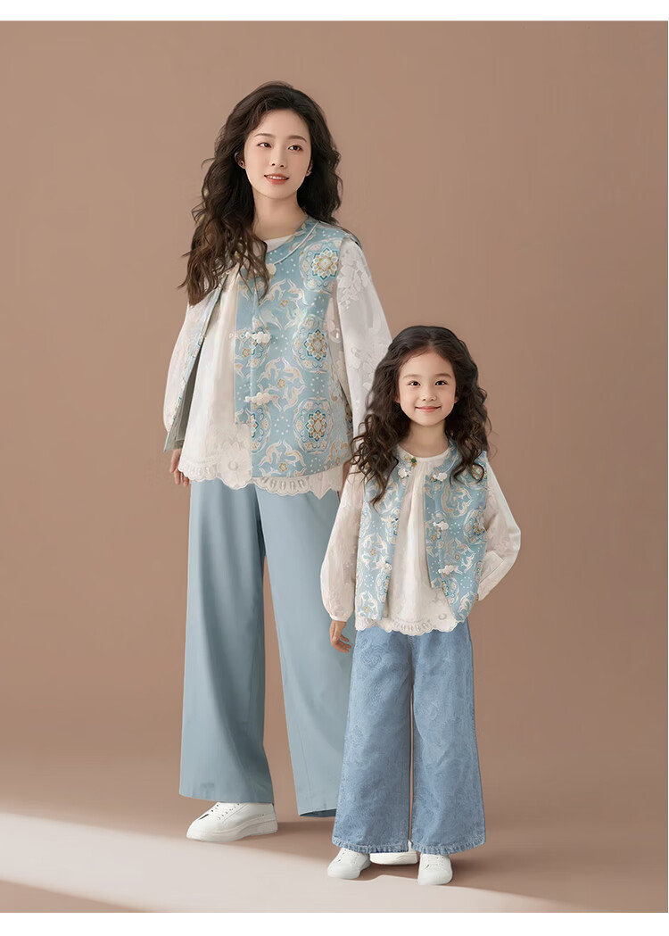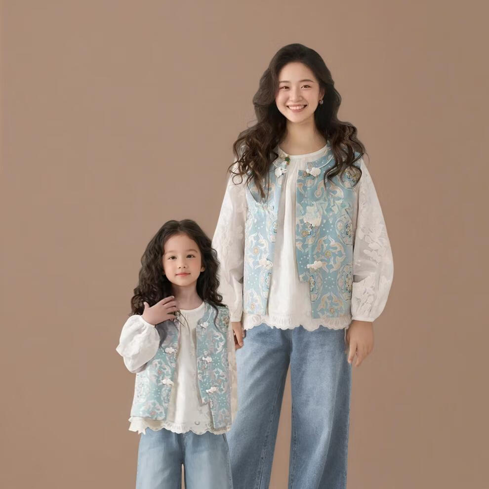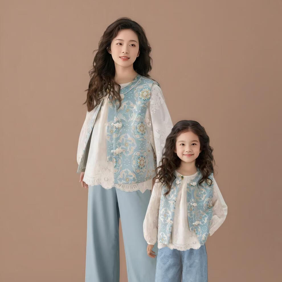 QINZHI Hanfu parent-child clothing mother and daughter autumn and winter new Chinese style parent-child clothing Chinese style buckle vest autumn clothing 2025 new retro mother-in-law floral blue vest 120 girls height about 110cm