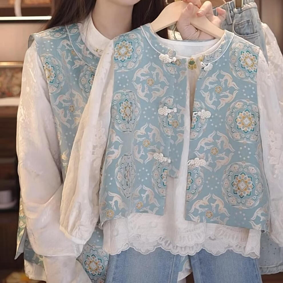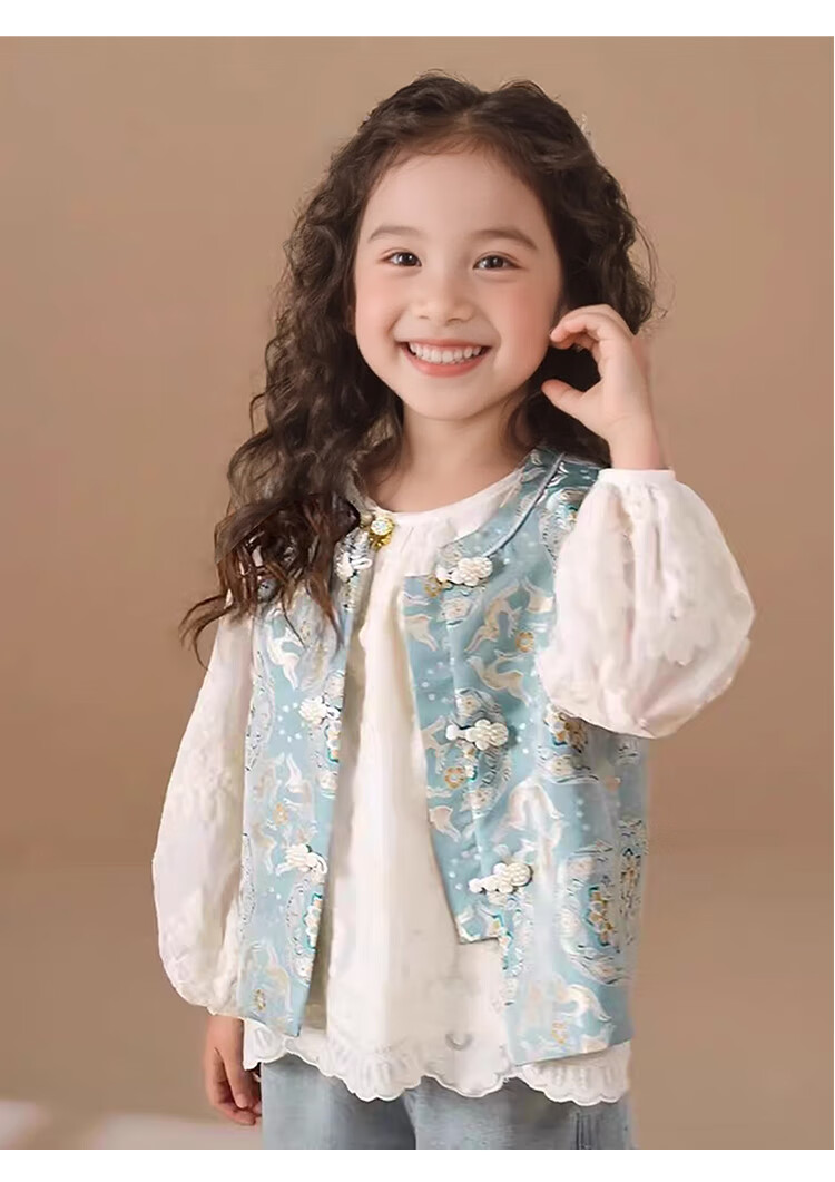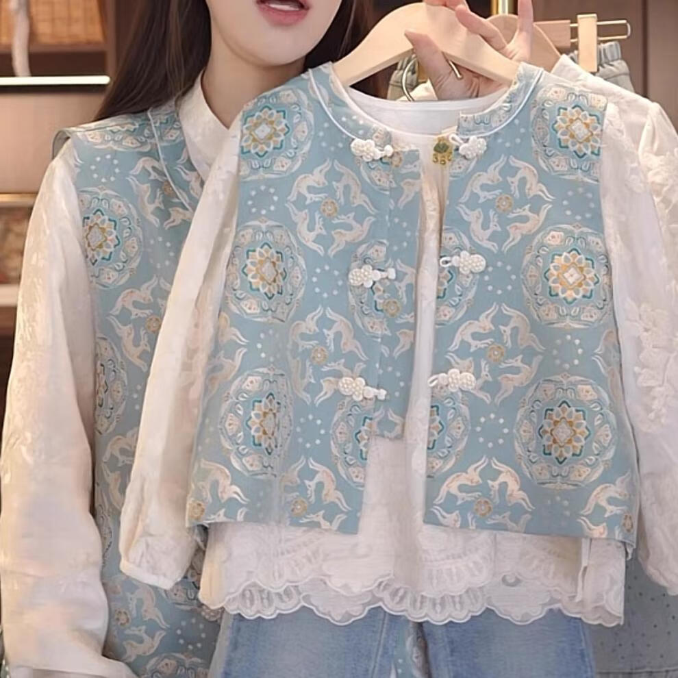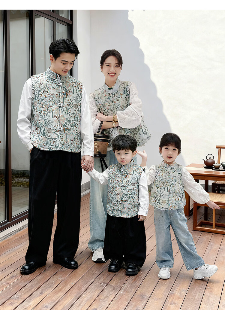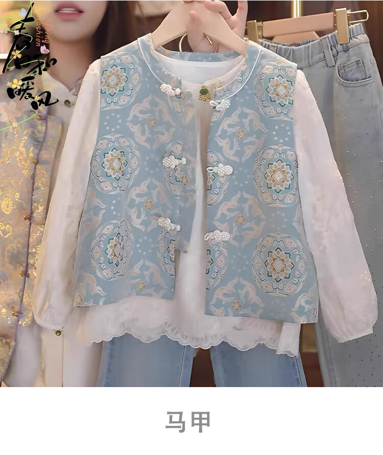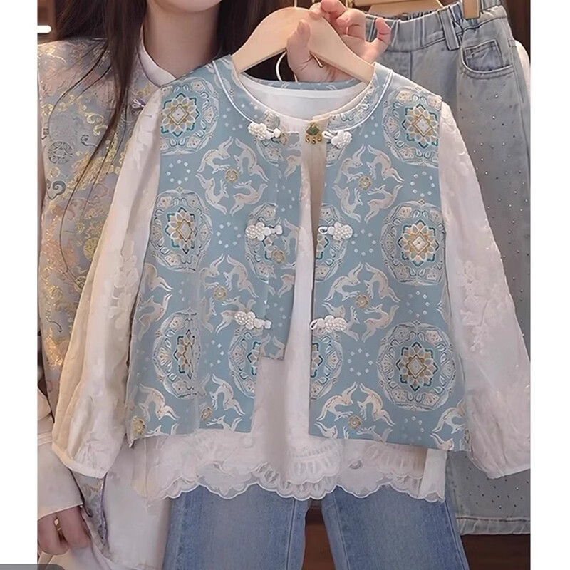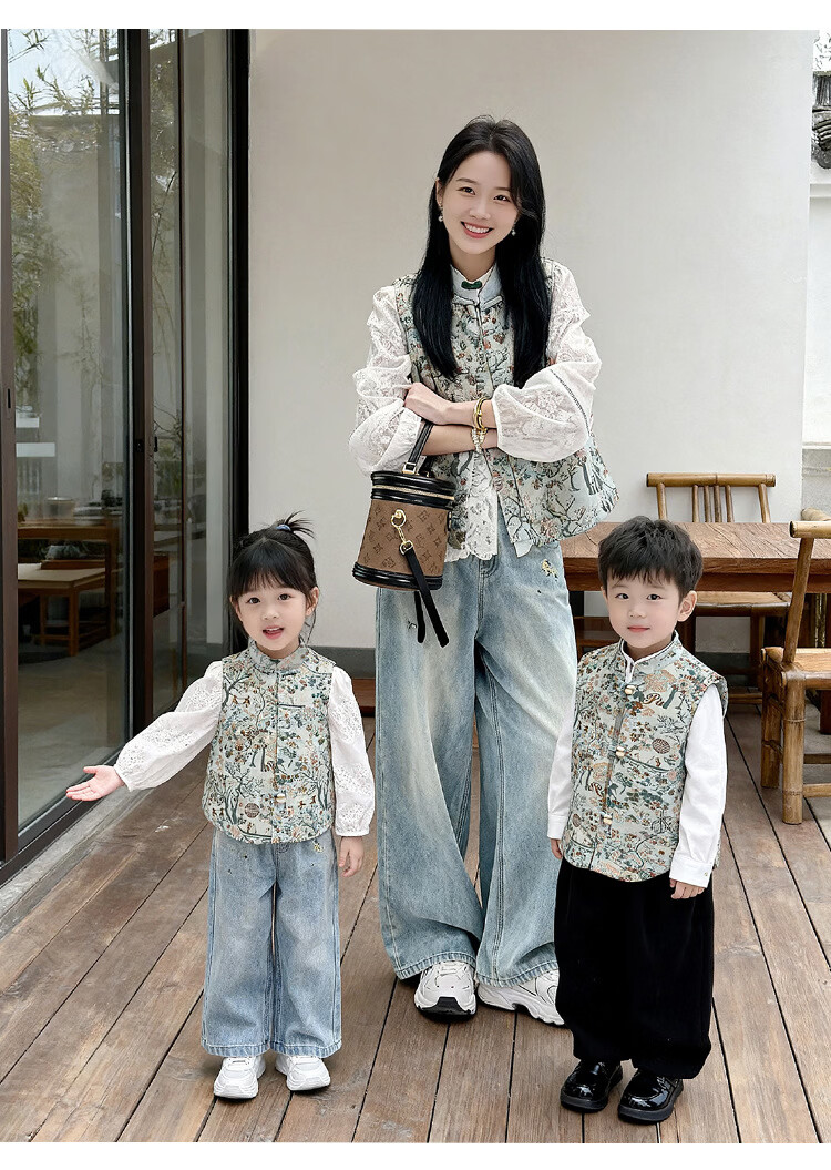 QINZHI Hanfu parent-child clothing mother and daughter autumn and winter new Chinese style parent-child clothing Chinese style buckle vest autumn clothing 2025 new retro mother-in-law floral blue vest 120 girls height about 110cm