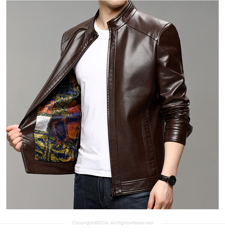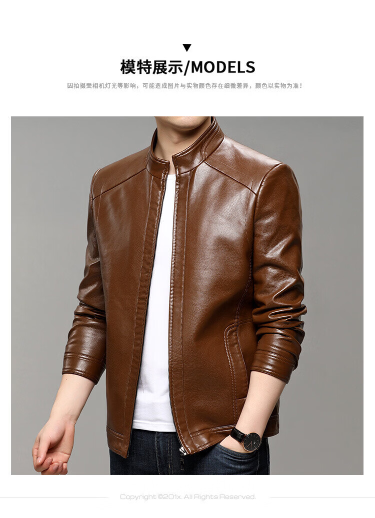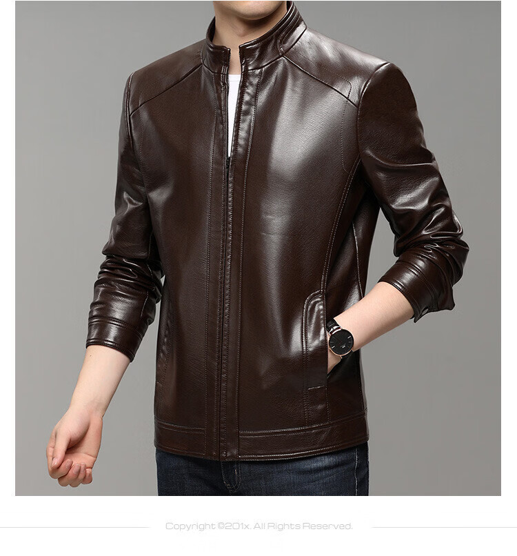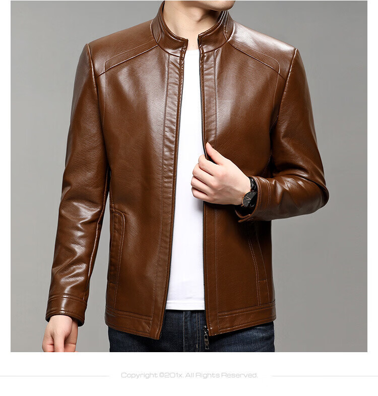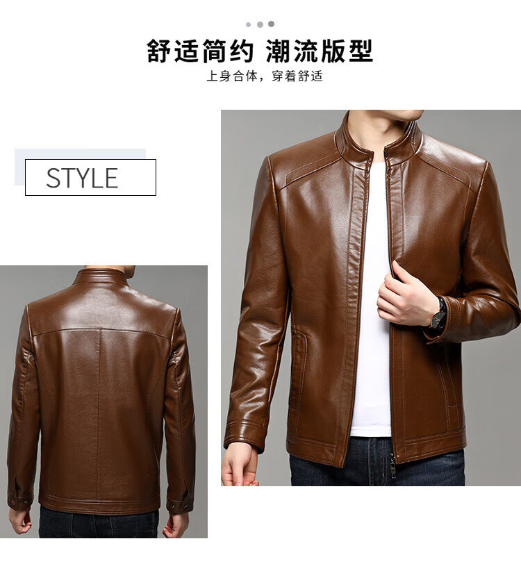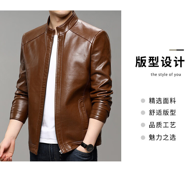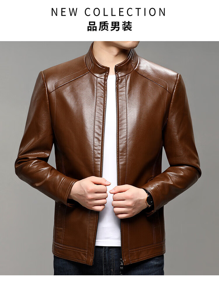 KBXNG Jinba business men's leather jacket stand collar casual autumn and winter jacket young and middle-aged pu leather jacket versatile trendy top brown M 170
