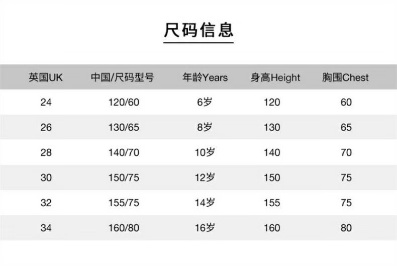 China (cm) 165 / 88-90 170 / 96-98 175 / 108-110 180 / 118-122 185 / 126-130
