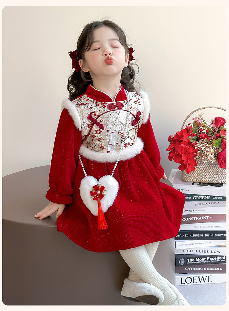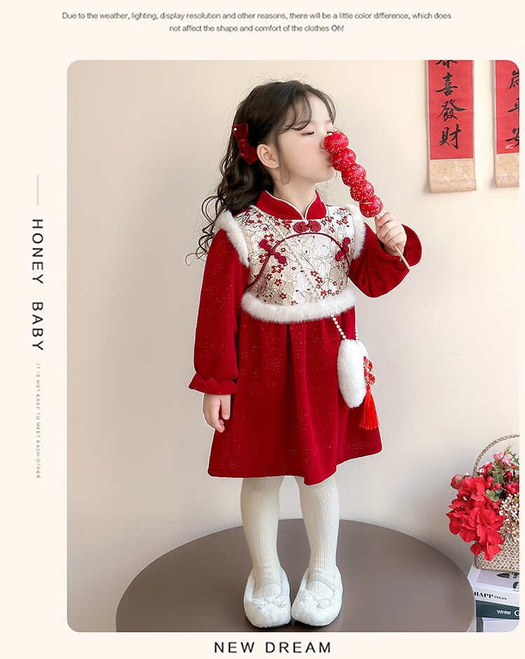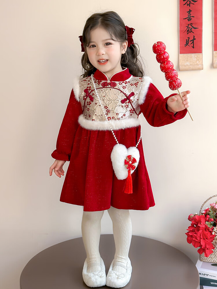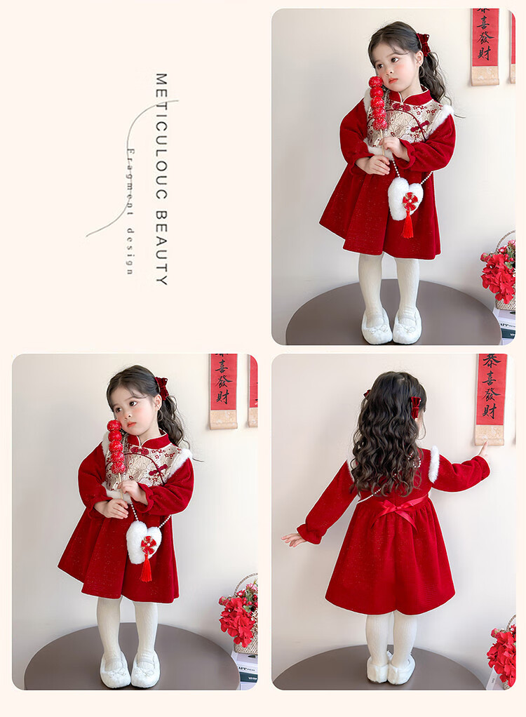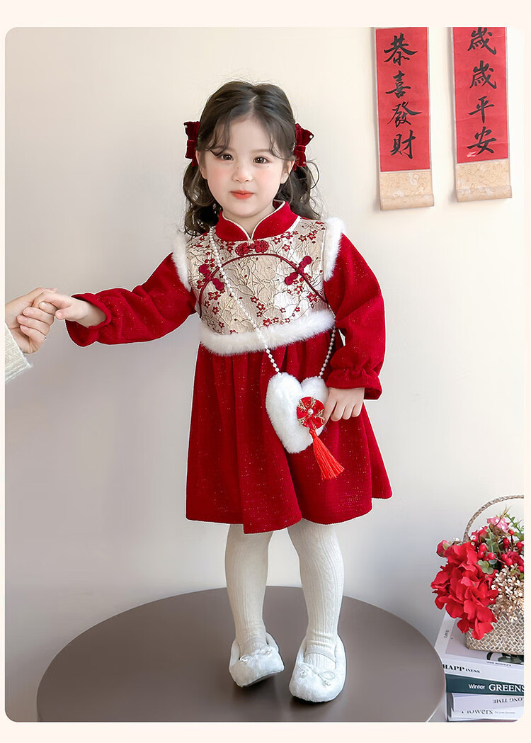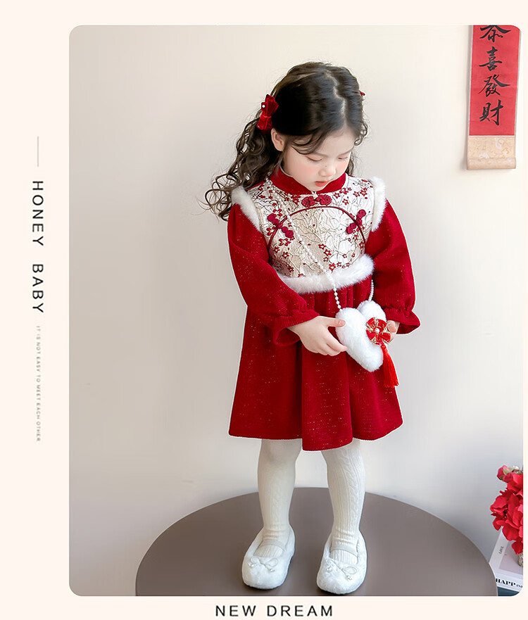 G.duck Little Yellow Duck New Year's Greetings Girls Dress Autumn and Winter Plus Velvet Children's Chinese New Year Hanfu Skirt Chinese Style Winter Princess Dress Red Free Pack 120 Recommended 110-120cm5-6 years old