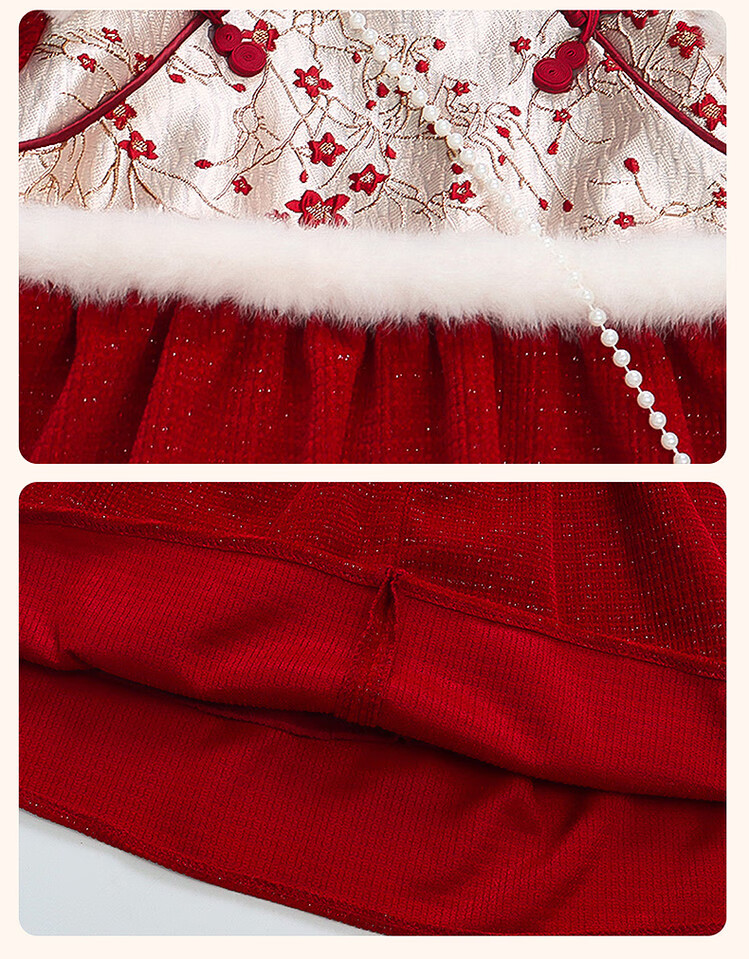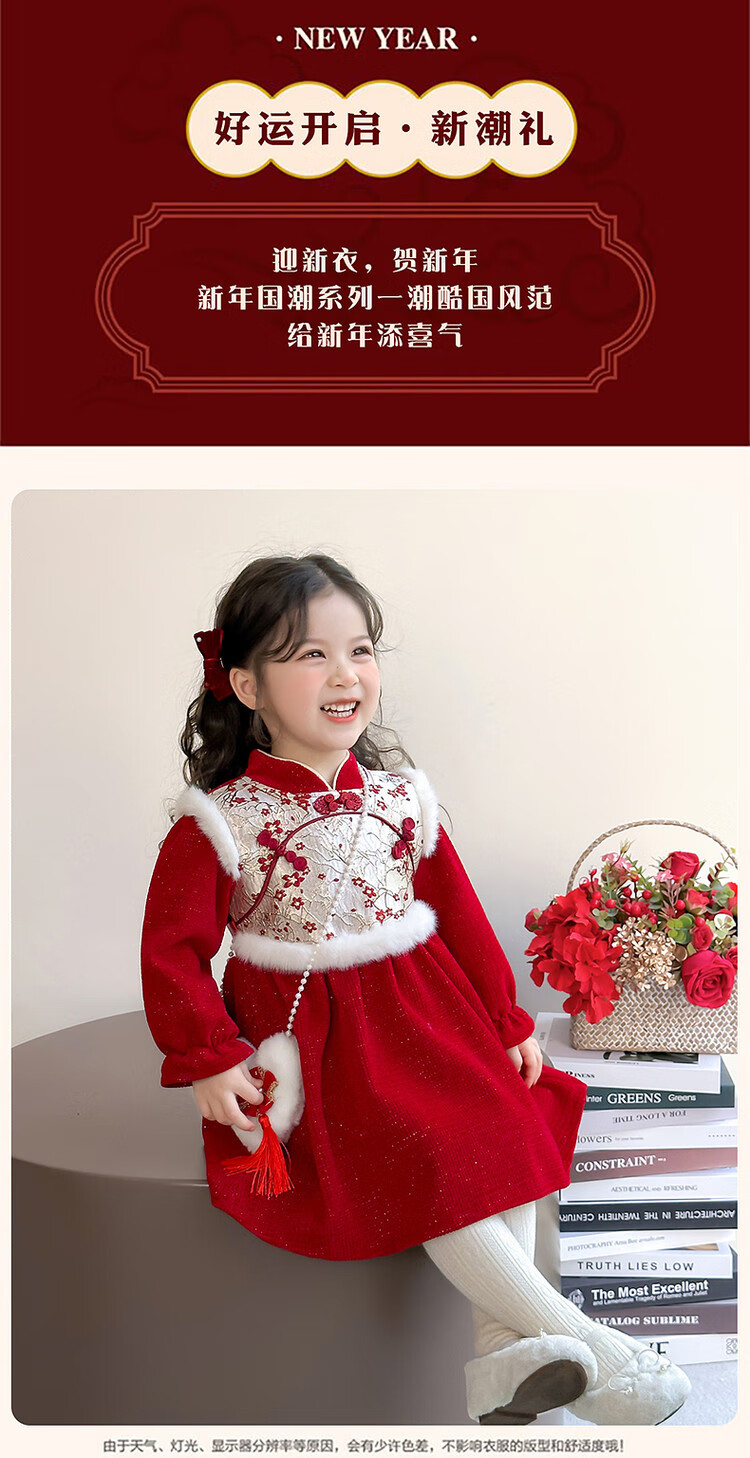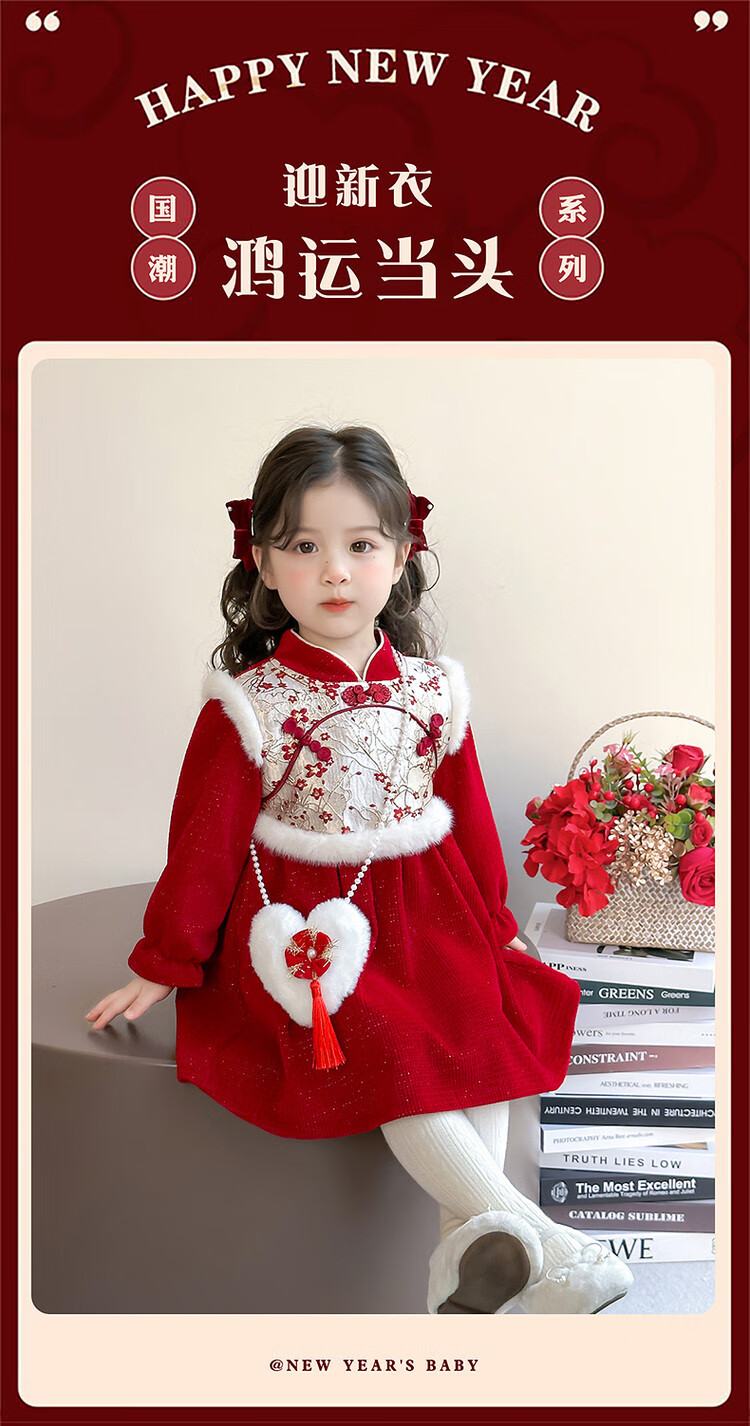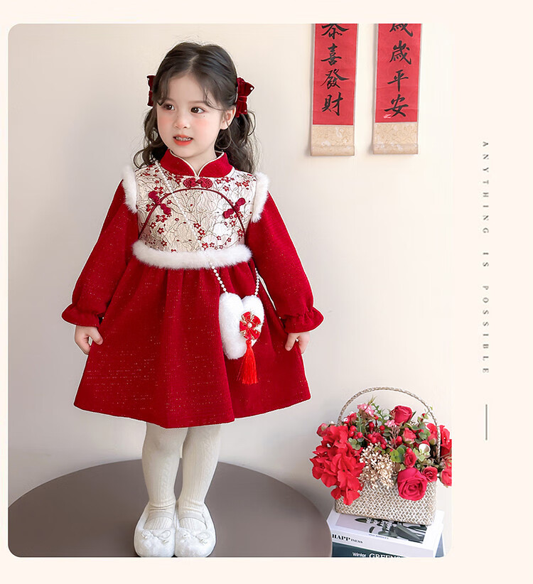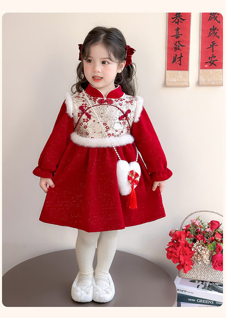 G.duck Little Yellow Duck New Year's Greetings Girls Dress Autumn and Winter Plus Velvet Children's Chinese New Year Hanfu Skirt Chinese Style Winter Princess Dress Red Free Pack 120 Recommended 110-120cm5-6 years old