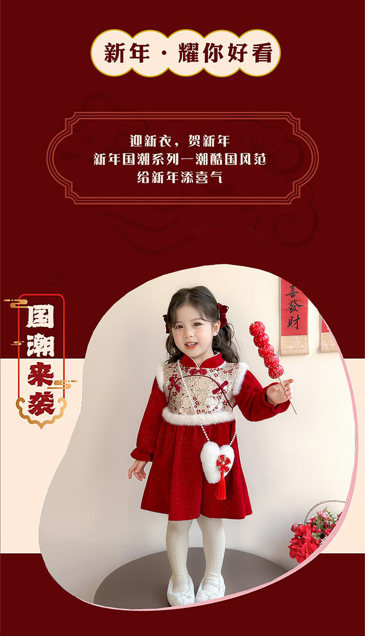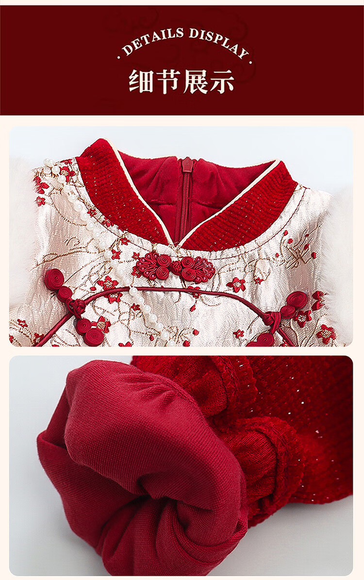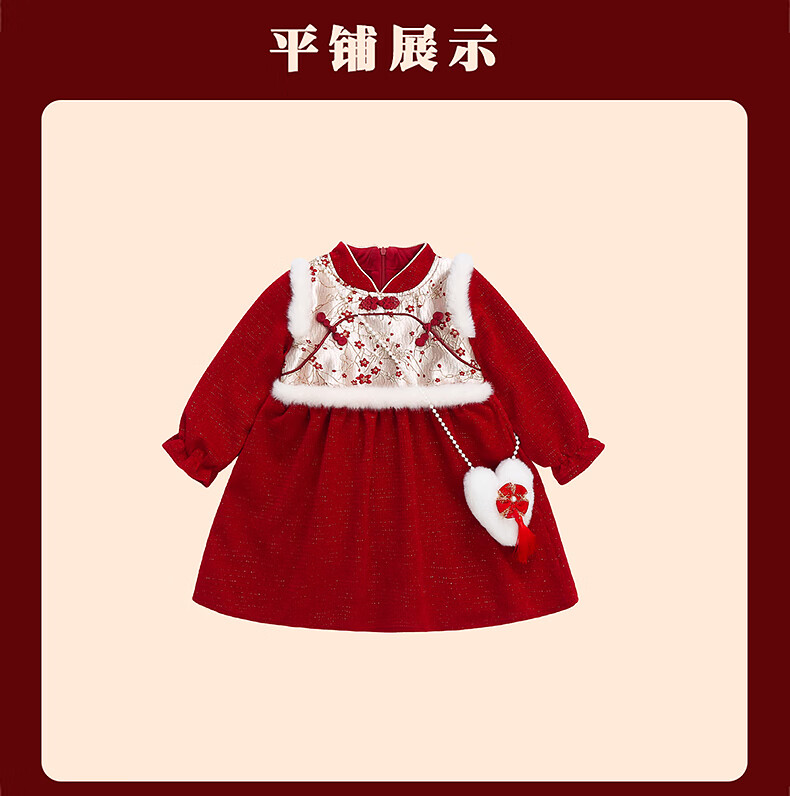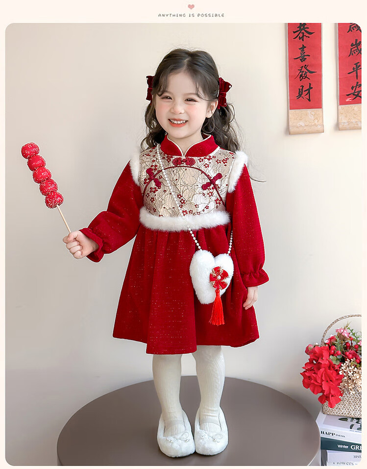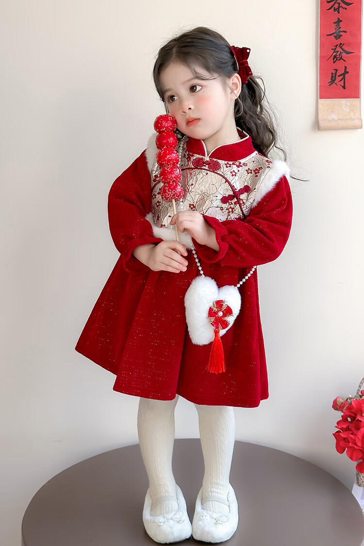 G.duck Little Yellow Duck New Year's Greetings Girls Dress Autumn and Winter Plus Velvet Children's Chinese New Year Hanfu Skirt Chinese Style Winter Princess Dress Red Free Pack 120 Recommended 110-120cm5-6 years old