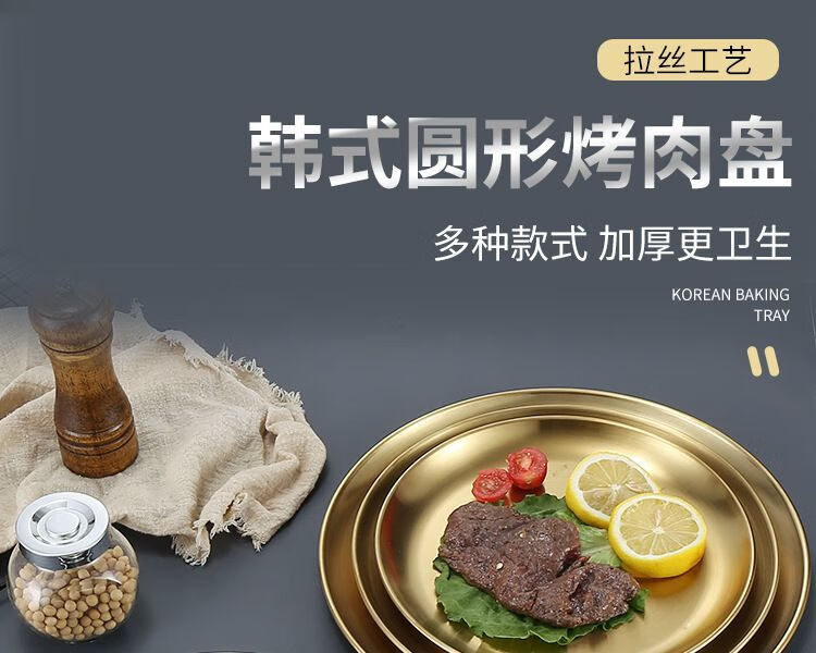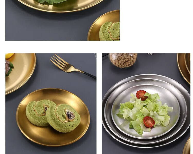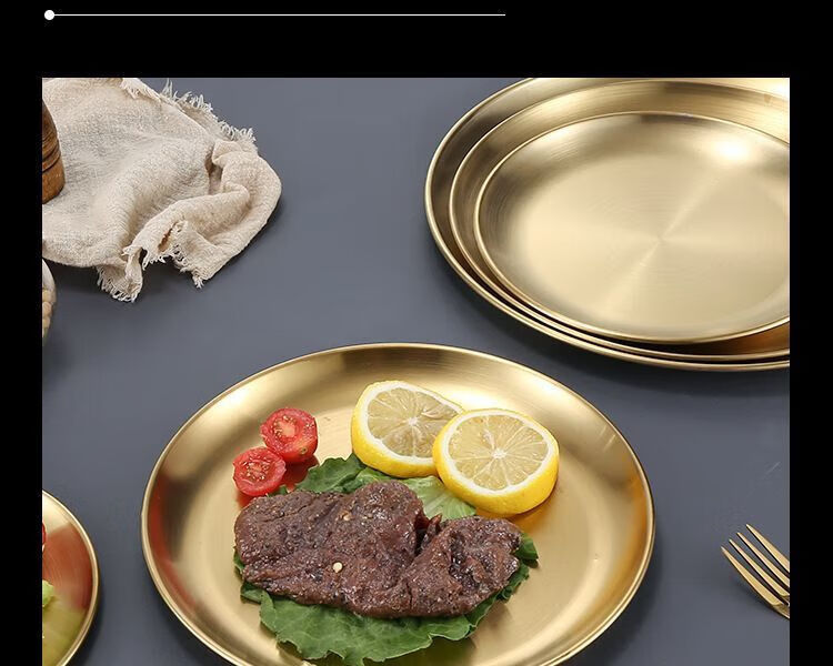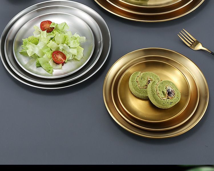 Qinkai Korean stainless steel round plate commercial golden barbecue plate tray fruit cake plate dinner plate bone plate shallow plate stainless steel natural color 14CM 5 pieces