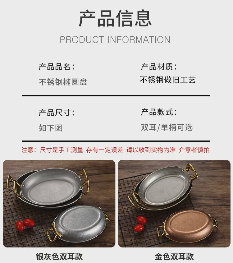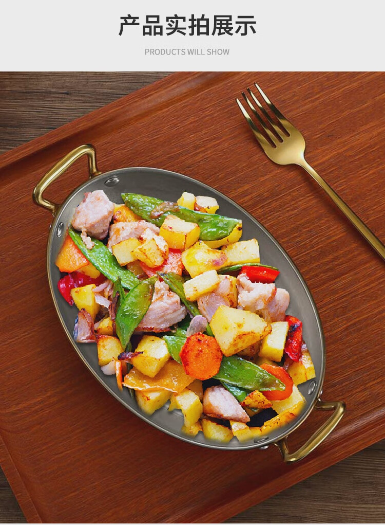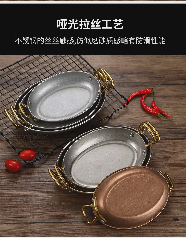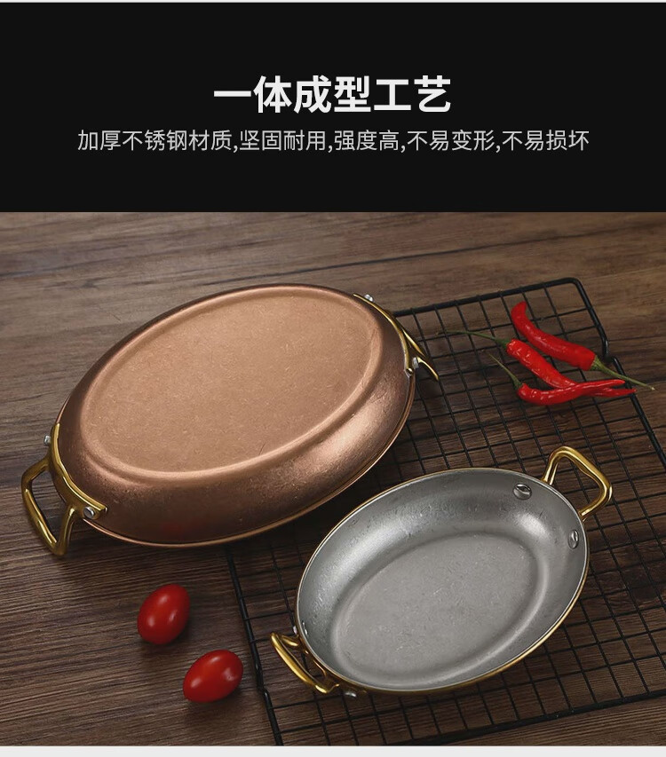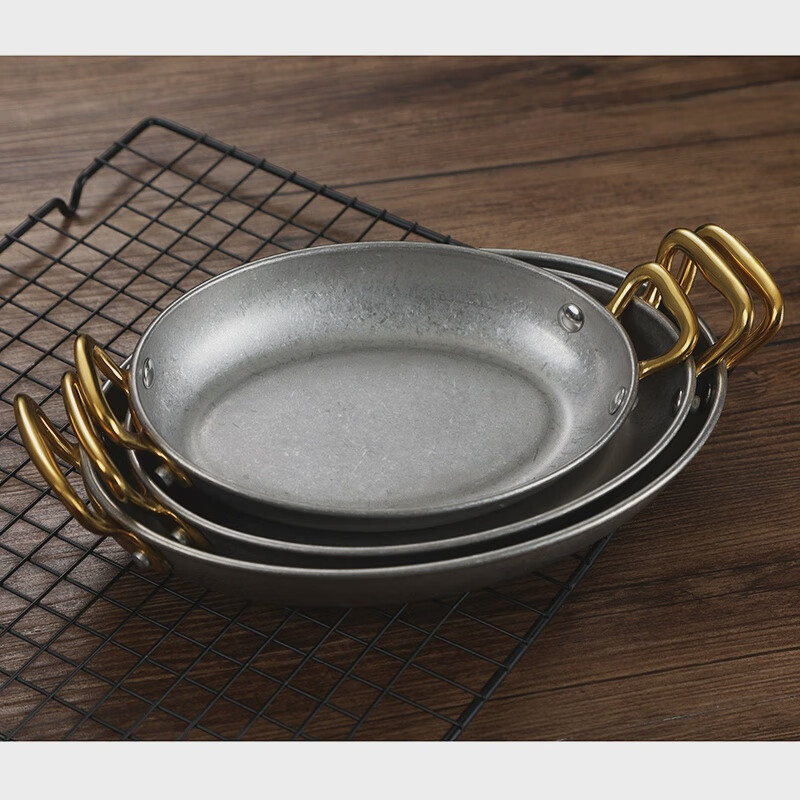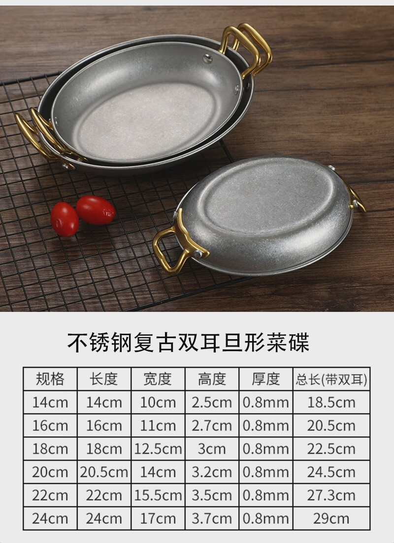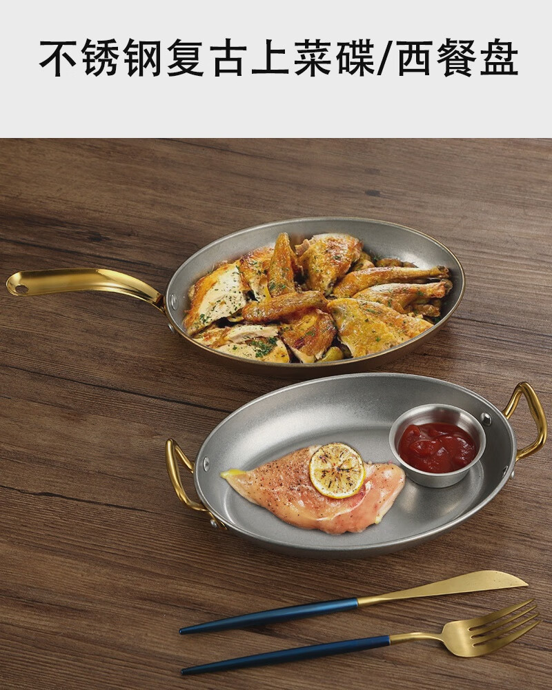 Fantasy Western-style food serving plate double-ear oval flat plate tray stainless steel seafood plate high-end steak retro double-ear dan-shaped gold flower plate 20.5cm