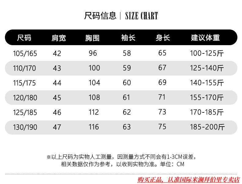 China (cm) 165 / 88-90 170 / 96-98 175 / 108-110 180 / 118-122 185 / 126-130