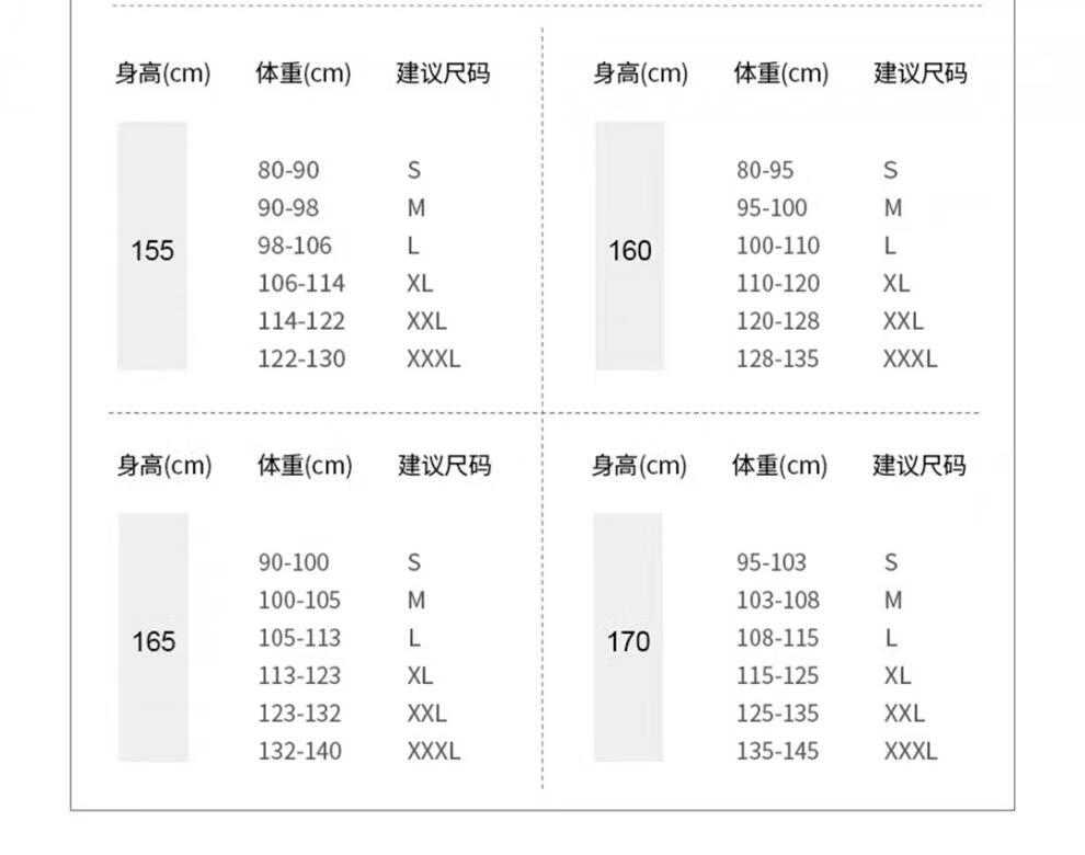 China (cm) 165 / 88-90 170 / 96-98 175 / 108-110 180 / 118-122 185 / 126-130