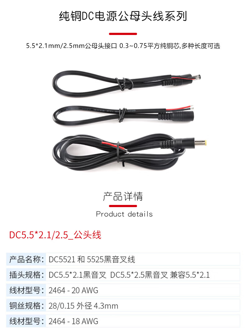 DC power connection cable DC5.5*2.1 female male cable connector cable 18AWG/0.75 square DC5.5*2.1_male cable_0.75 square_30 cm No Specifications
