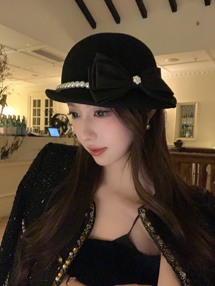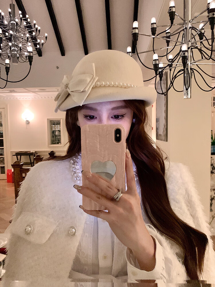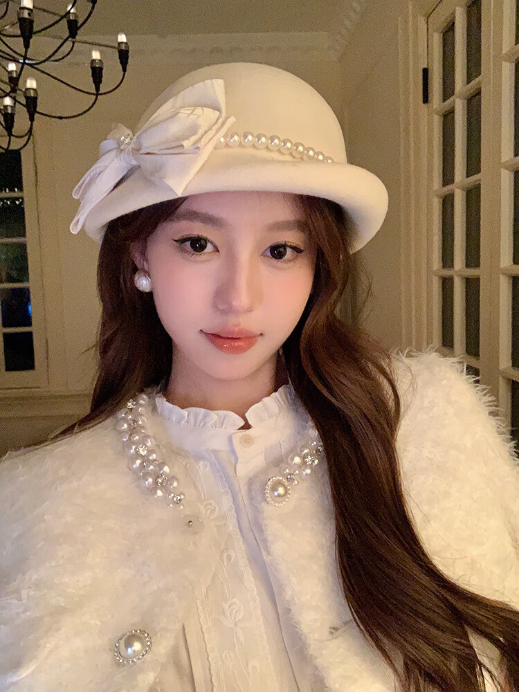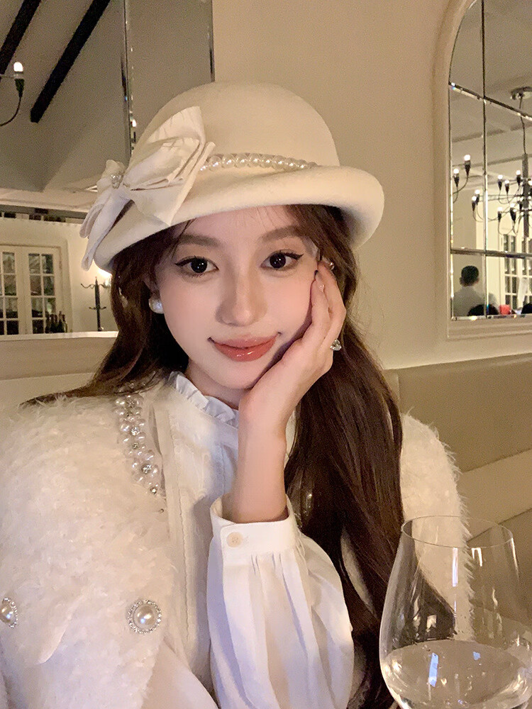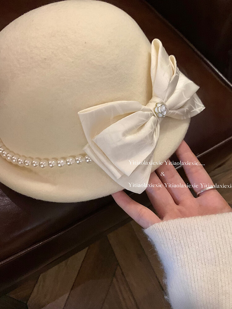 Thousands of gold, white and beautiful Australian wool hat French Hepburn style pearl bow woolen beret white Australian wool S (54-56cm