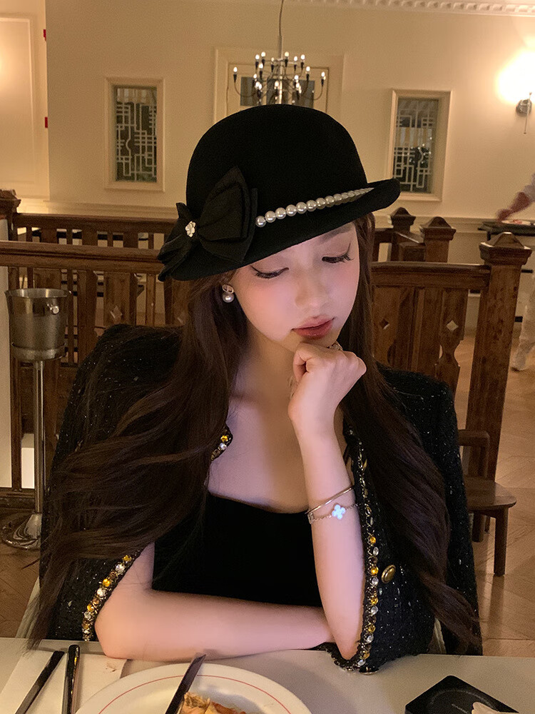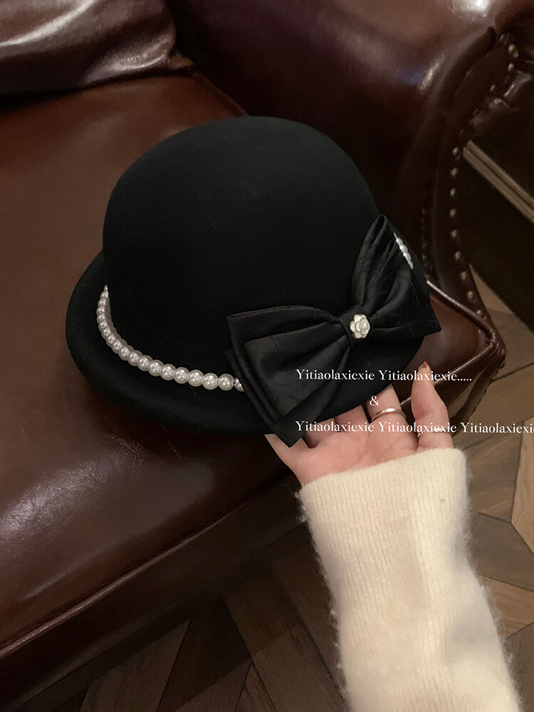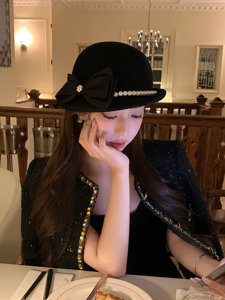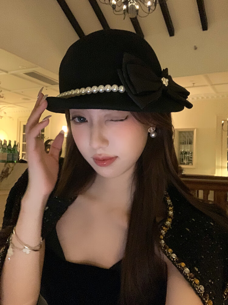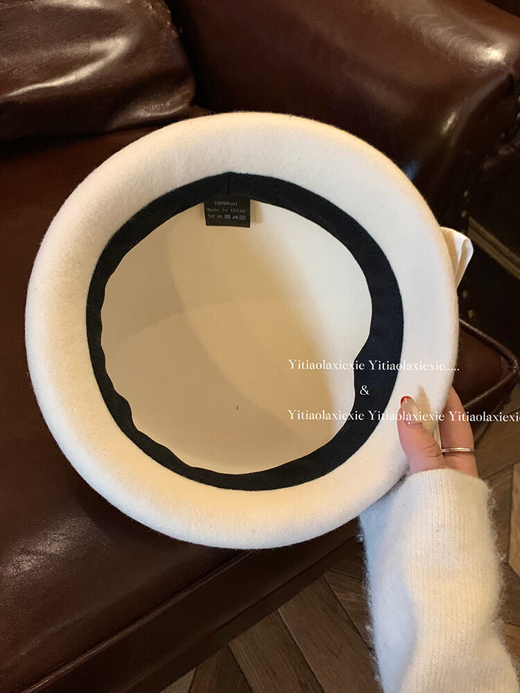 Thousands of gold, white and beautiful Australian wool hat French Hepburn style pearl bow woolen beret white Australian wool S (54-56cm