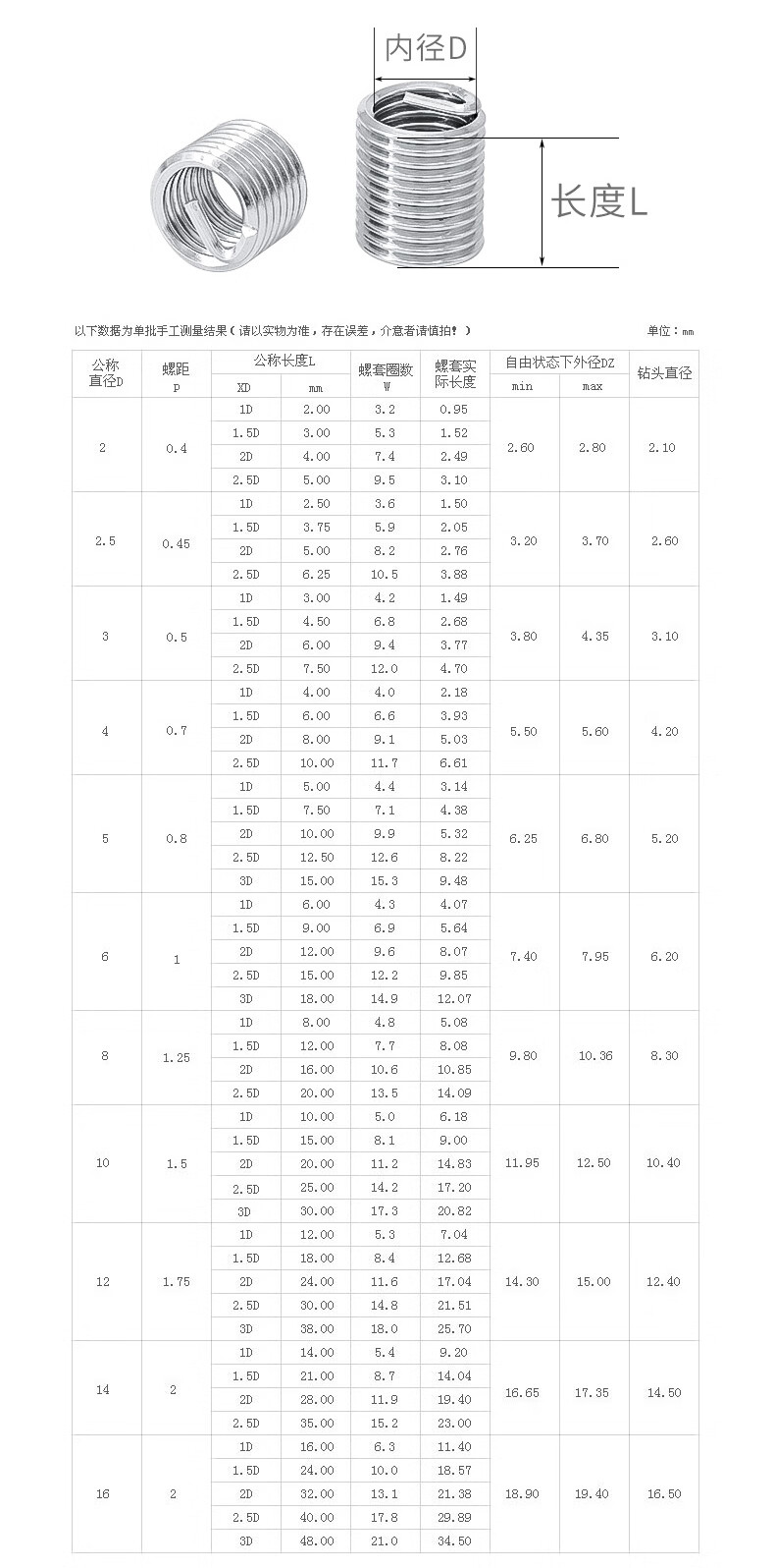 RSRDDY Chengdejing 304 stainless steel threaded sleeve steel wire threaded sleeve threaded brace protective sleeve screw M216 set steel sleeve M2*0 points 4*1D10 grains 2mm