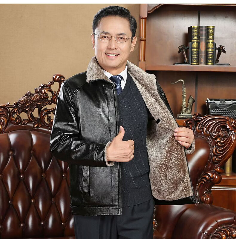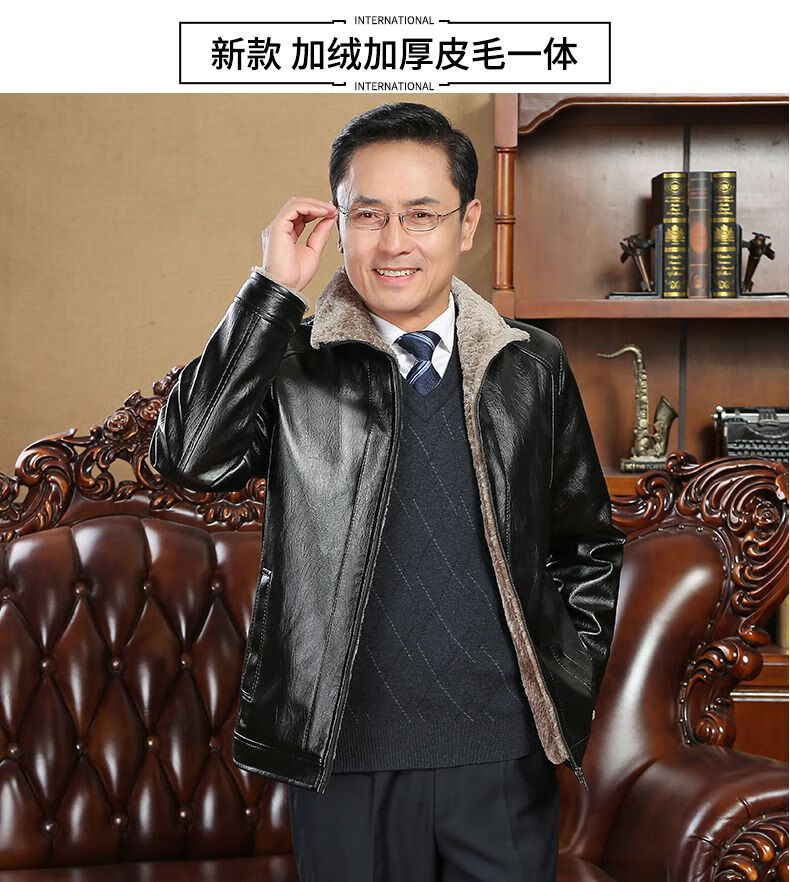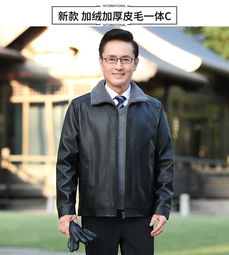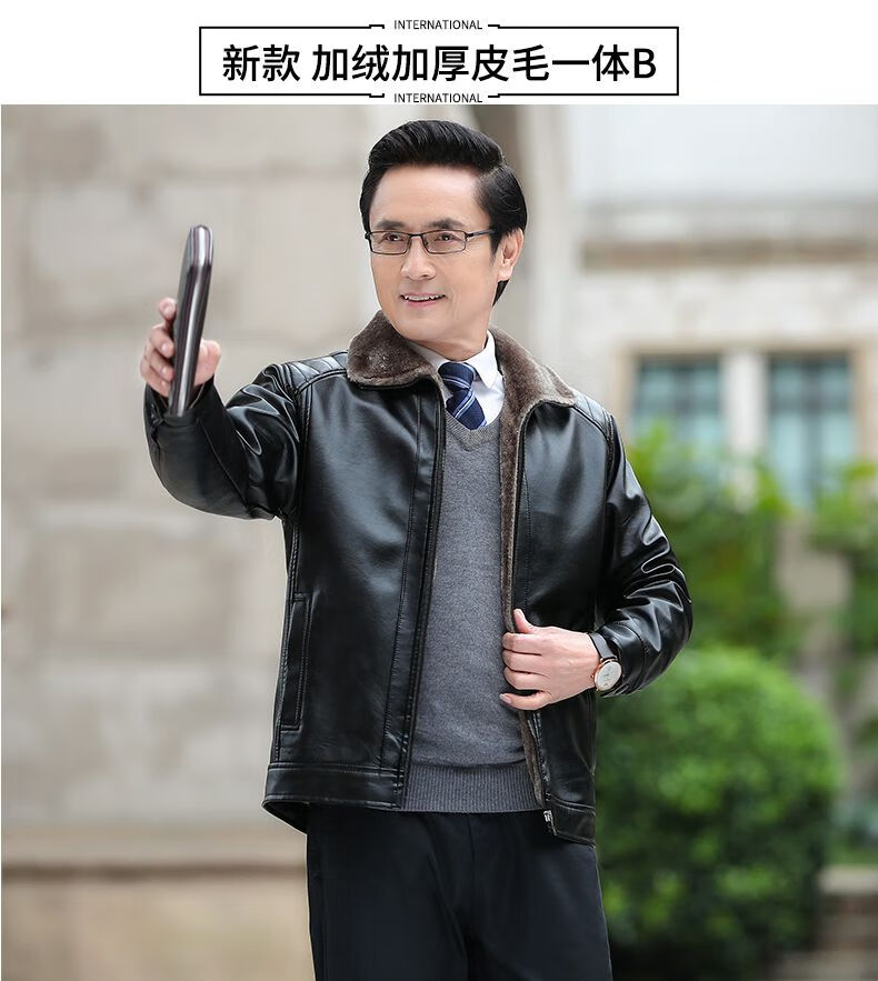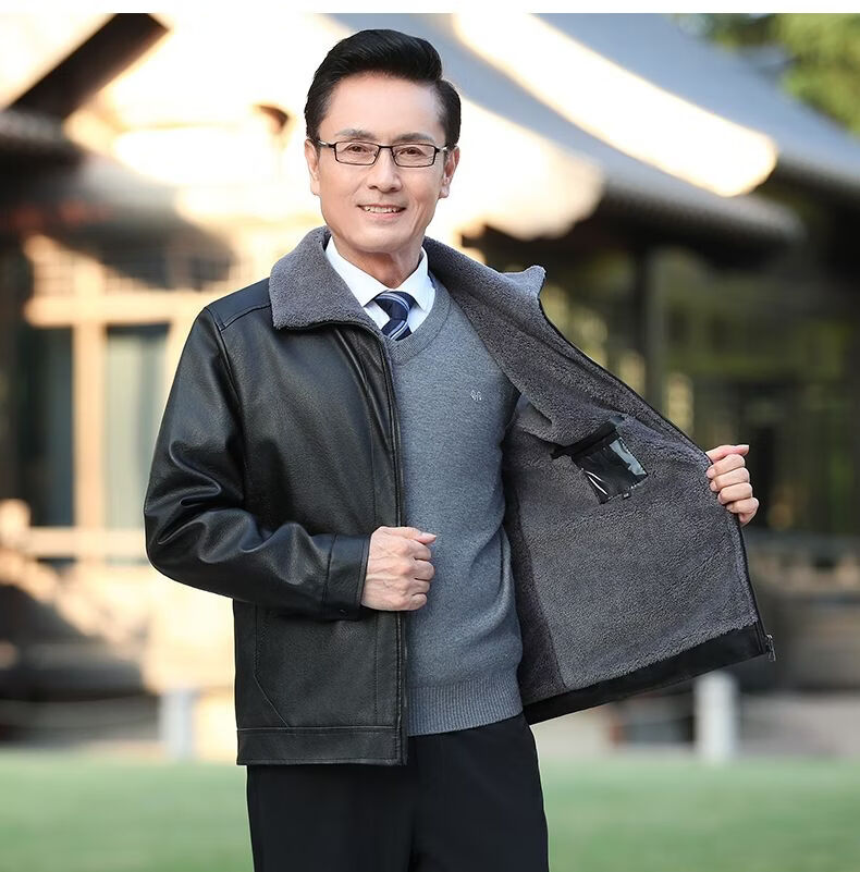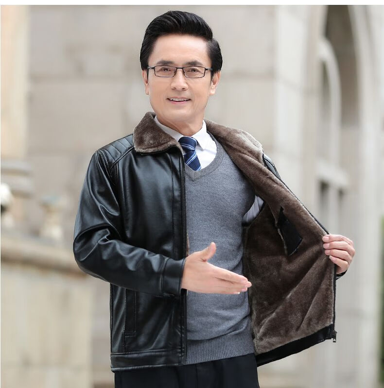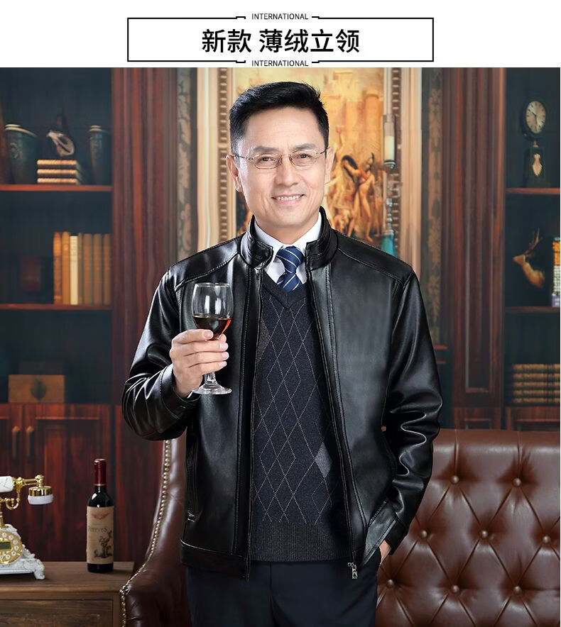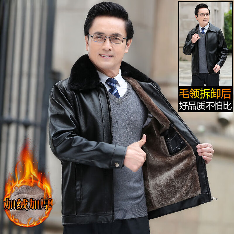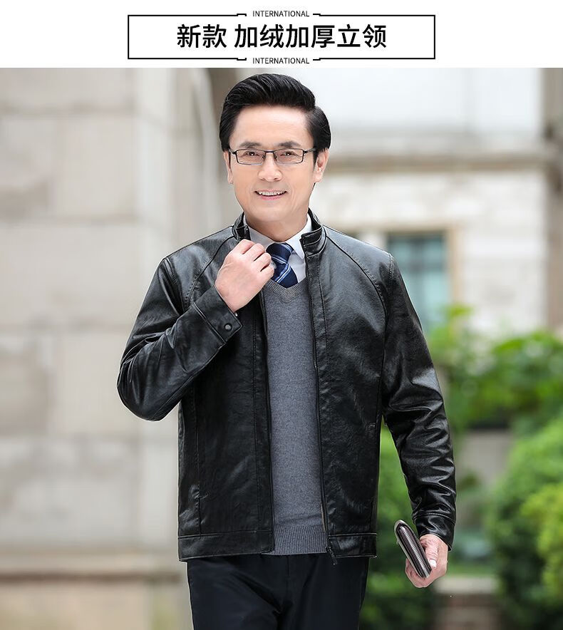Playboy middle-aged men's leather jacket plus velvet thickened men's casual leather jacket loose large size PU leather jacket middle-aged and elderly dad's outfit black L 175/54 size 130-150Jin Jin equals 0.5 kg