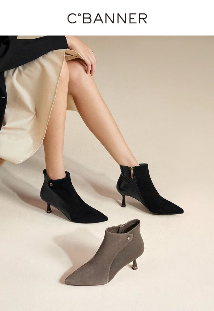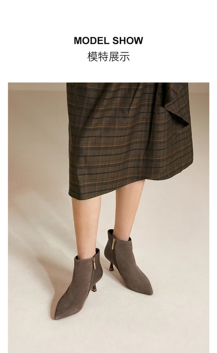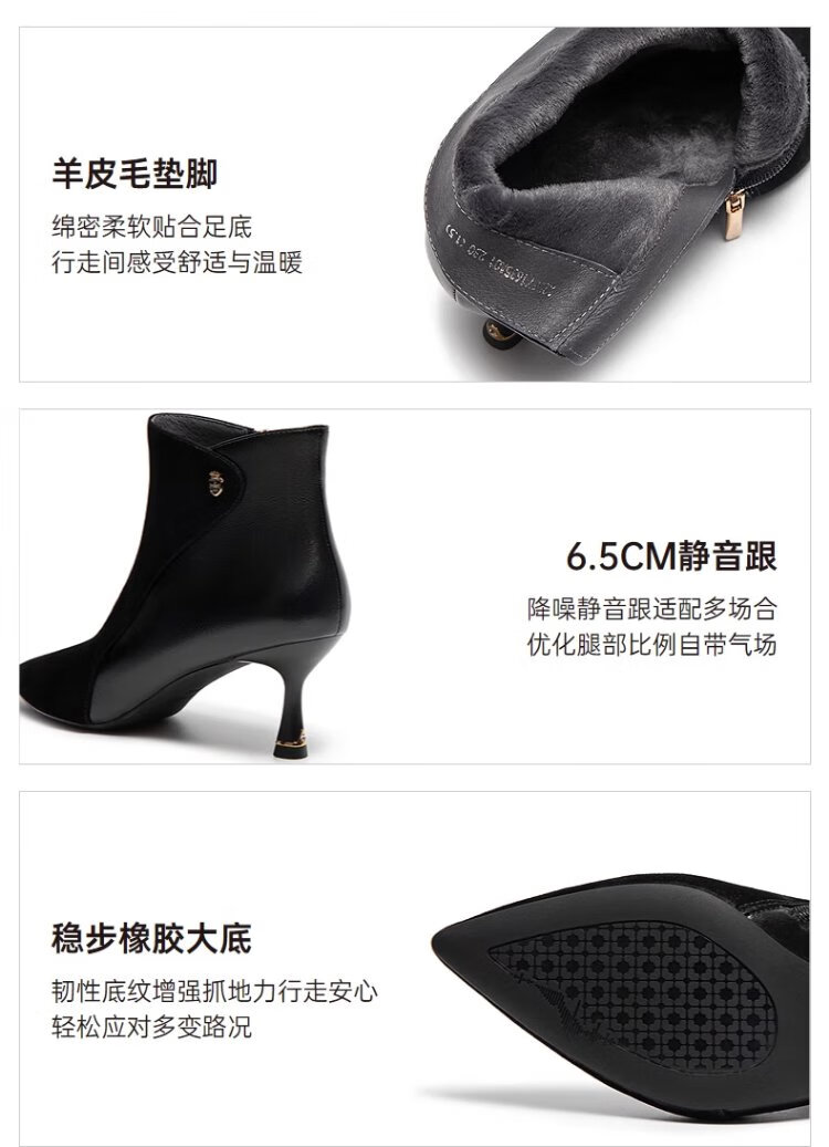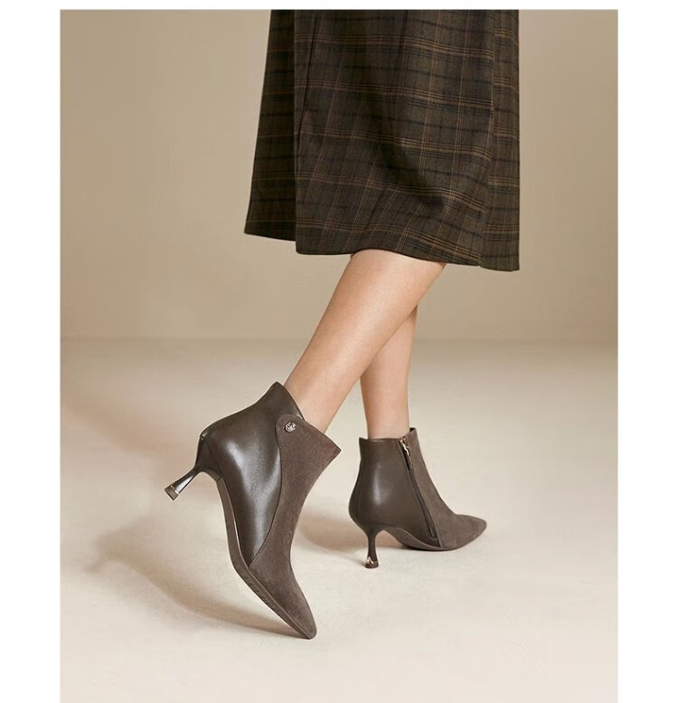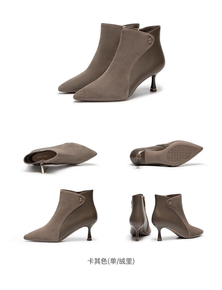 Qianbaidu Silent Series 2025 Winter Shopping Mall Same Style Ankle Boots Pointed Toe High Heel Sheepskin Short Boots for Women A25571635 A15 Khaki (velvet lining) (6.5cm) 37 (235mm)