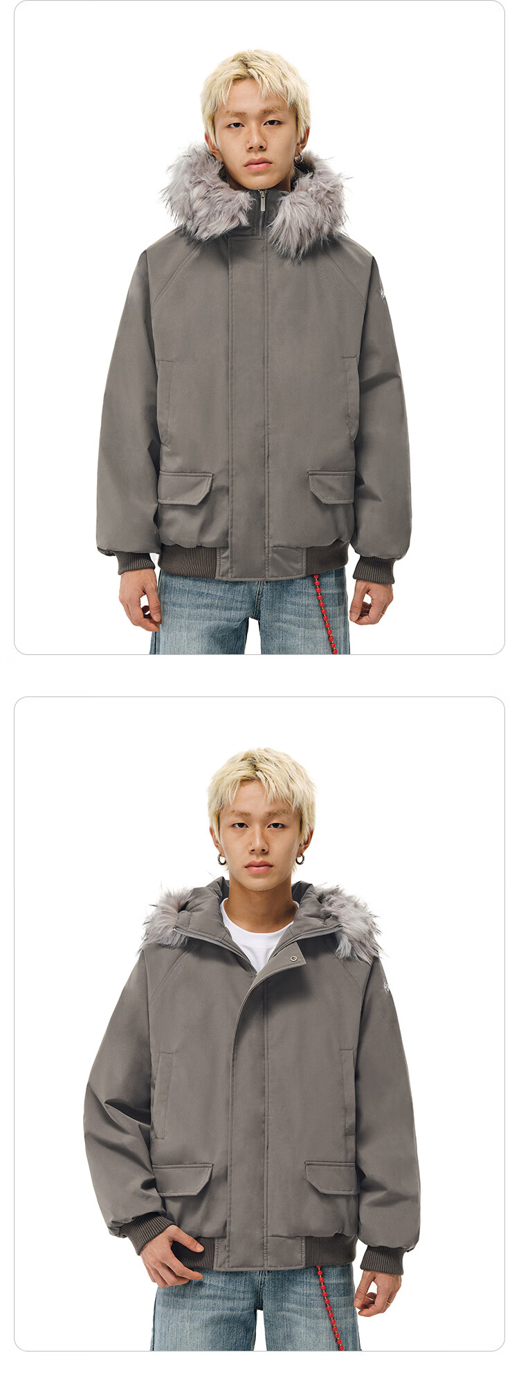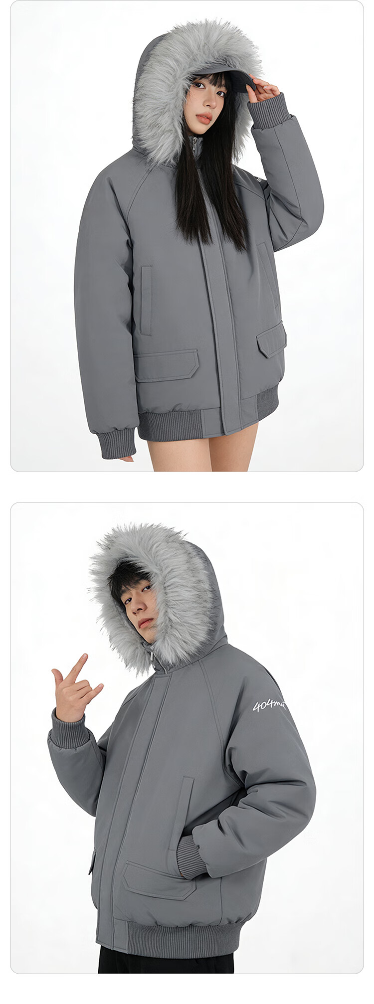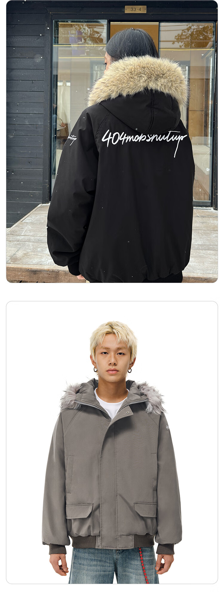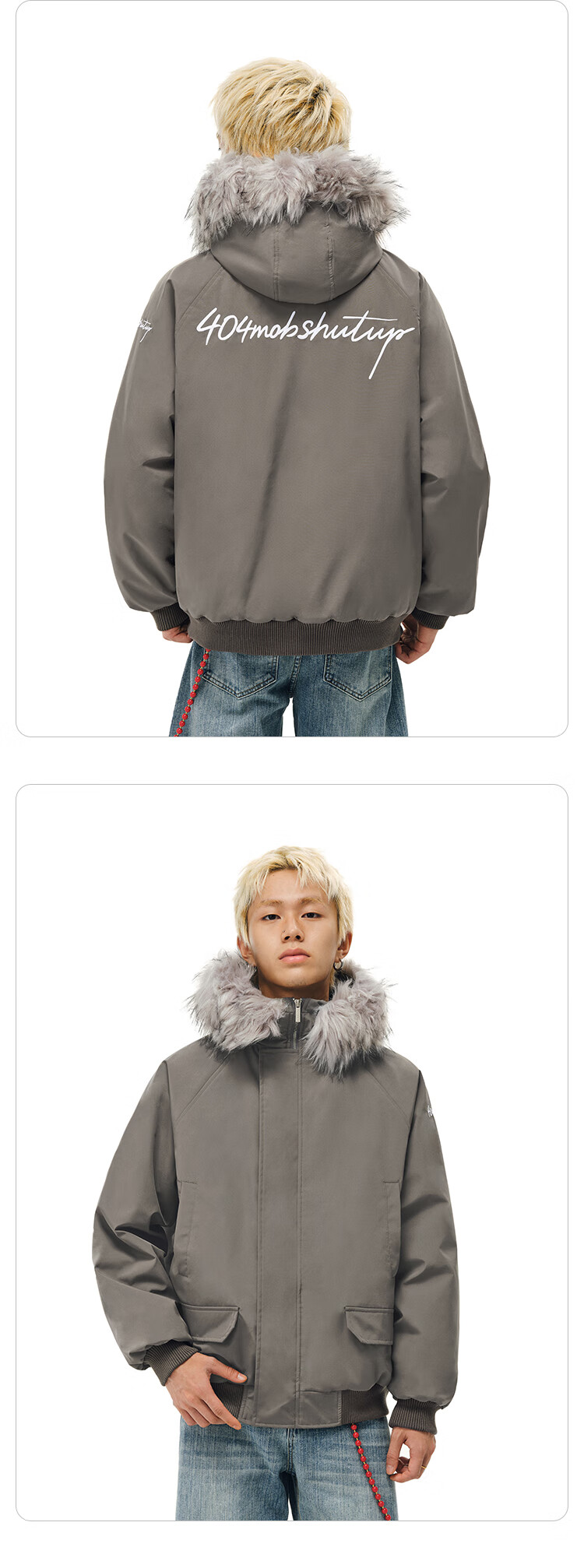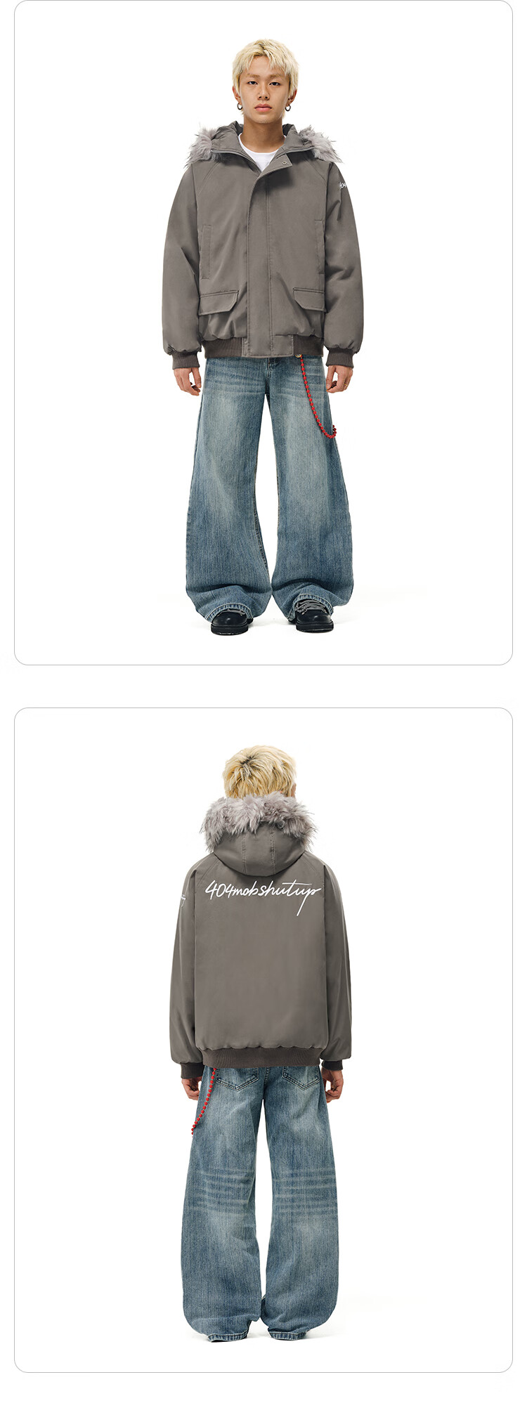 404MOBGANG American retro detachable fur collar jacket men's winter waterproof embroidery thickened warm couple cotton clothing Paris Gray L