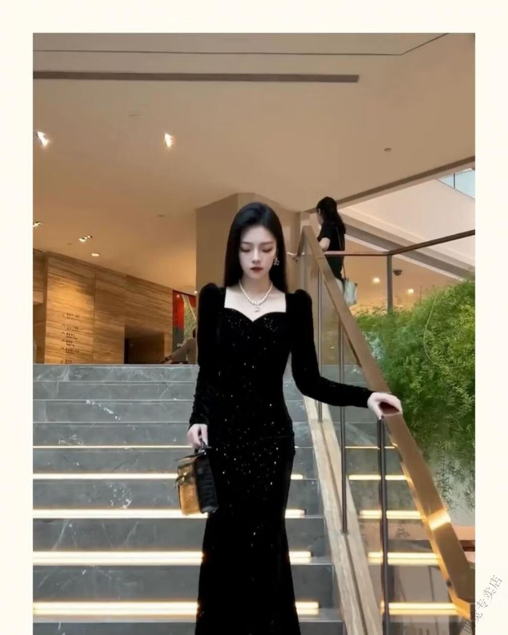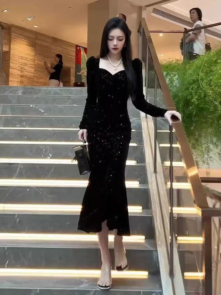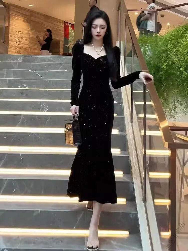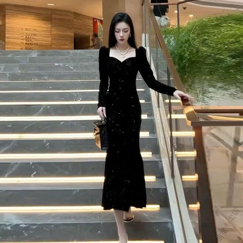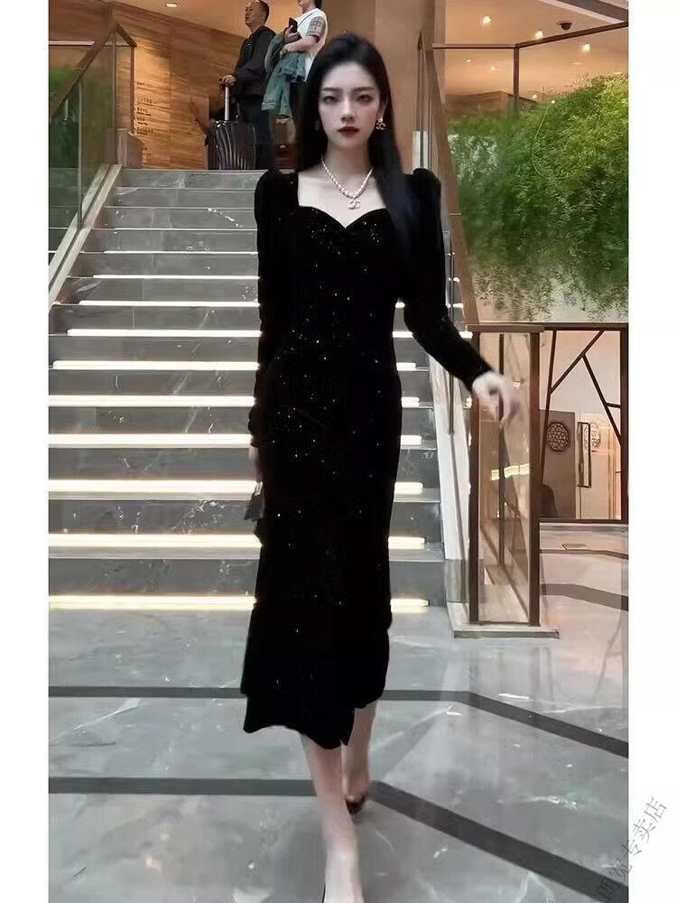 Pierre Cardin New Year's shirt Hepburn style velvet little black dress temperament slim dress long skirt French hip dress women autumn and winter black M 100-110Jin Jin is equal to 0.5 kg