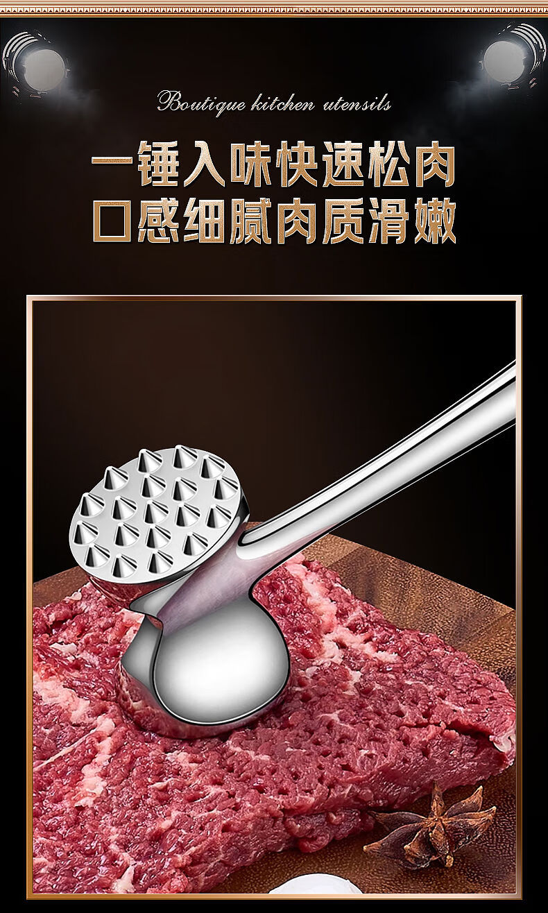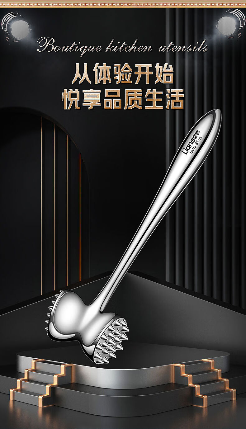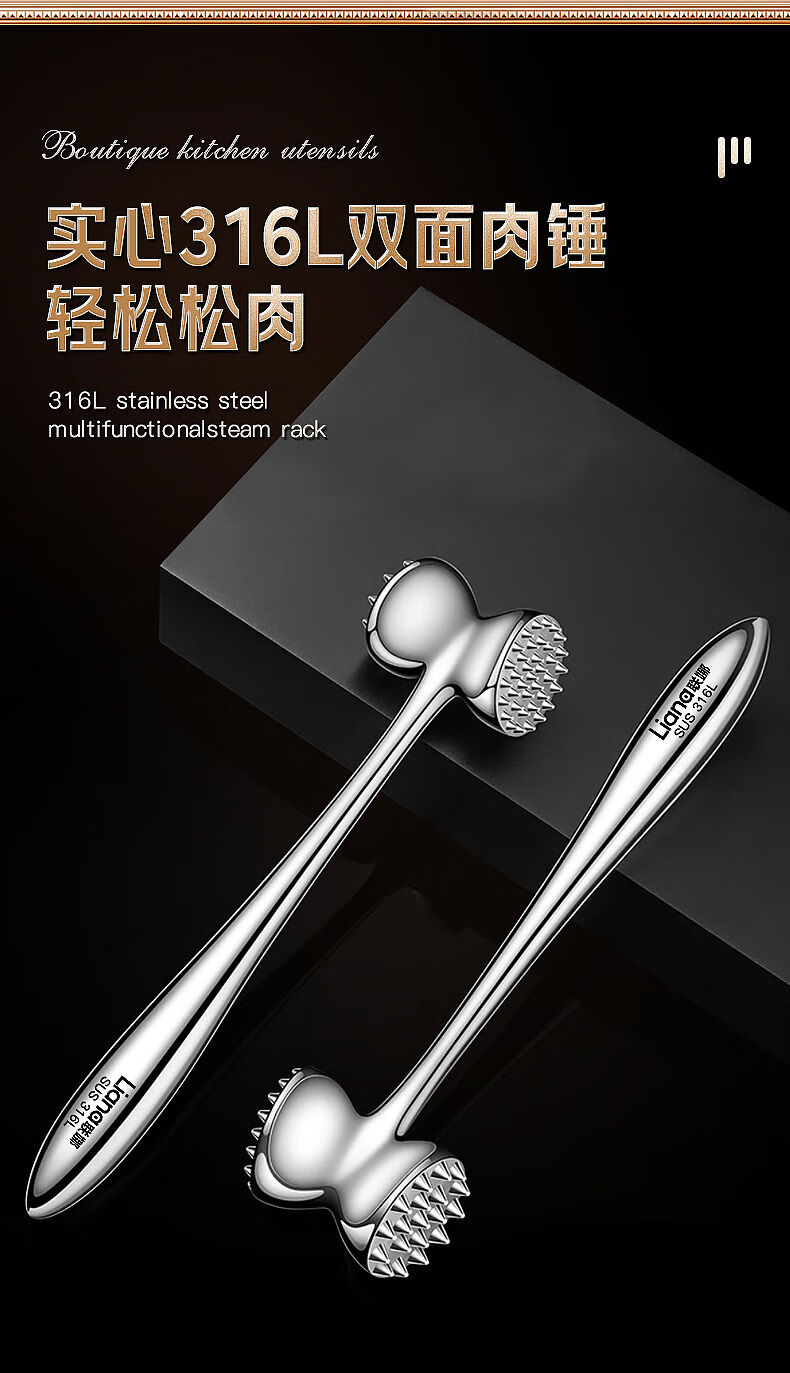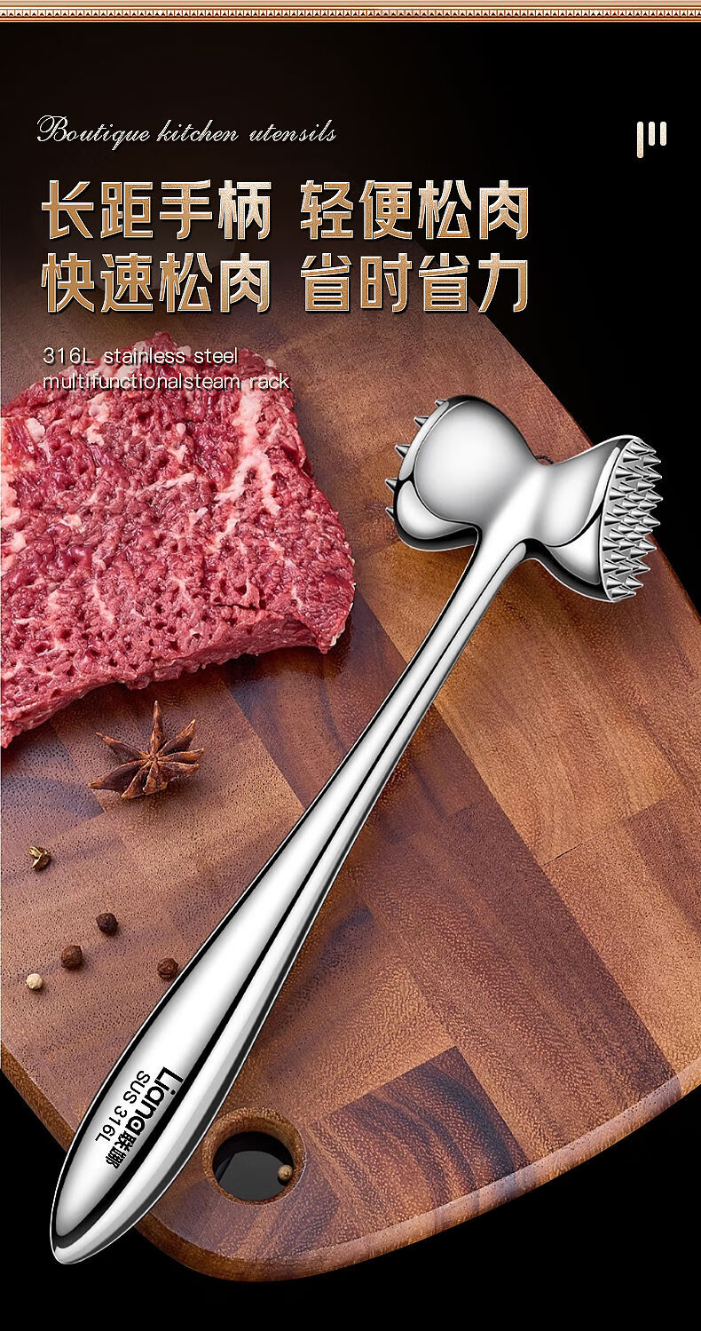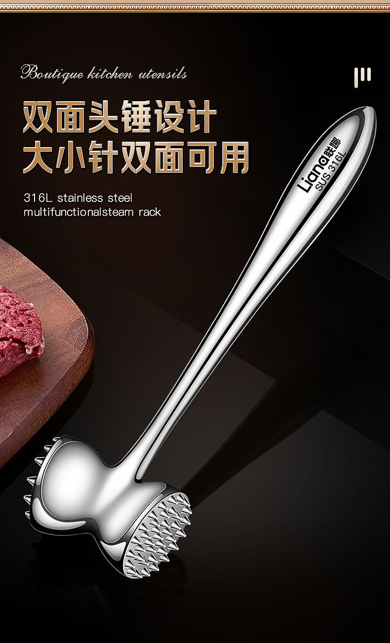 接运猫316L不锈钢松肉锤一体加厚成形捶肉器牛排专用家用松敲肉锤子 实心316L双面肉锤粗钉+细钉
