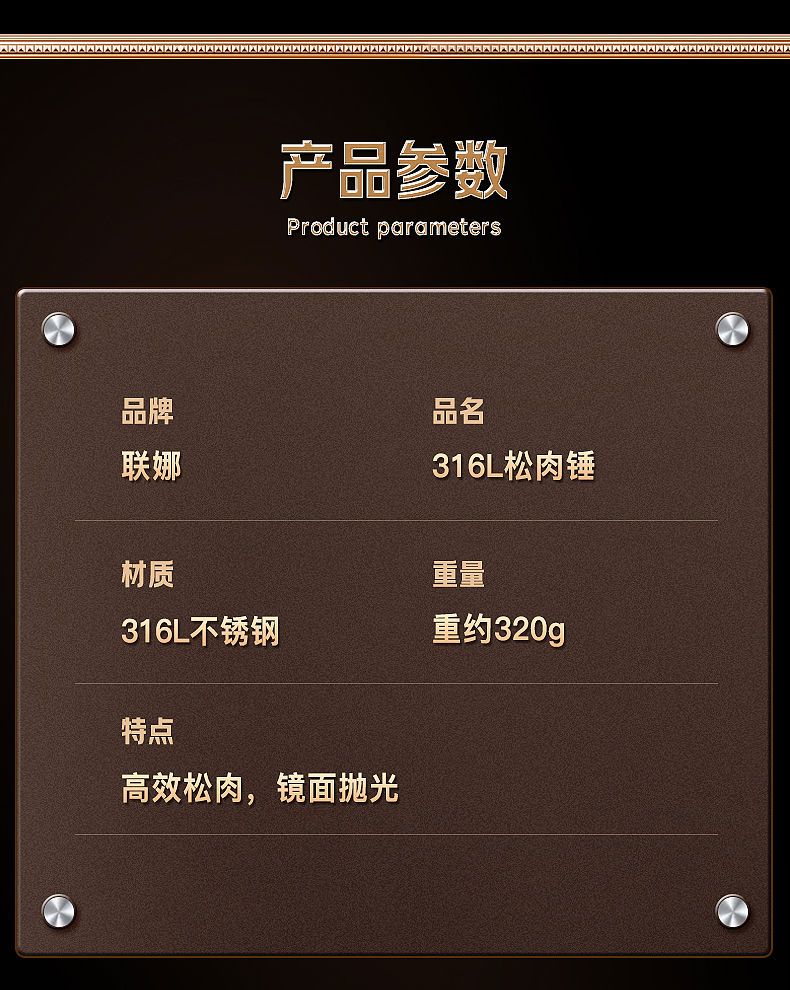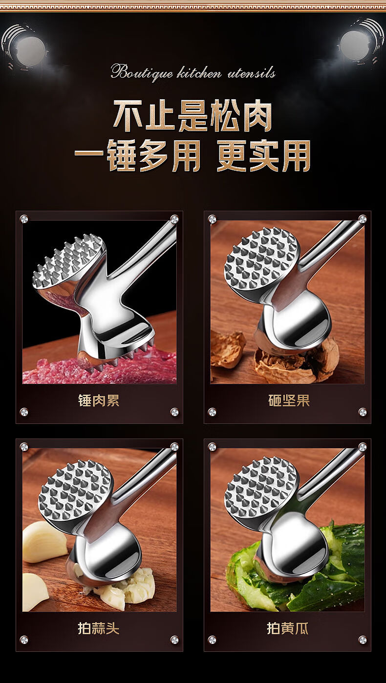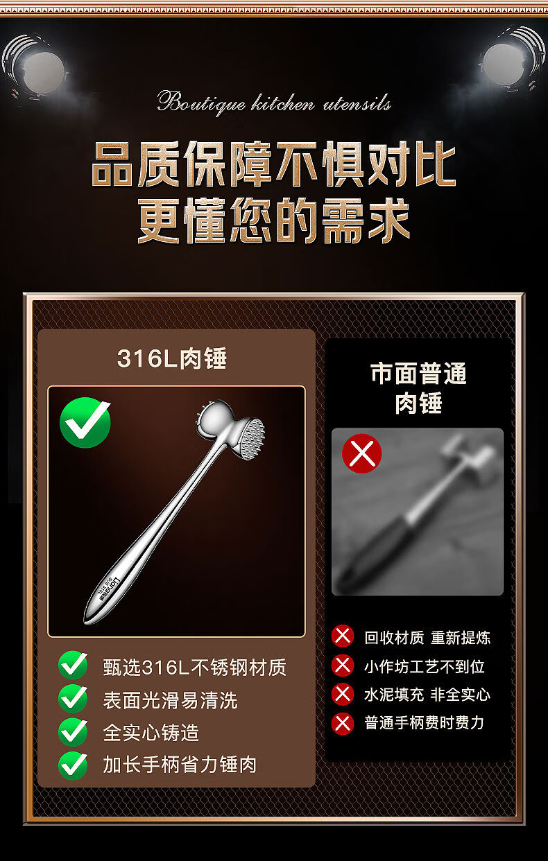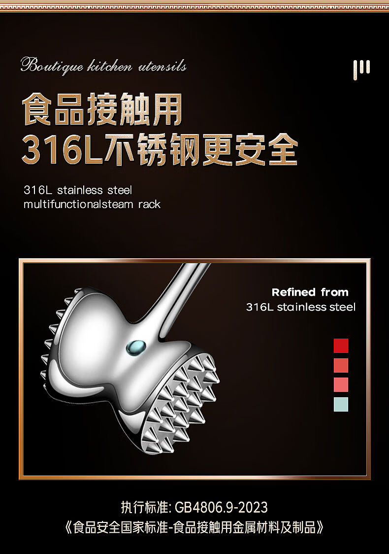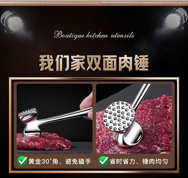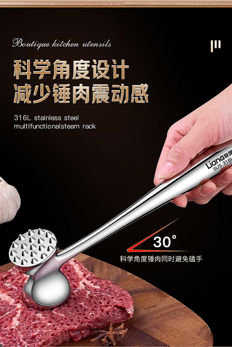接运猫316L不锈钢松肉锤一体加厚成形捶肉器牛排专用家用松敲肉锤子 实心316L双面肉锤粗钉+细钉