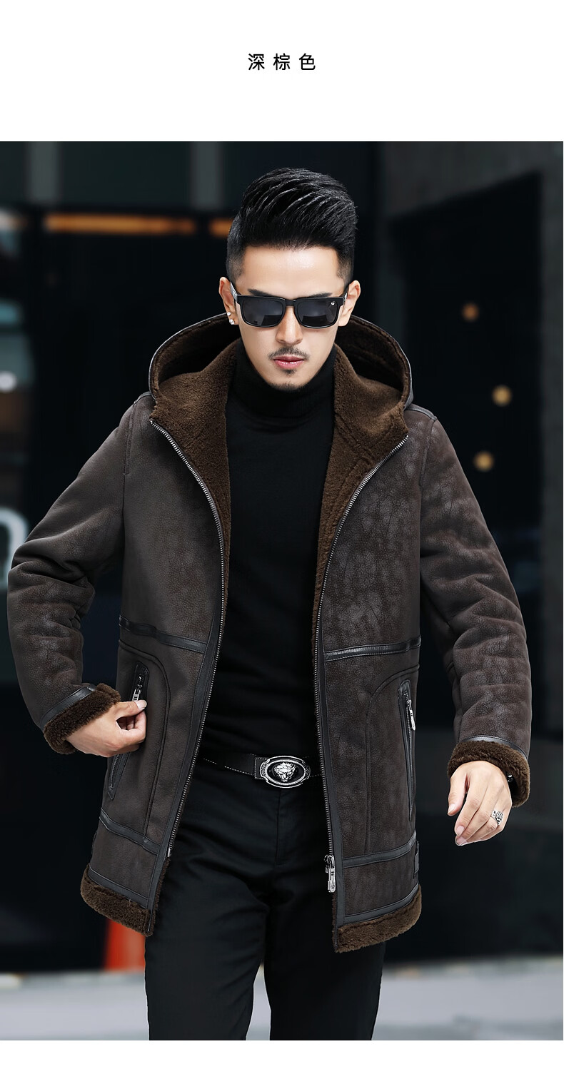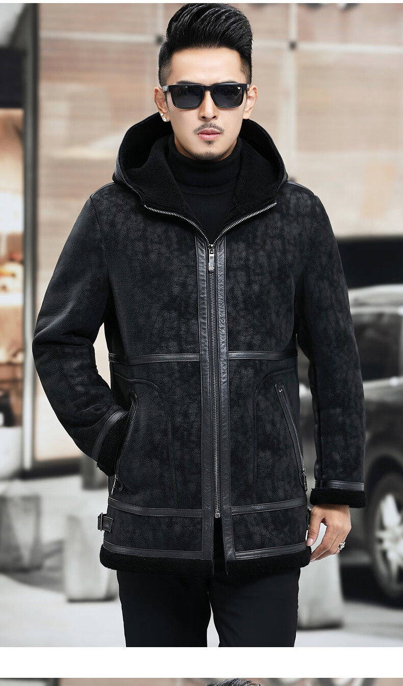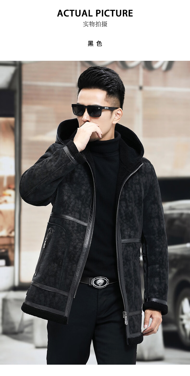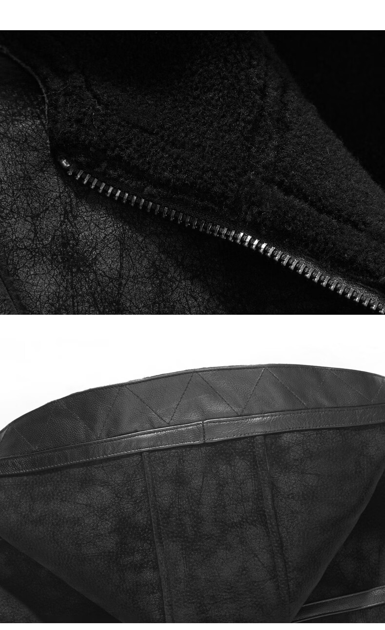 CHEVALPES international first-line brand genuine leather jacket for men, cowhide wool liner, imitation fur one-piece sheep sheared large windbreaker, black M 165