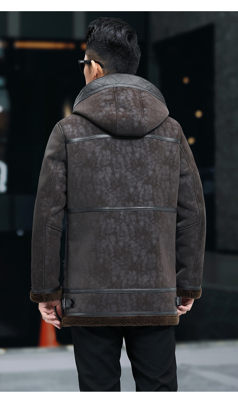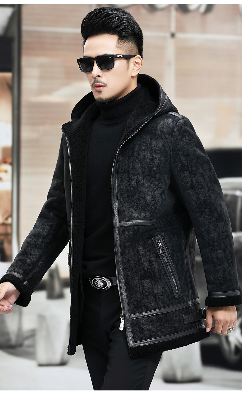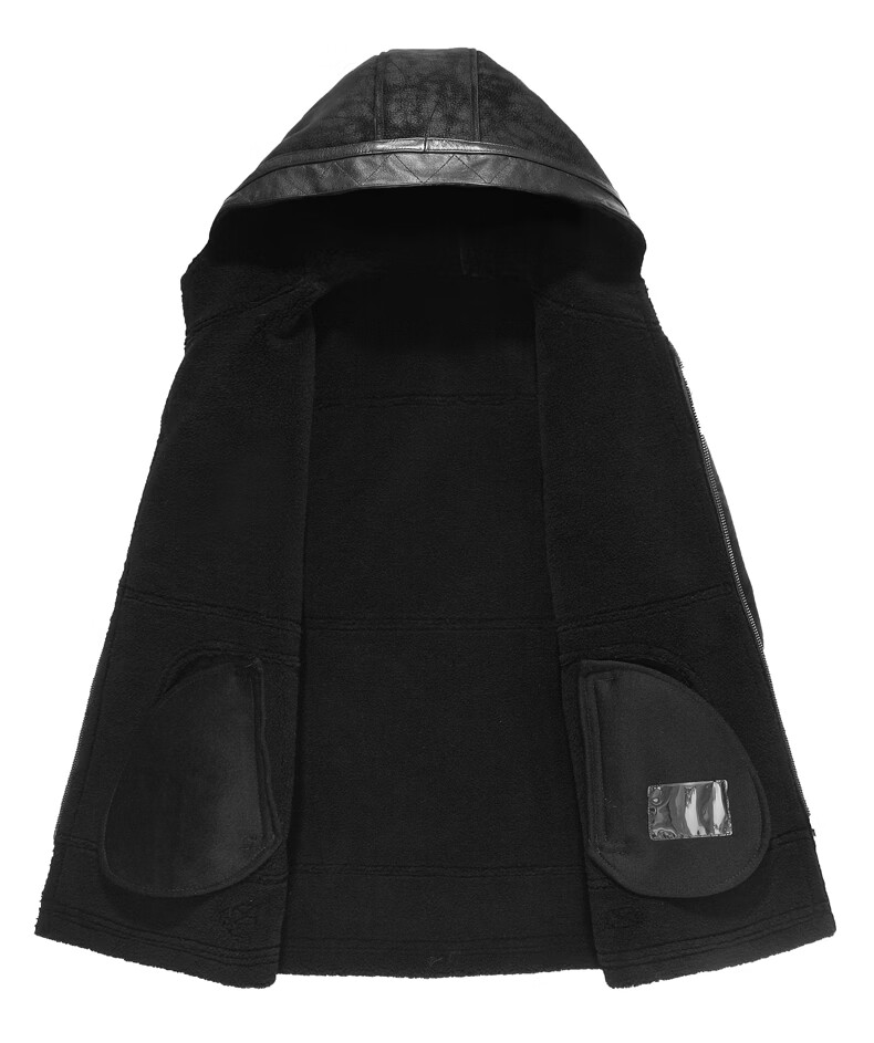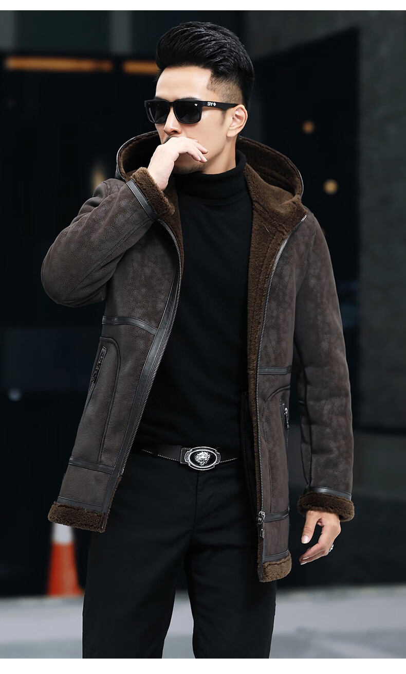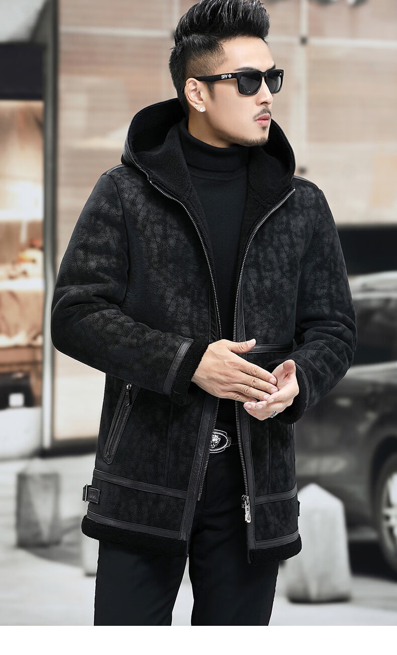 CHEVALPES international first-line brand genuine leather jacket for men, cowhide wool liner, imitation fur one-piece sheep sheared large windbreaker, black M 165
