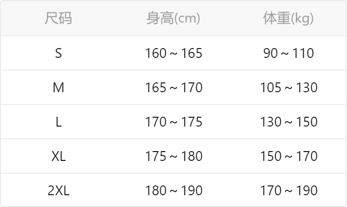 China (cm) 165 / 88-90 170 / 96-98 175 / 108-110 180 / 118-122 185 / 126-130