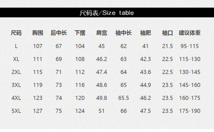 China (cm) 165 / 88-90 170 / 96-98 175 / 108-110 180 / 118-122 185 / 126-130