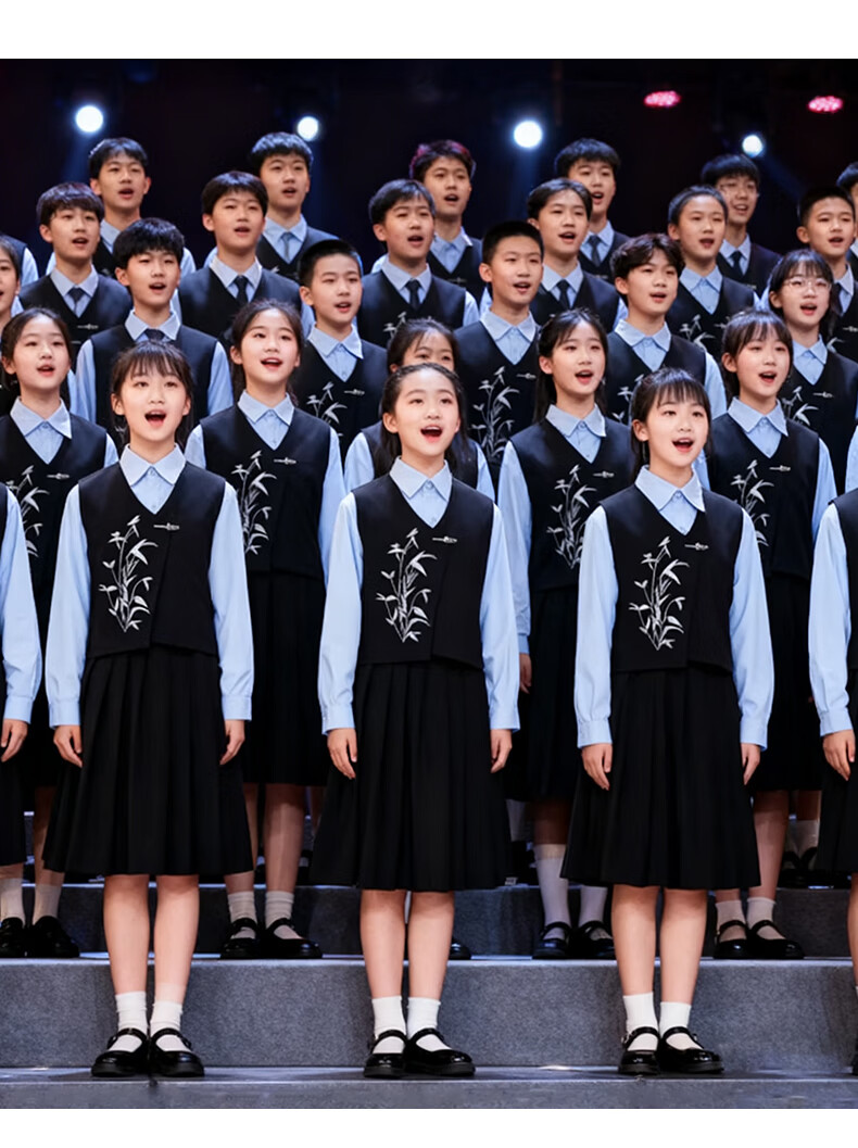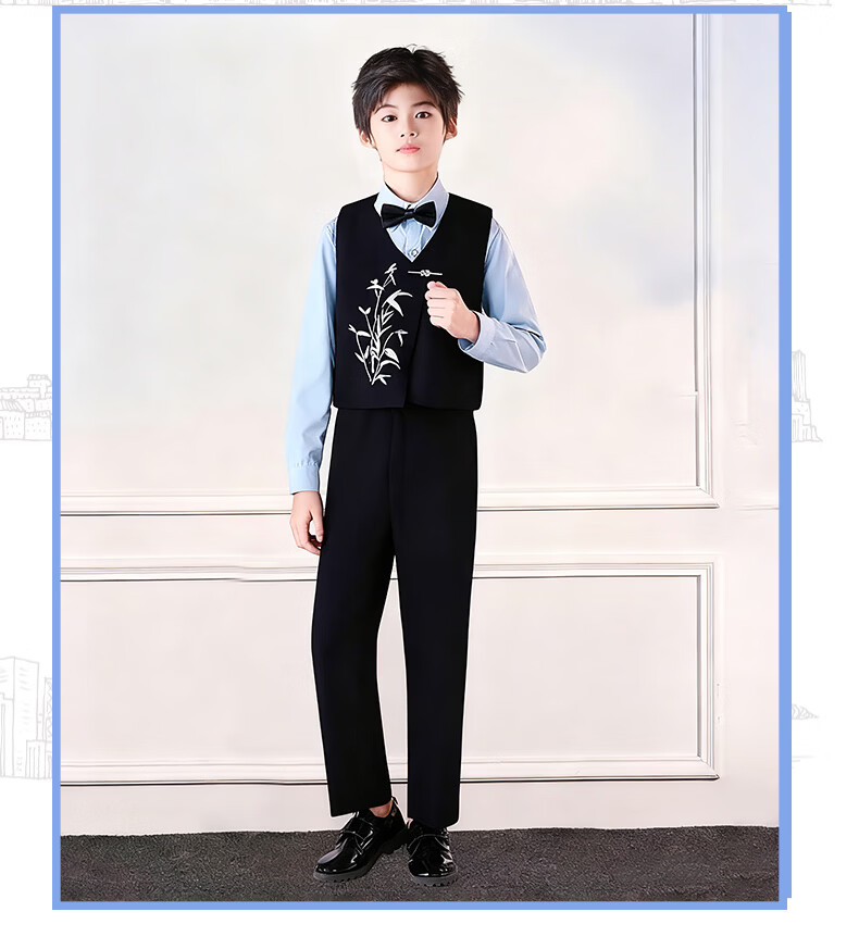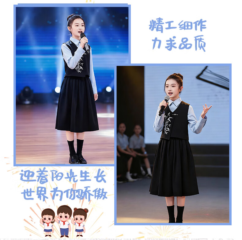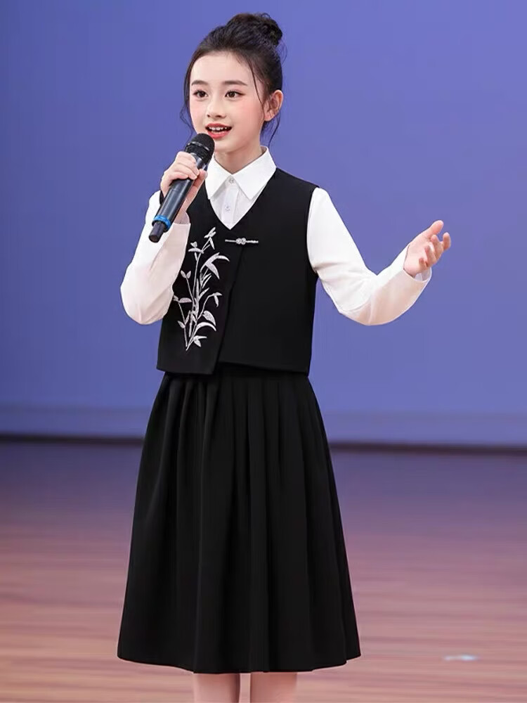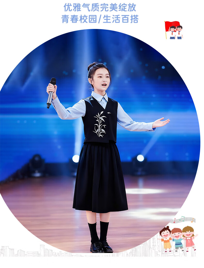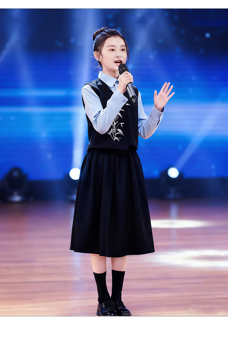 Huanshuai New Year's Day children's chorus performance costumes, primary school students' recitation and speech contest performance costumes, men's and women's Chinese style hosting ceremony, girls, long-sleeved blue shirt + vest + skirt + socks 120 cm