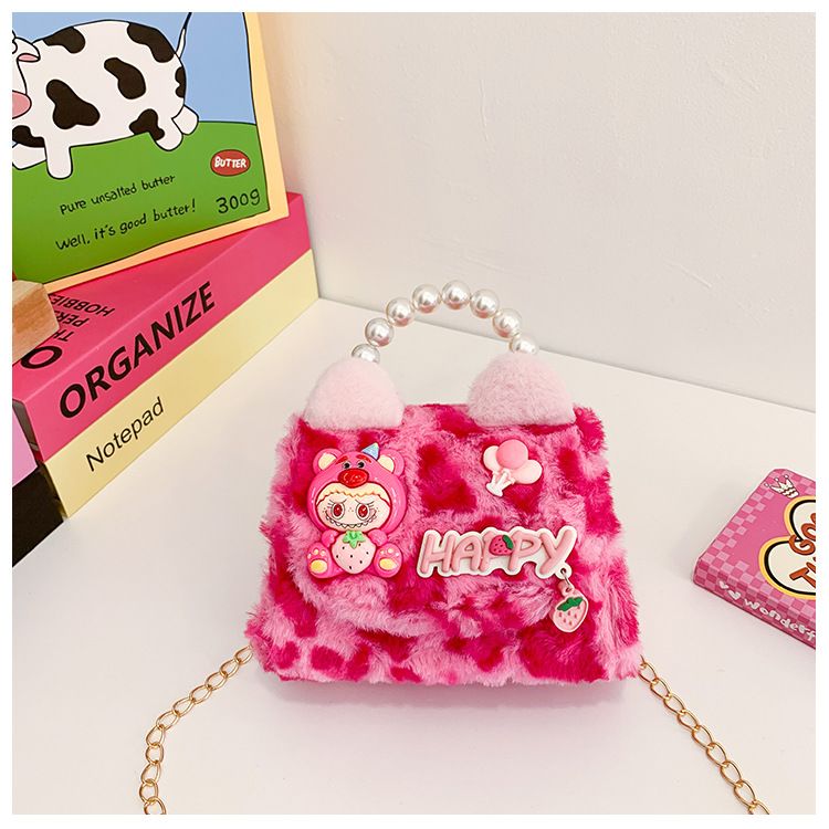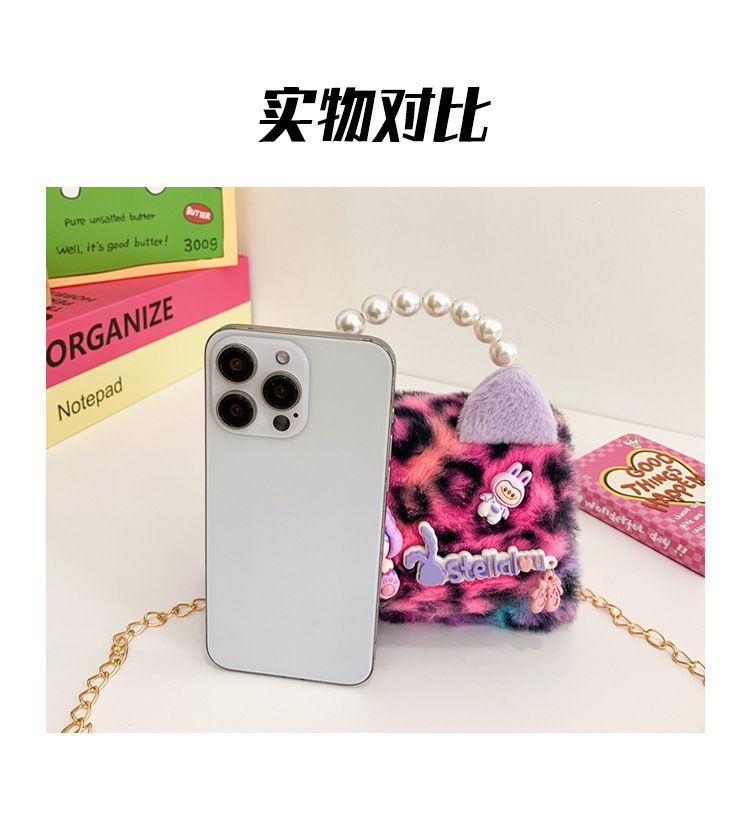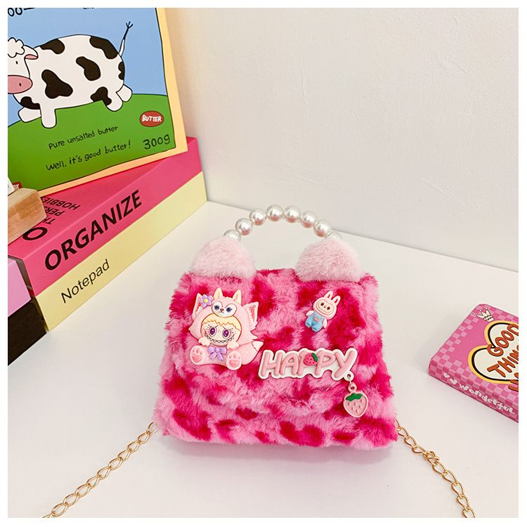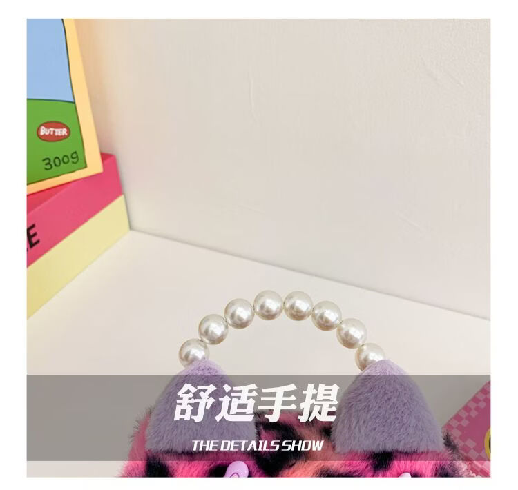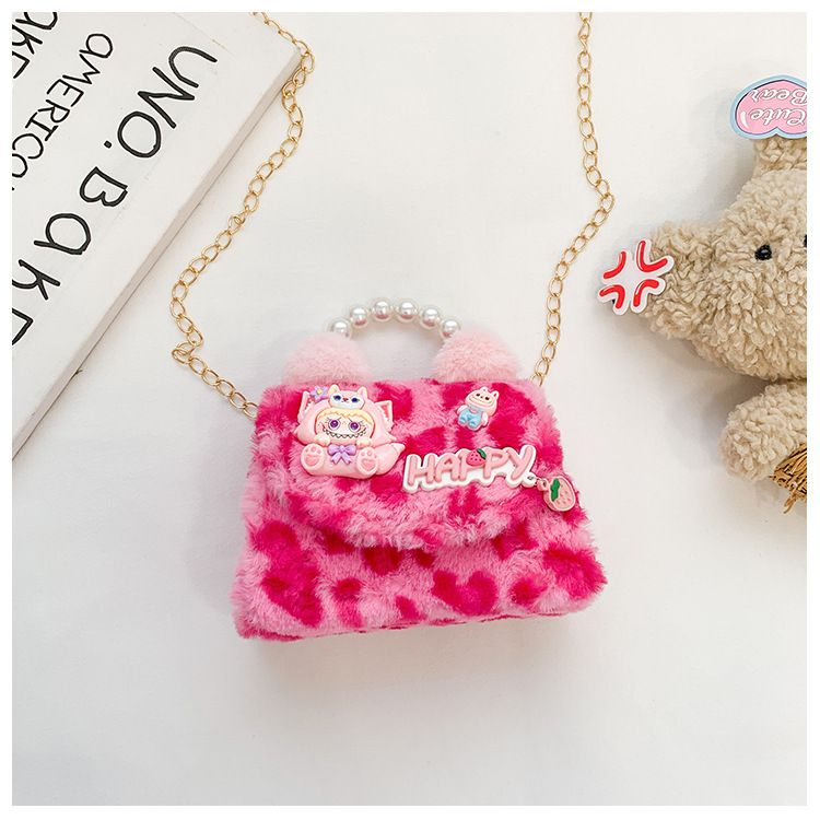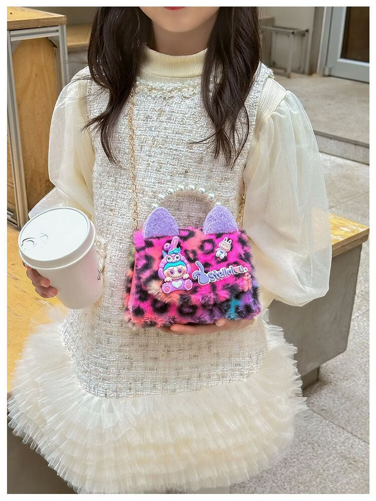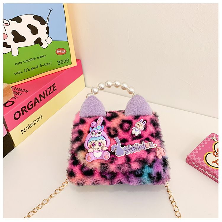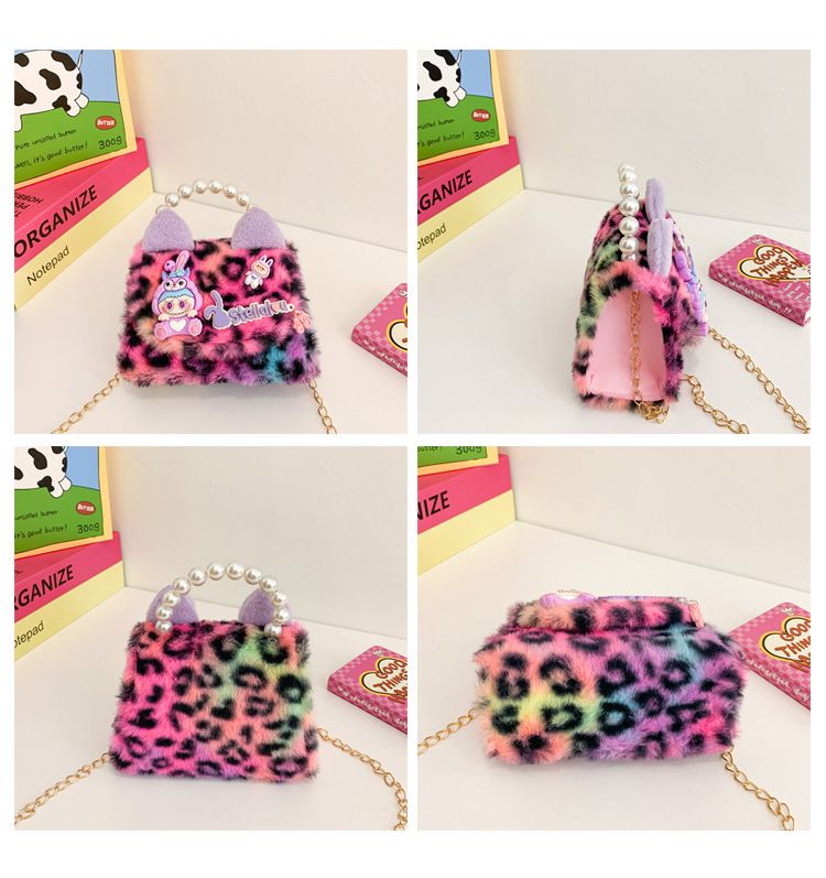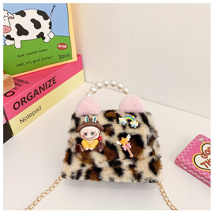 Ultraman Autumn and Winter New Girls Plush Bag Children's Chain Crossbody Bag Princess Baby Cute Pearl Handheld Shoulder Bag Brown Leopard Print