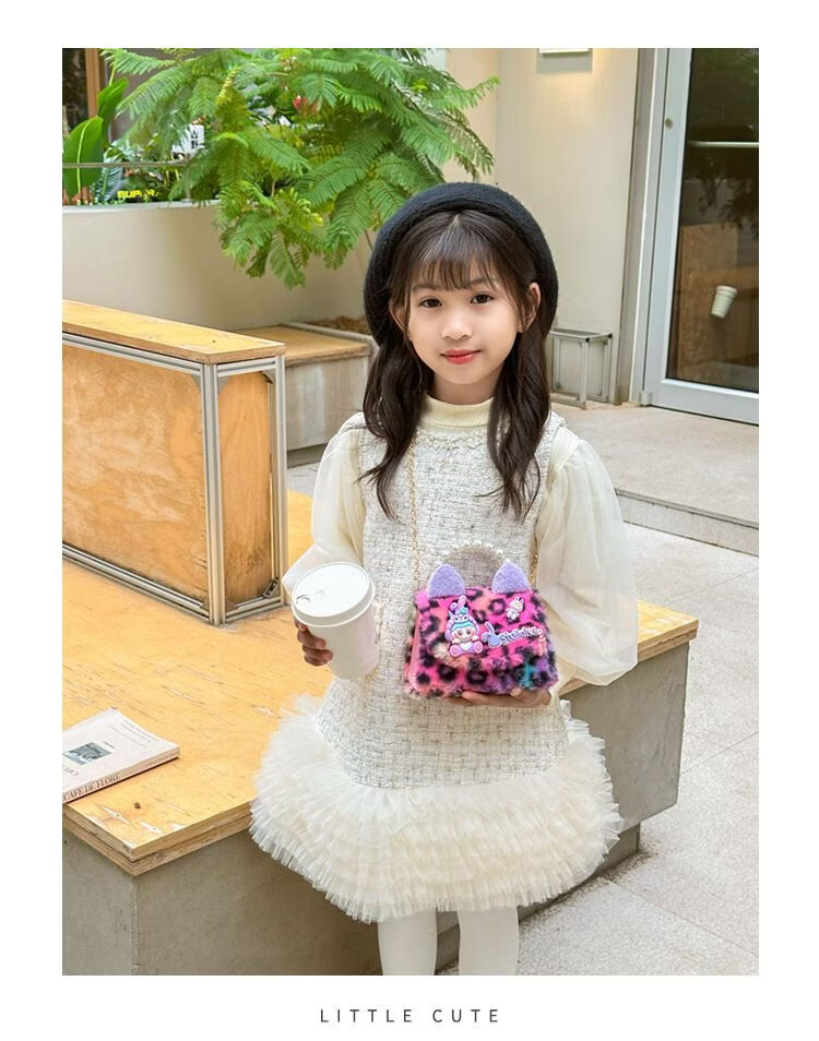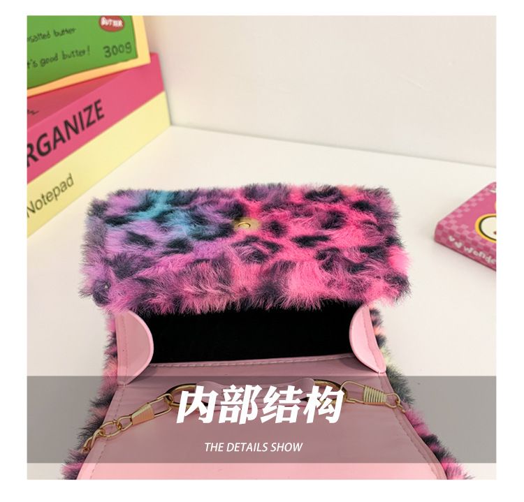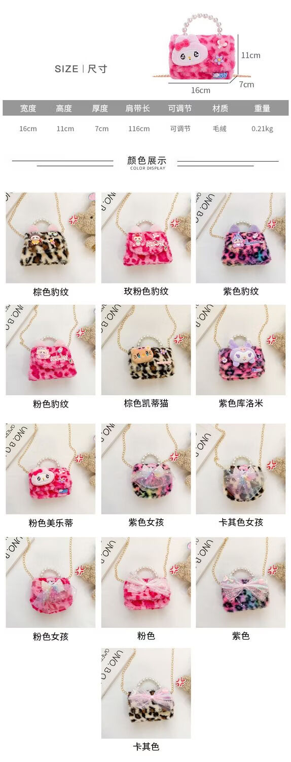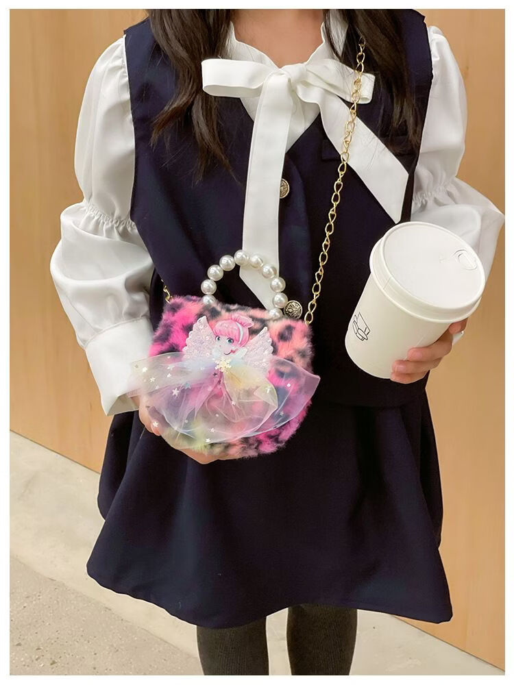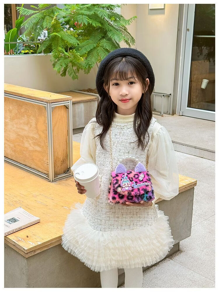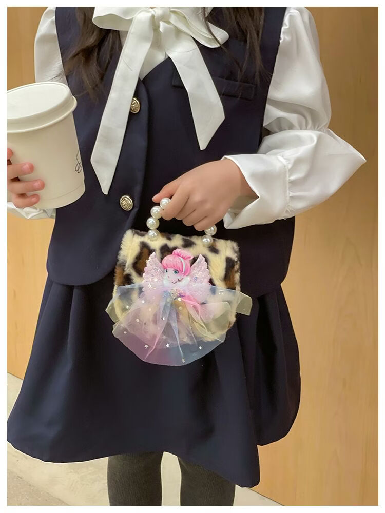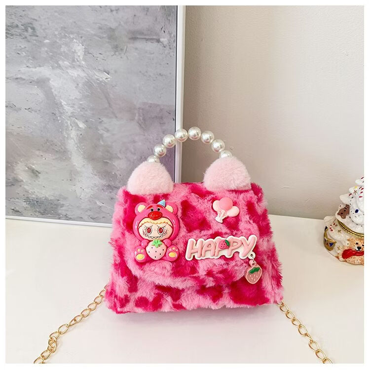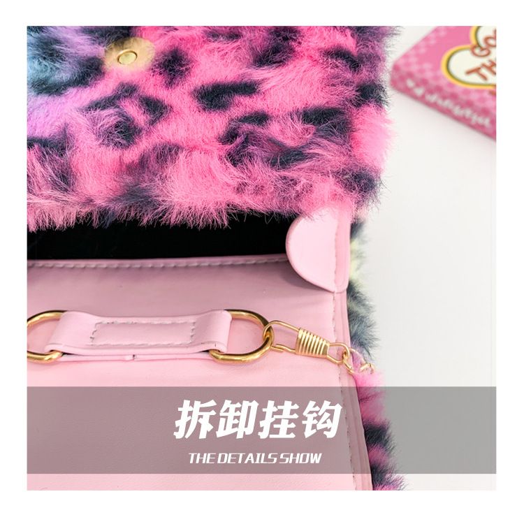 Ultraman Autumn and Winter New Girls Plush Bag Children's Chain Crossbody Bag Princess Baby Cute Pearl Handheld Shoulder Bag Brown Leopard Print