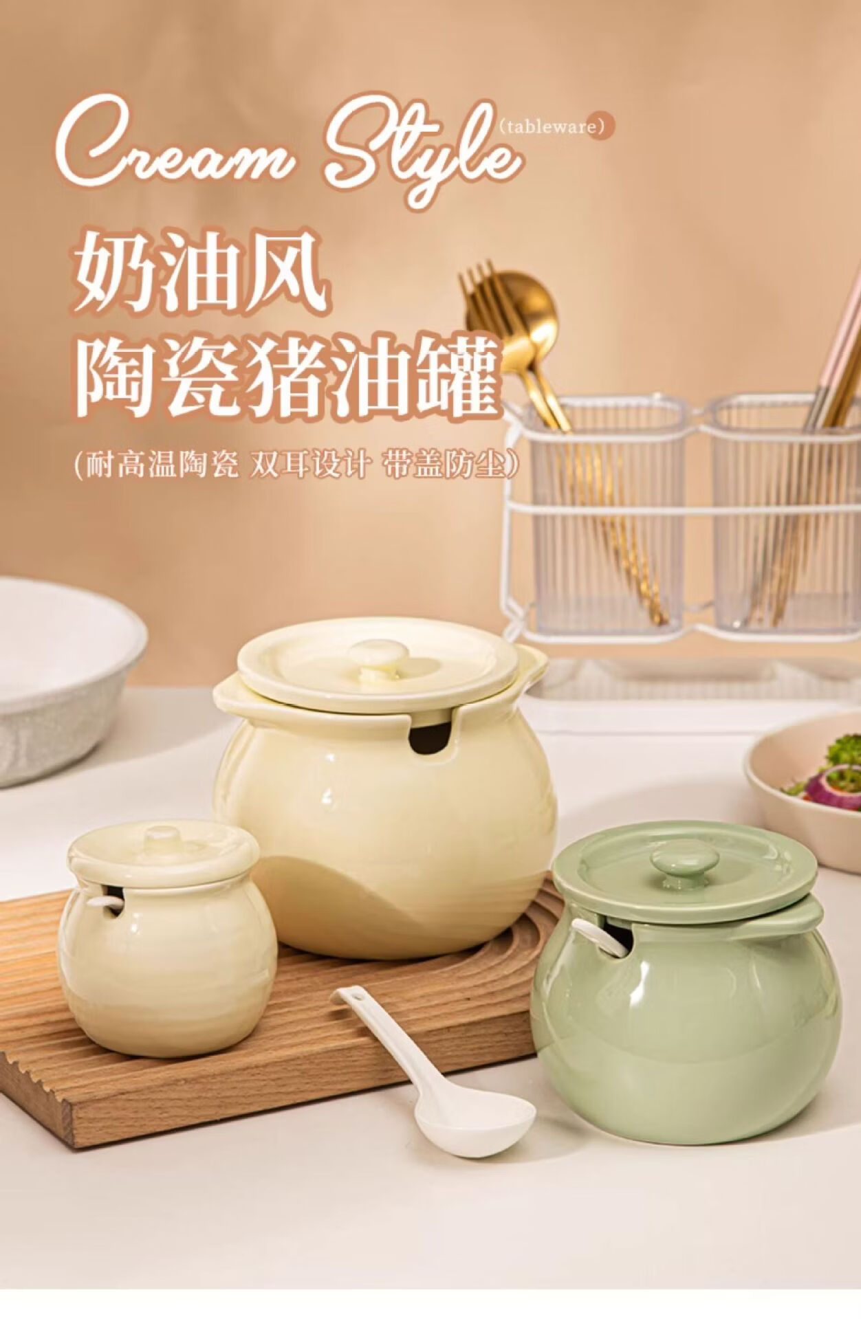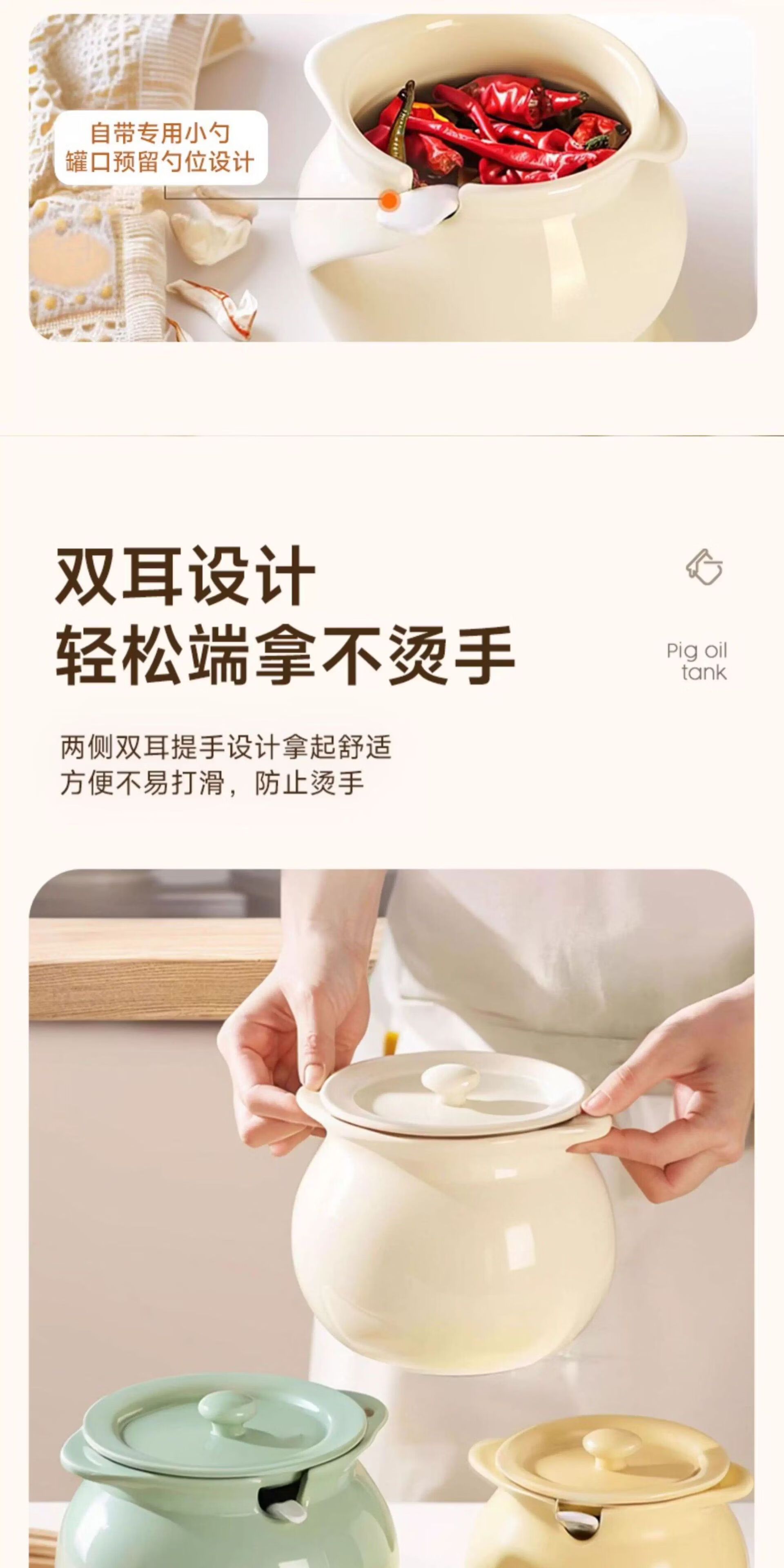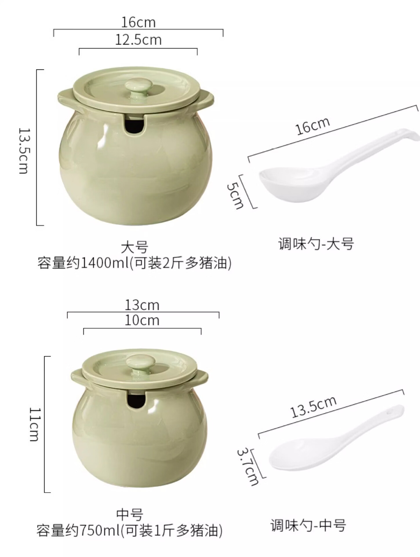 BYX lard jar household high temperature resistant ceramic jar with lid kitchen oil salt seasoning jar meat oil chili oil red oil storage jar milk green small size 750ml (free special ceramic spoon)