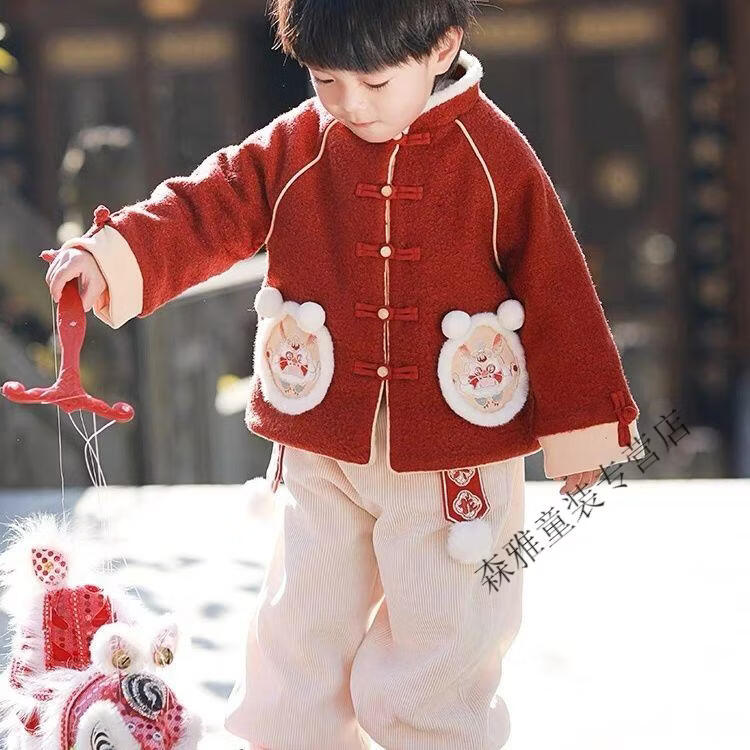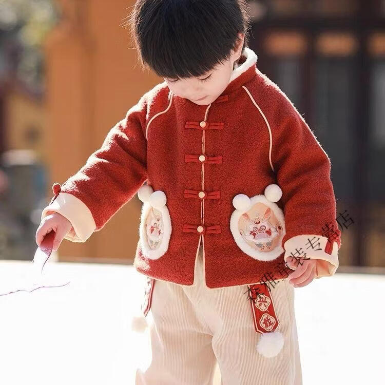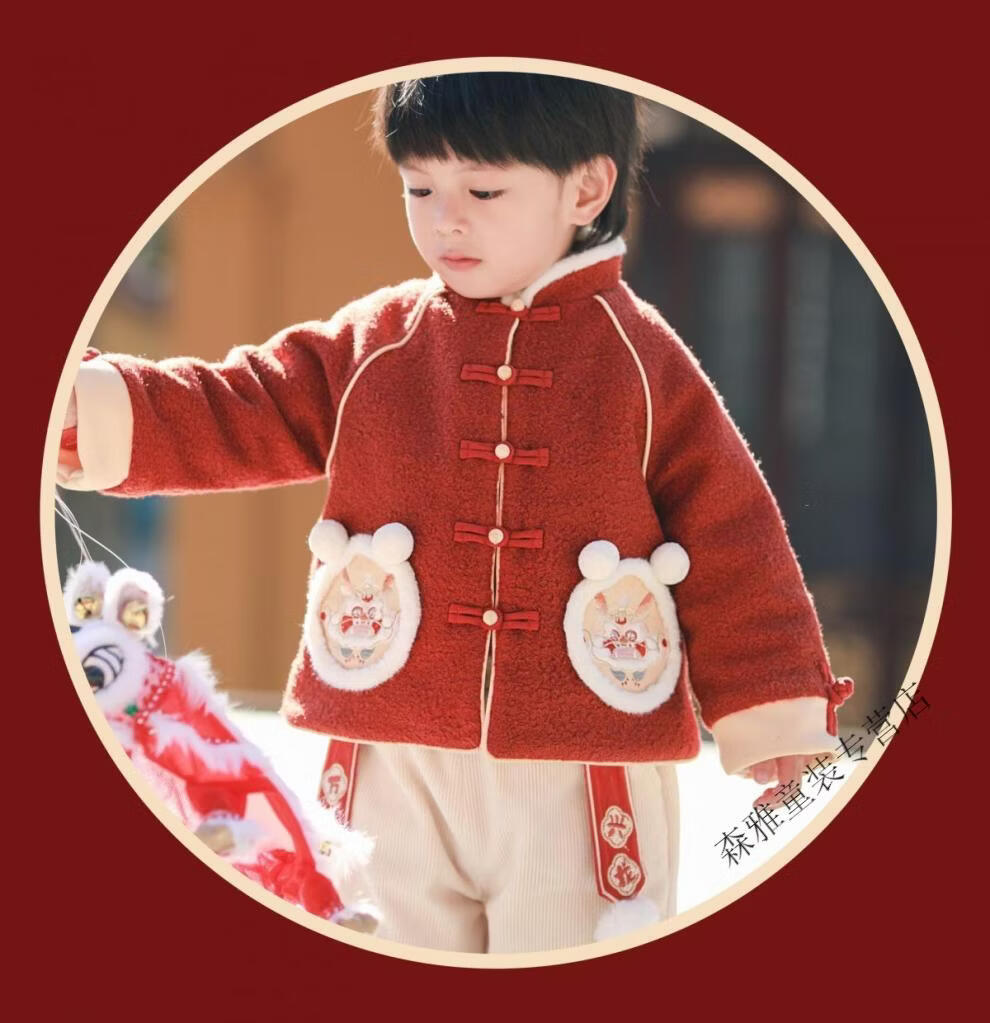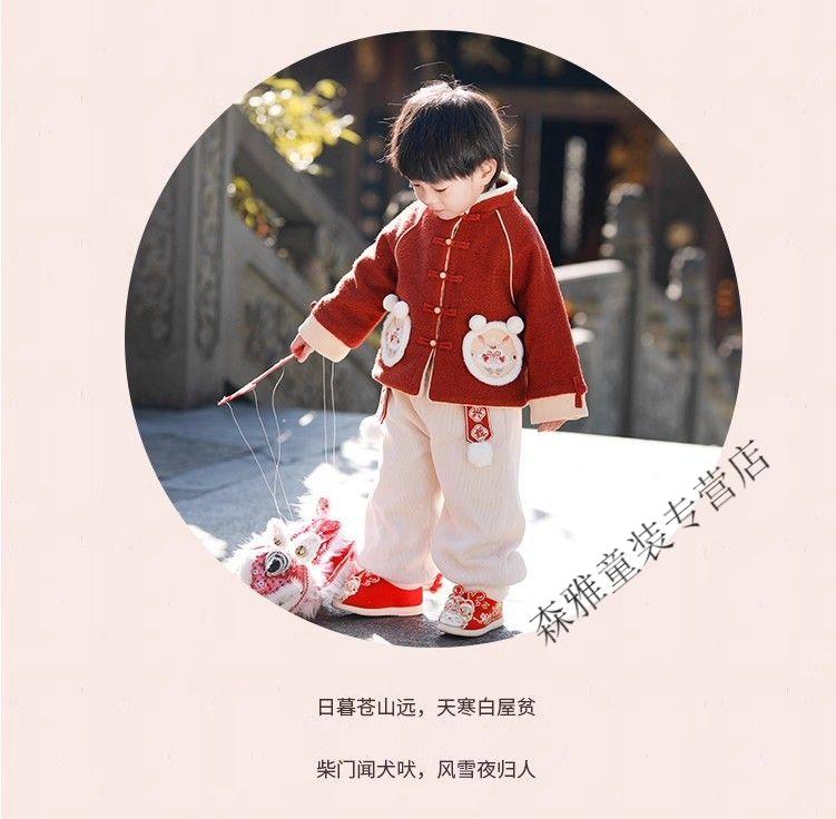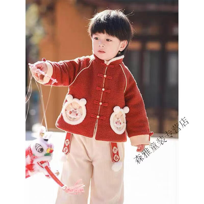 Mumuwu (mumuwu) Hanfu children's velvet New Year's greeting suit new Chinese baby New Year's festive red two-piece boy's New Year's greeting suit Everything is prosperous suit (jacket + pants) 73