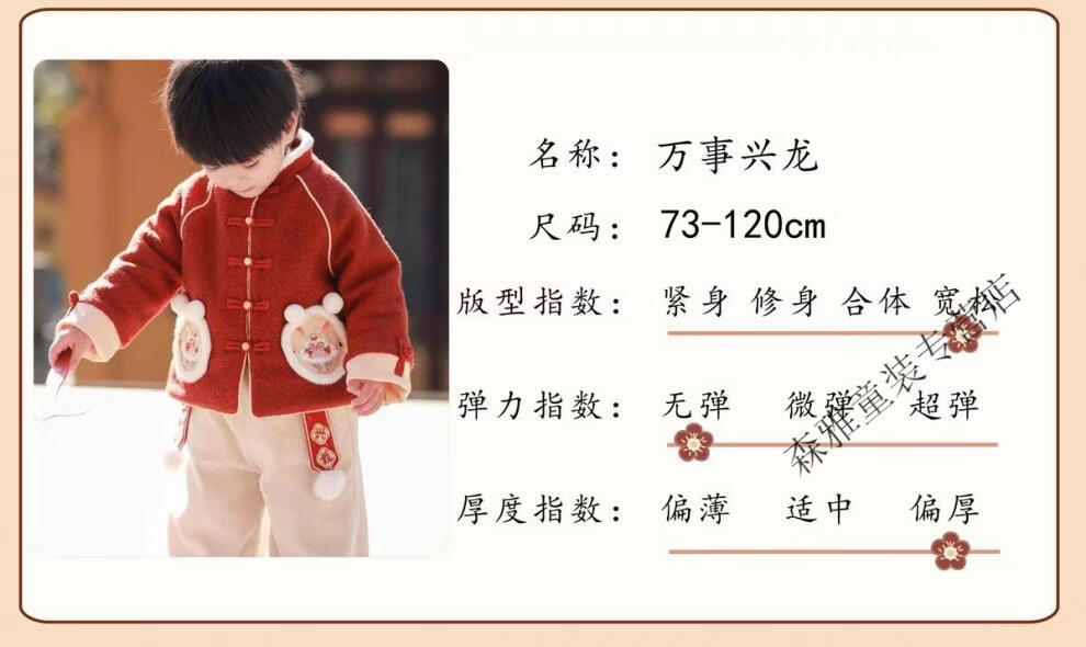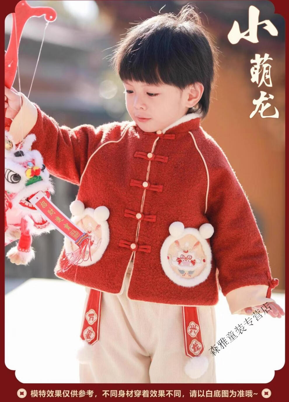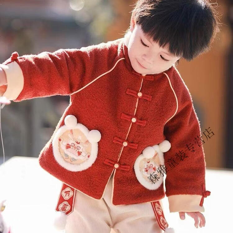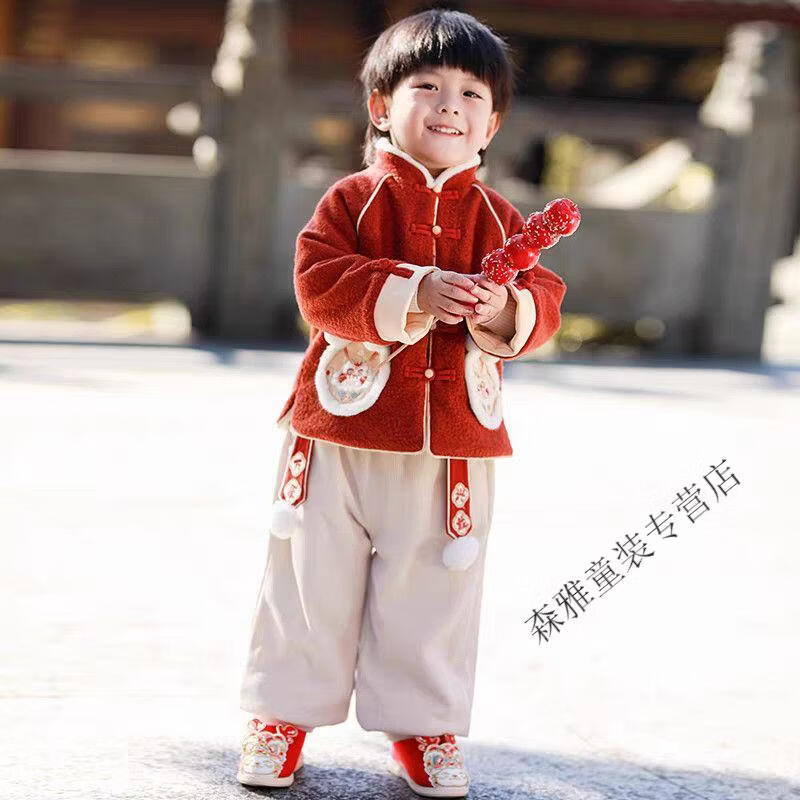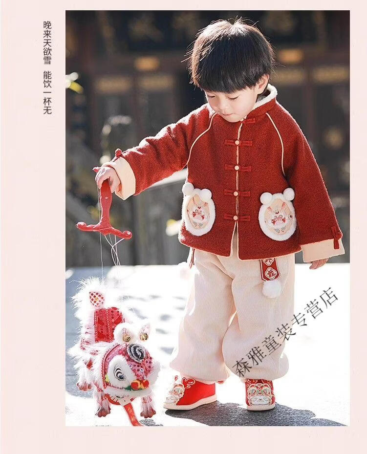 Mumuwu (mumuwu) Hanfu children's velvet New Year's greeting suit new Chinese baby New Year's festive red two-piece boy's New Year's greeting suit Everything is prosperous suit (jacket + pants) 73