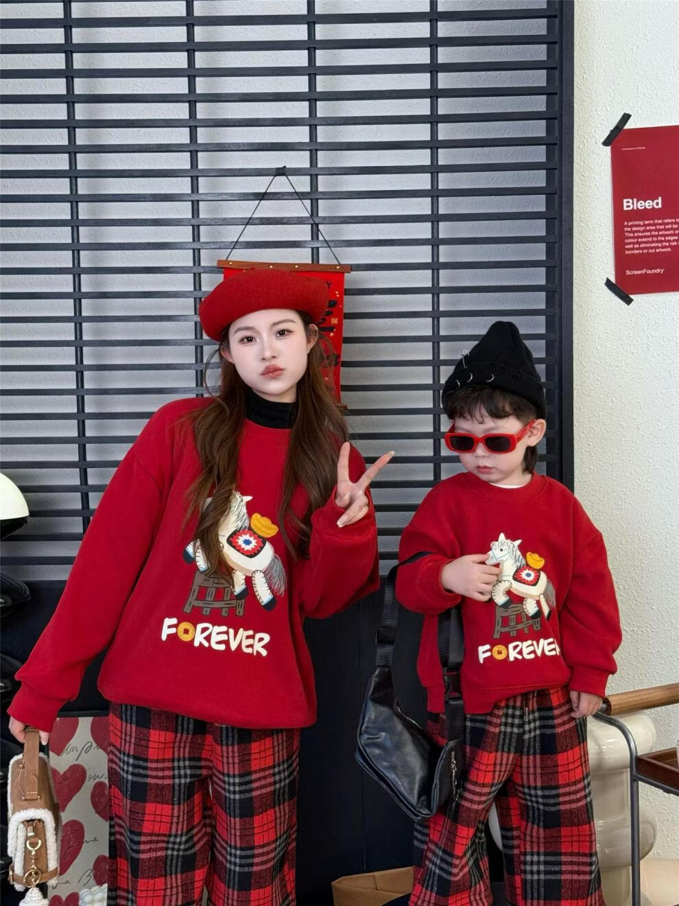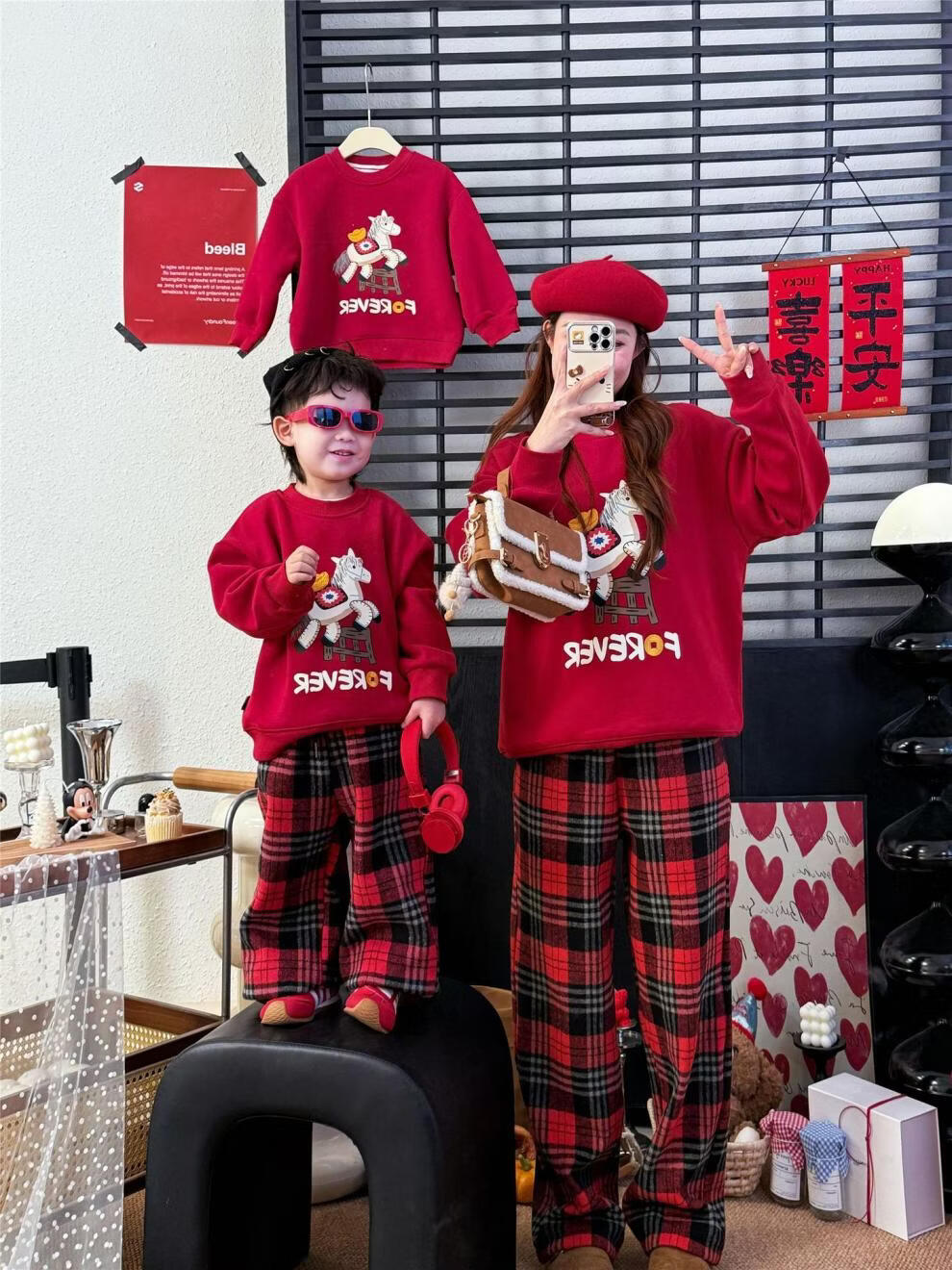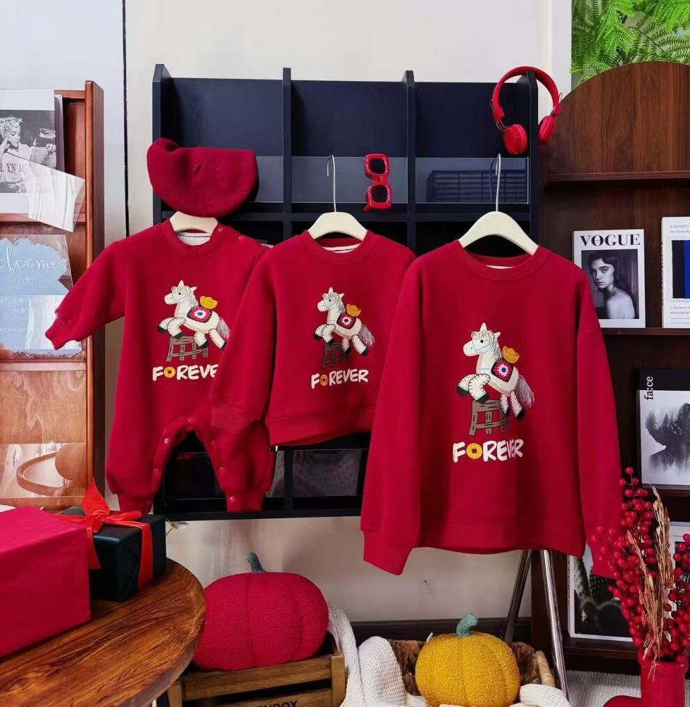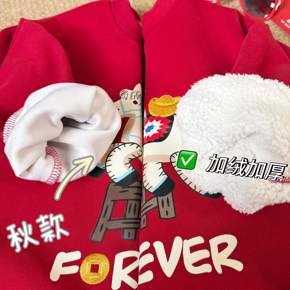 G.duck Chinese New Year parent-child outfits for a family of three, autumn and winter red sweatshirts, festive New Year's greetings clothes, mother and daughter outfits, fashionable, high-end and trendy, hot sale, red plus velvet, 90 cm