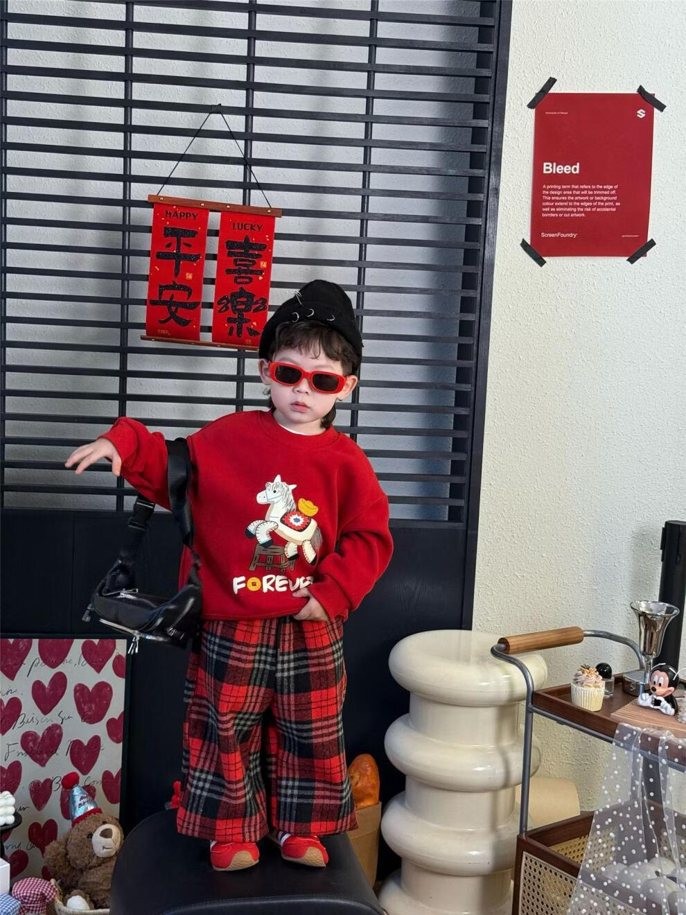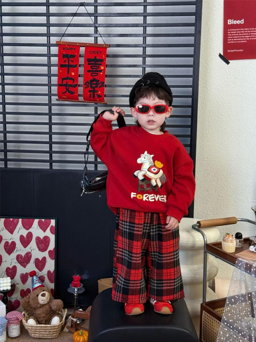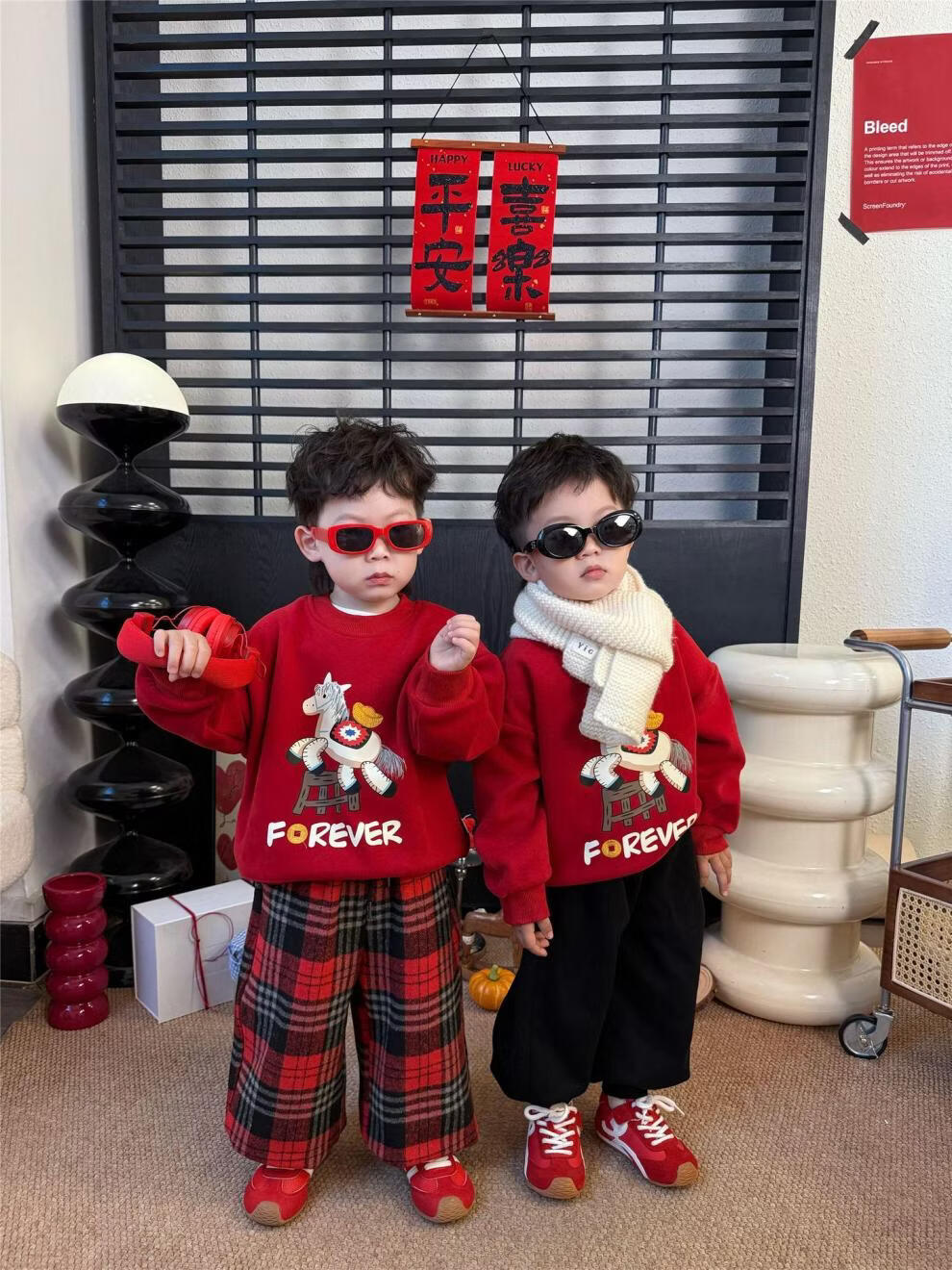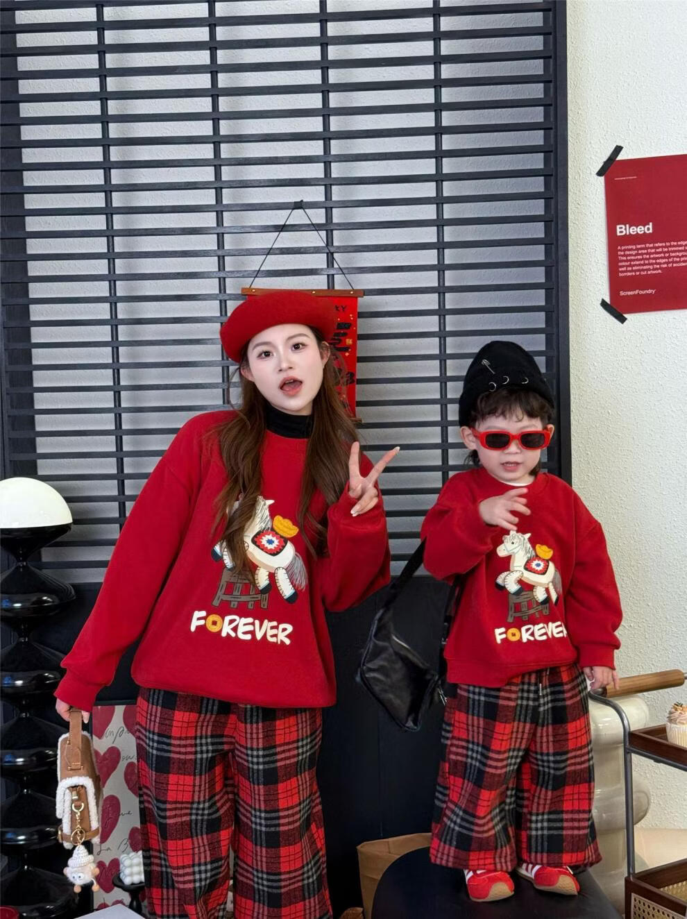 G.duck Chinese New Year parent-child outfits for a family of three, autumn and winter red sweatshirts, festive New Year's greetings clothes, mother and daughter outfits, fashionable, high-end and trendy, hot sale, red plus velvet, 90 cm