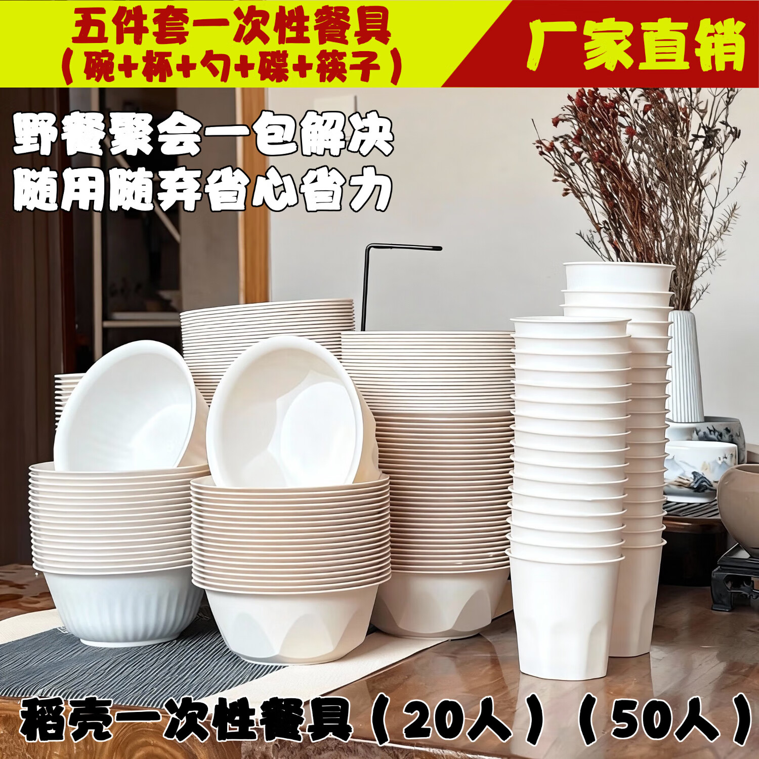 Rice husk series disposable tableware five-piece set (dishes, cups, saucers, spoons and chopsticks set) thickened picnic banquet barbecue white disposable tableware five-piece small bowl set (280 ml bowls, cups, saucers, spoons and chopsticks) 20-person set