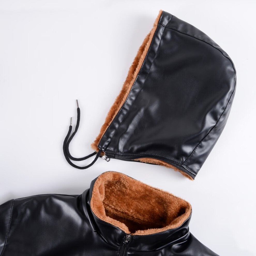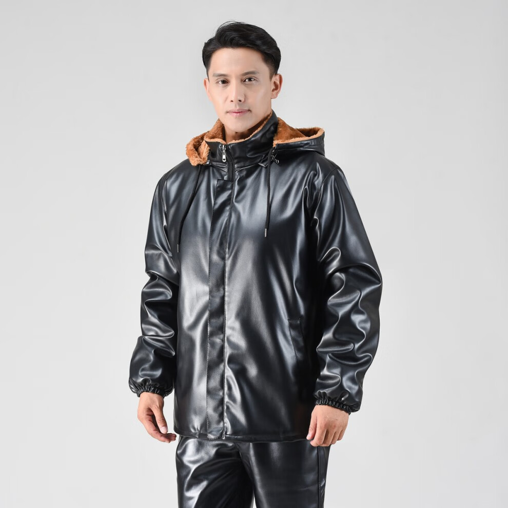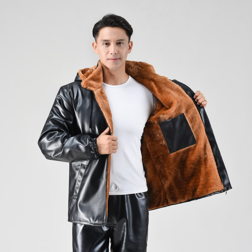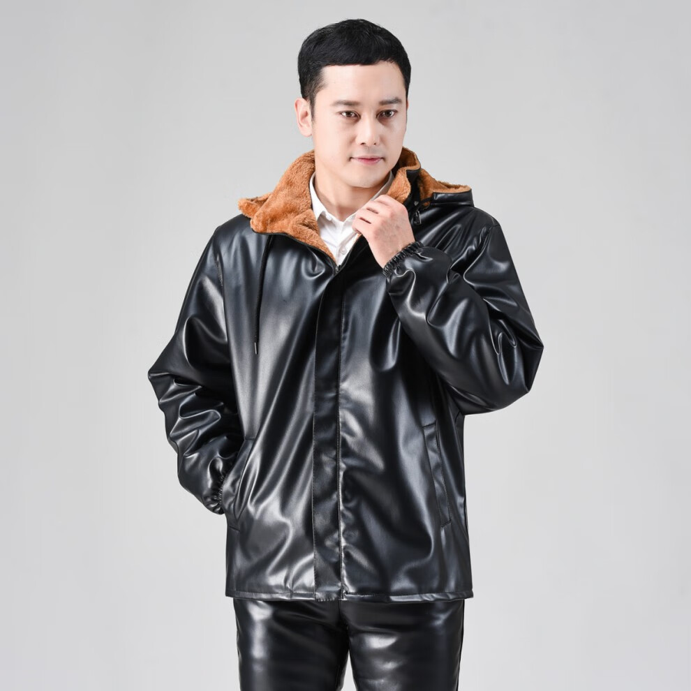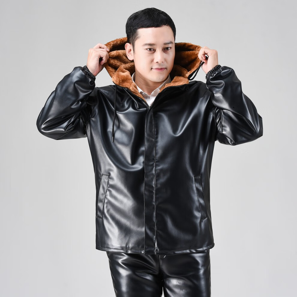 Shantou Lincun velvet thickened leather jacket and leather pants suit men's motorcycle windproof loose plus size winter leather and cotton coat driving jacket hooded velvet thickened leather jacket suit 2XL 2XL recommended 120-140Jin Jin equals 0.5 kg