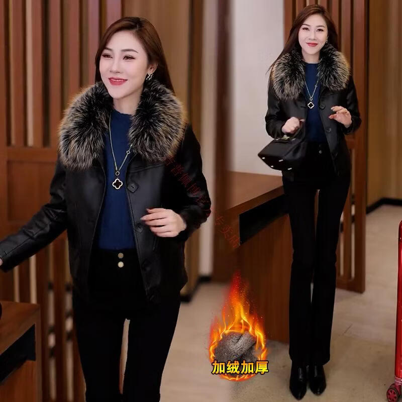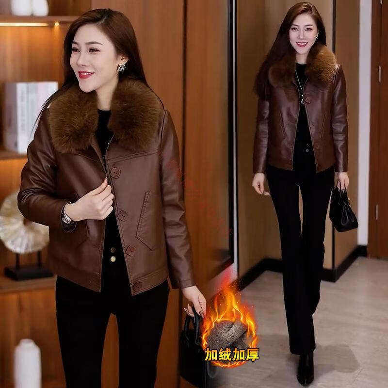 JEEP SPIRIT Fashionable Velvet Thickened Leather Jacket Women's 2025 Winter New Style Western Versatile Warm Leather Jacket with Fur Collar Ancora Red Velvet L 100-115
