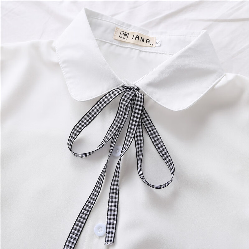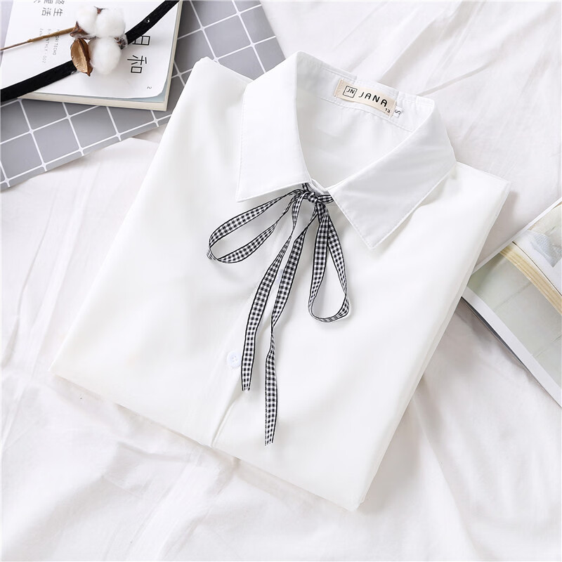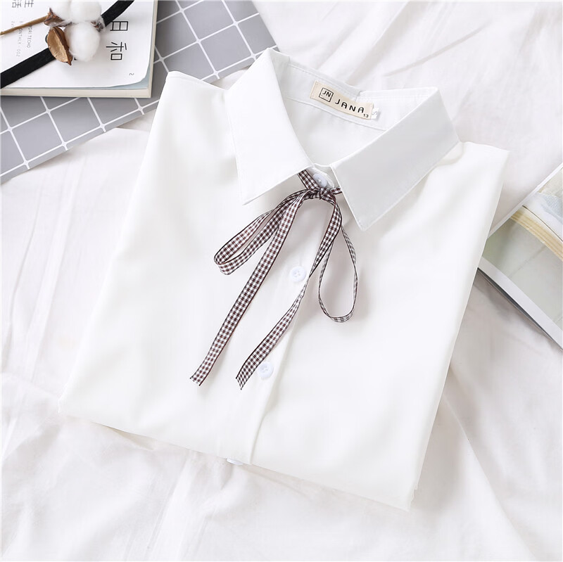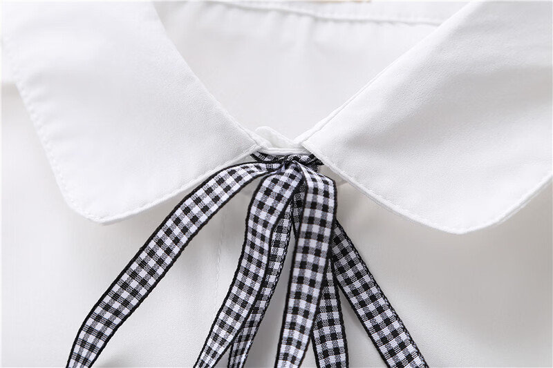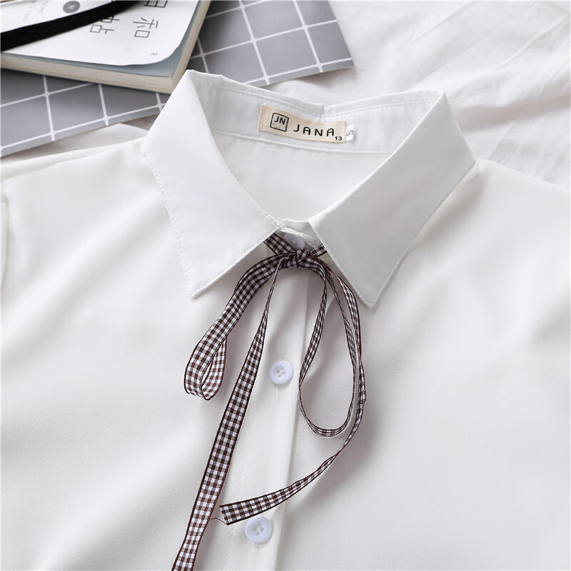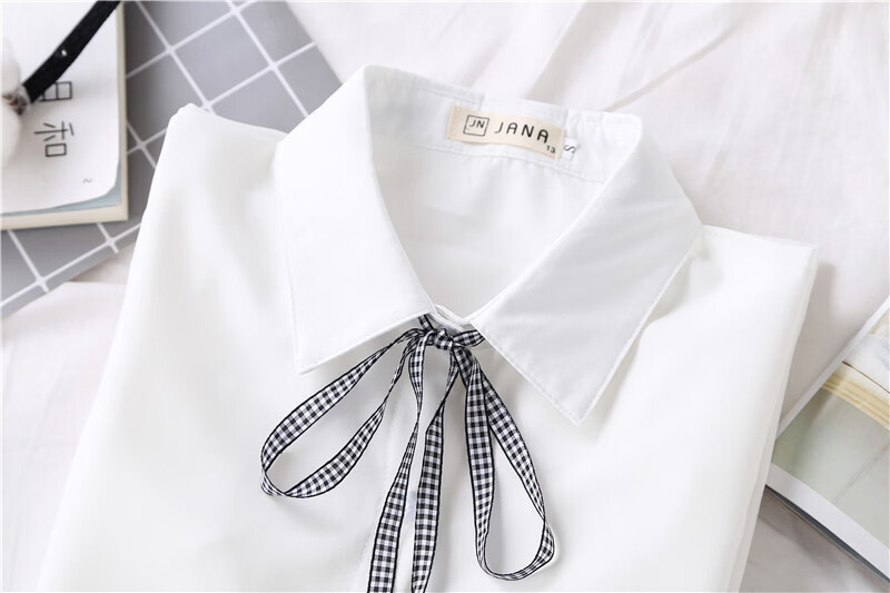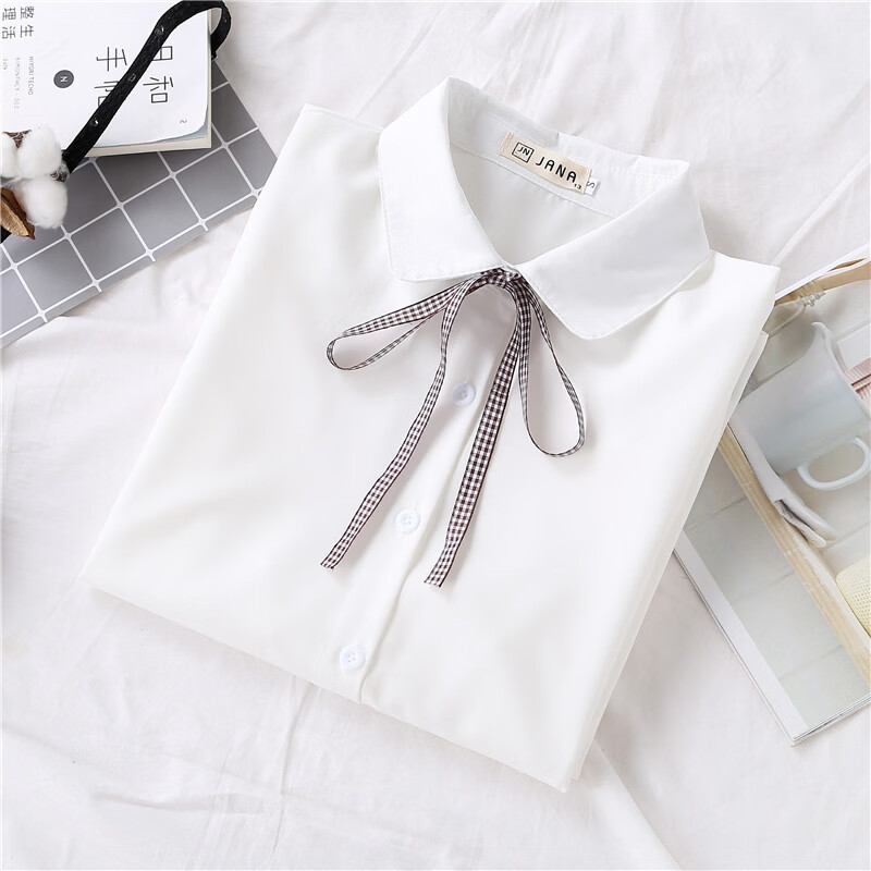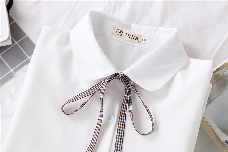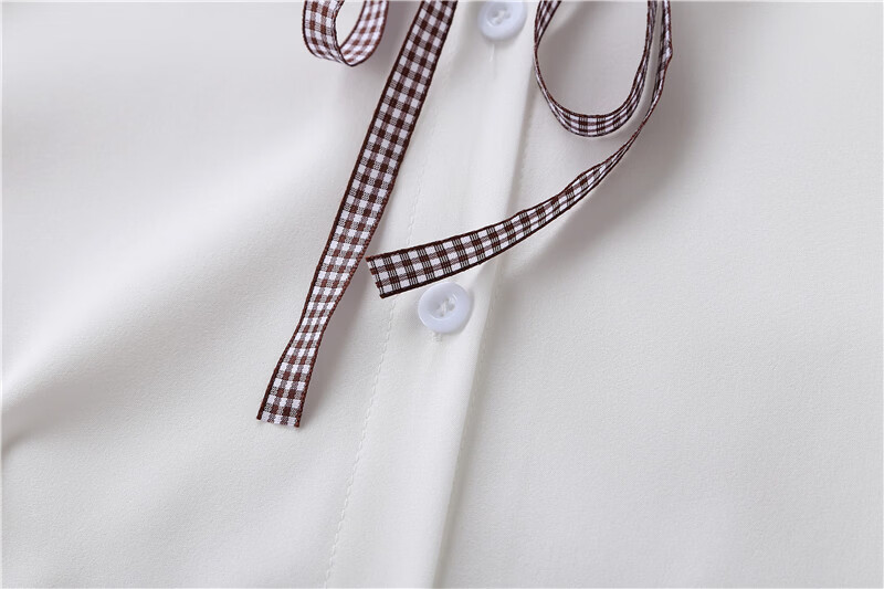 Woodpecker 2025 spring, autumn and winter new velvet thickened bow chiffon white shirt for women with long-sleeved bottoming top round neck coffee plaid lace-up without velvet S