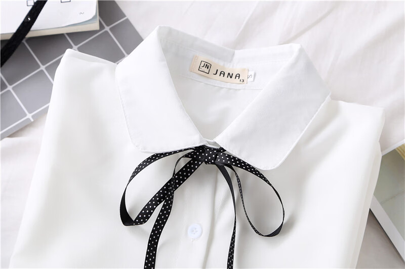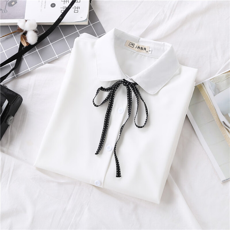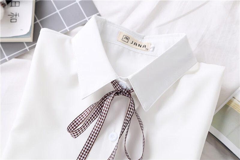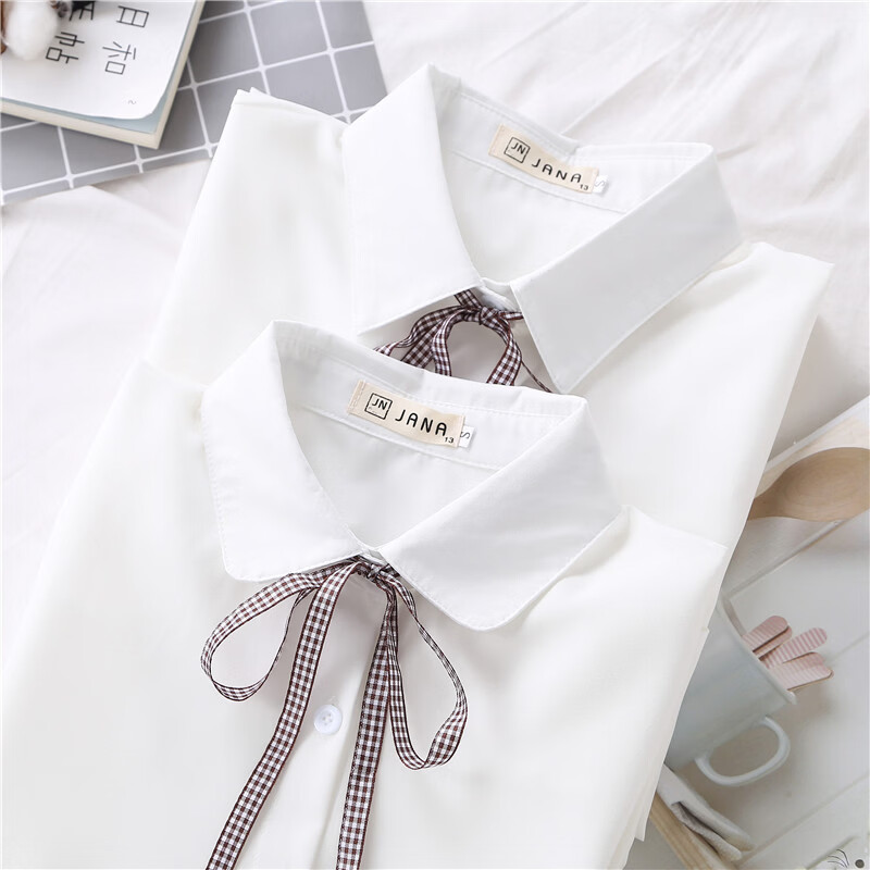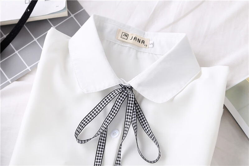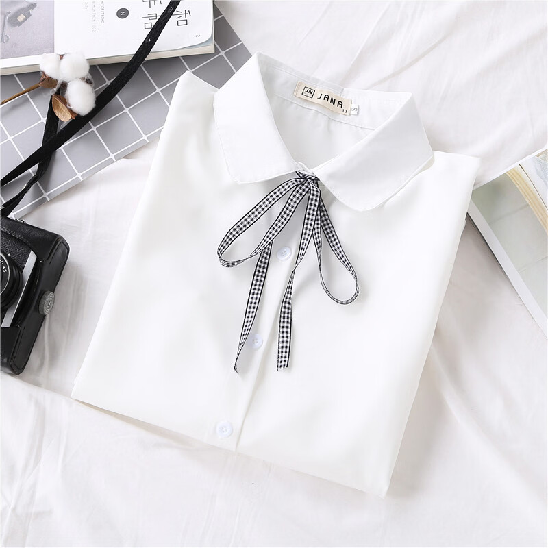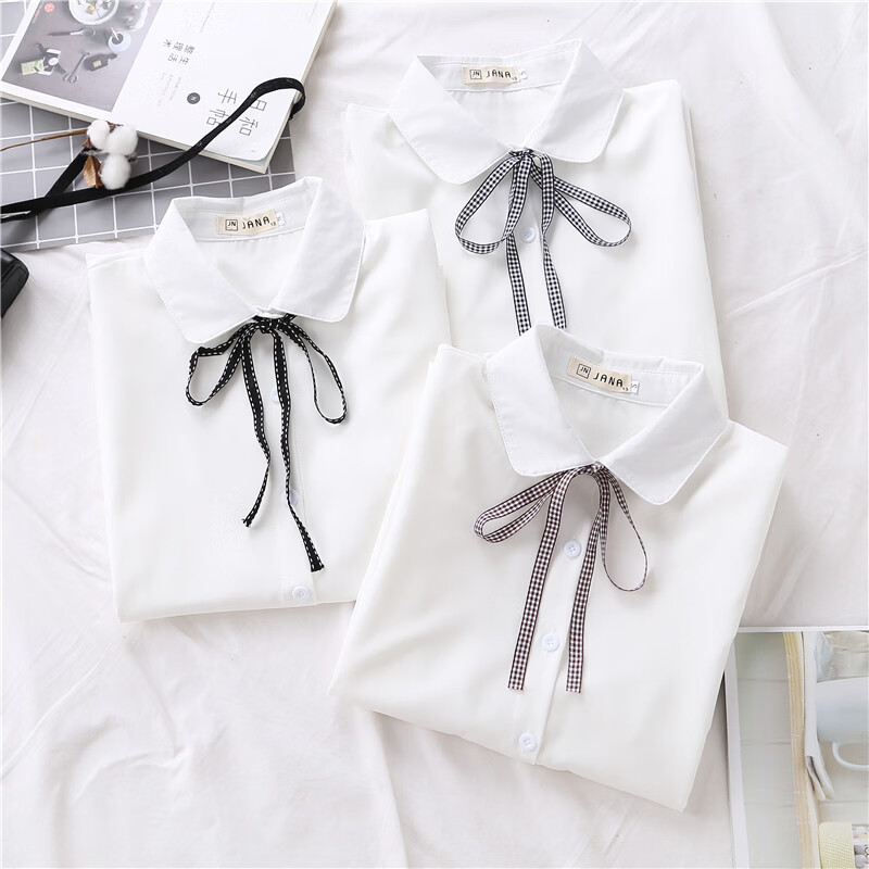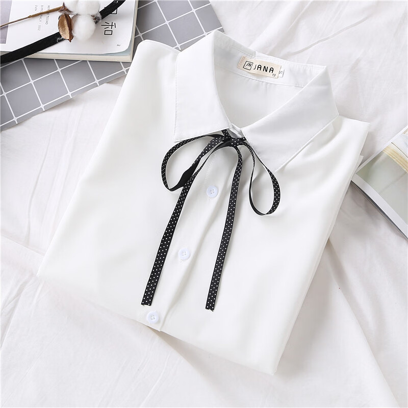 Woodpecker 2025 spring, autumn and winter new velvet thickened bow chiffon white shirt for women with long-sleeved bottoming top round neck coffee plaid lace-up without velvet S