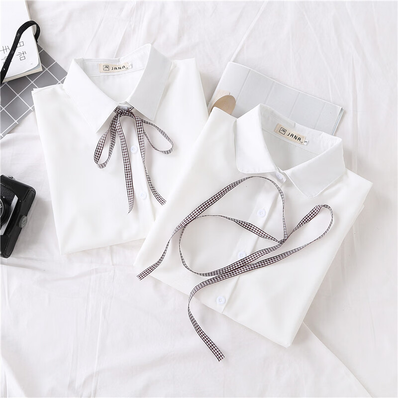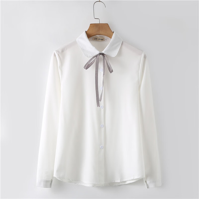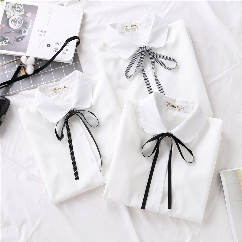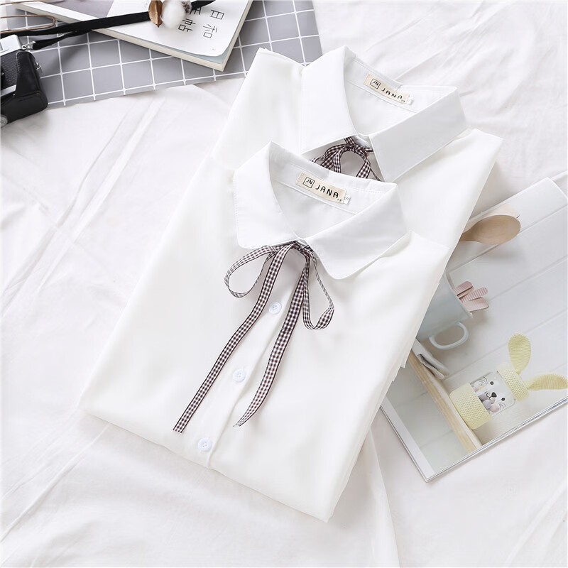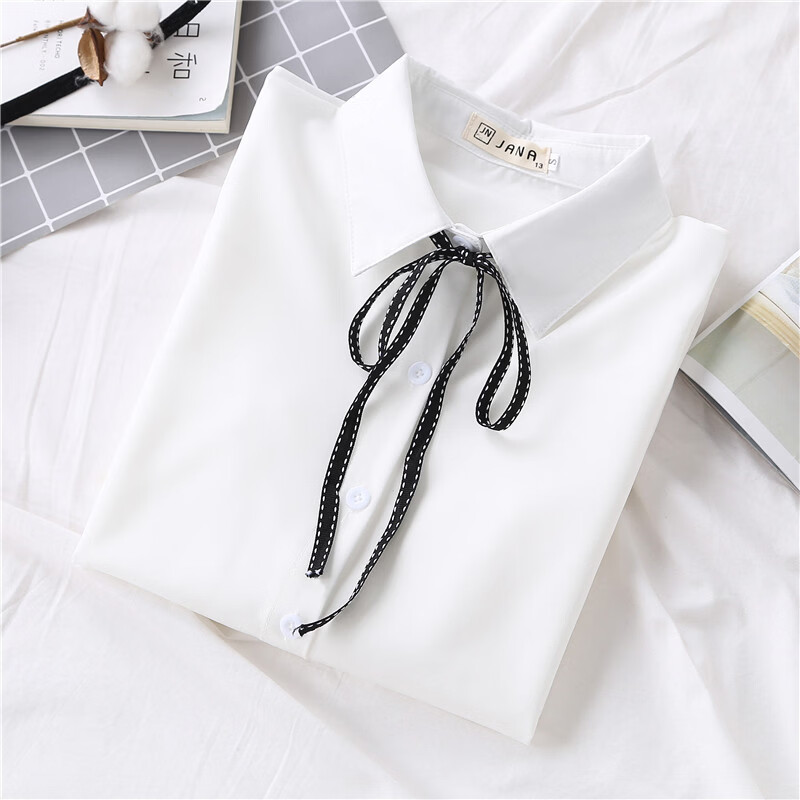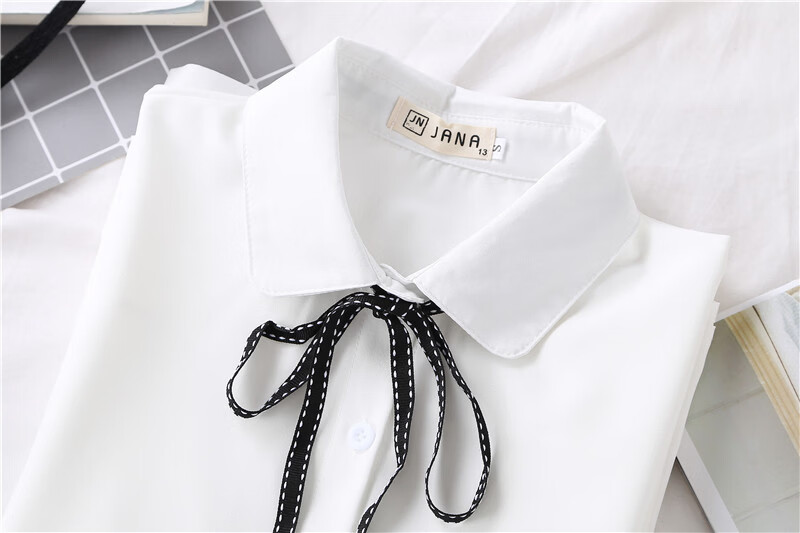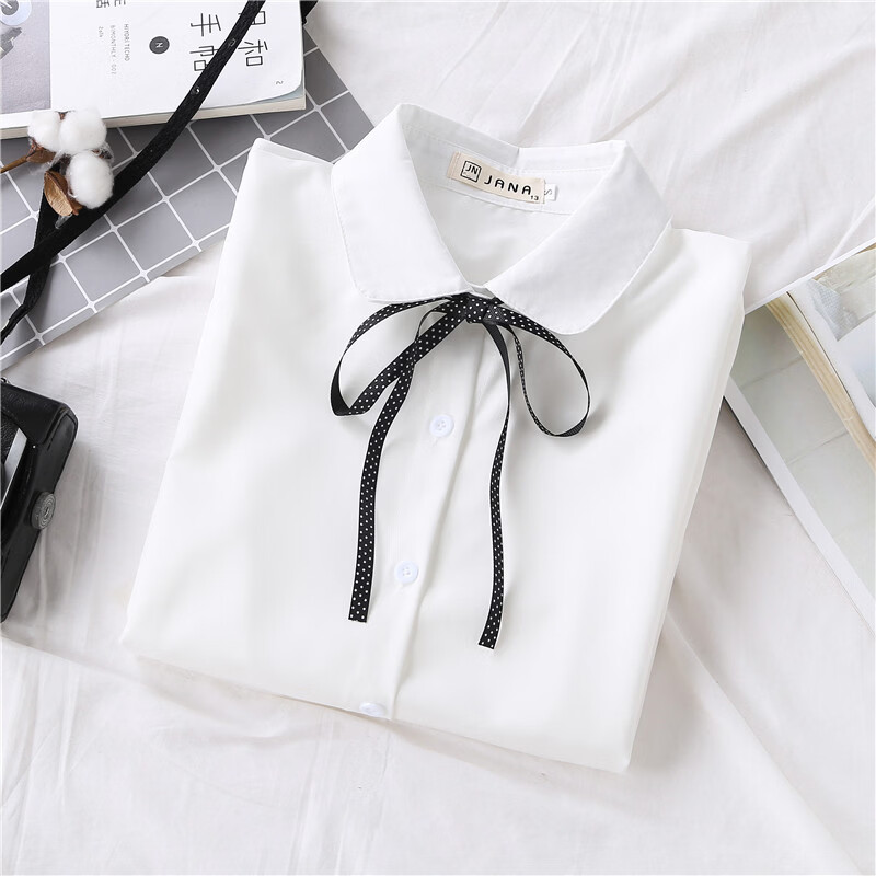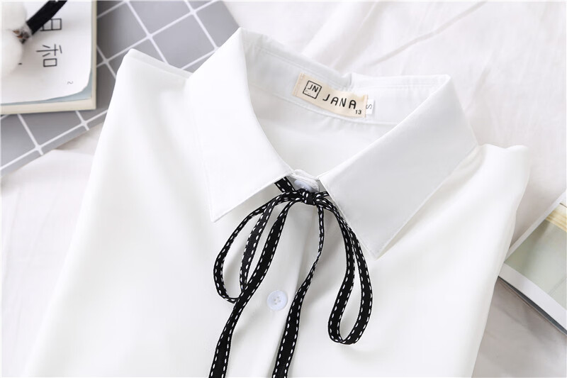 Woodpecker 2025 spring, autumn and winter new velvet thickened bow chiffon white shirt for women with long-sleeved bottoming top round neck coffee plaid lace-up without velvet S