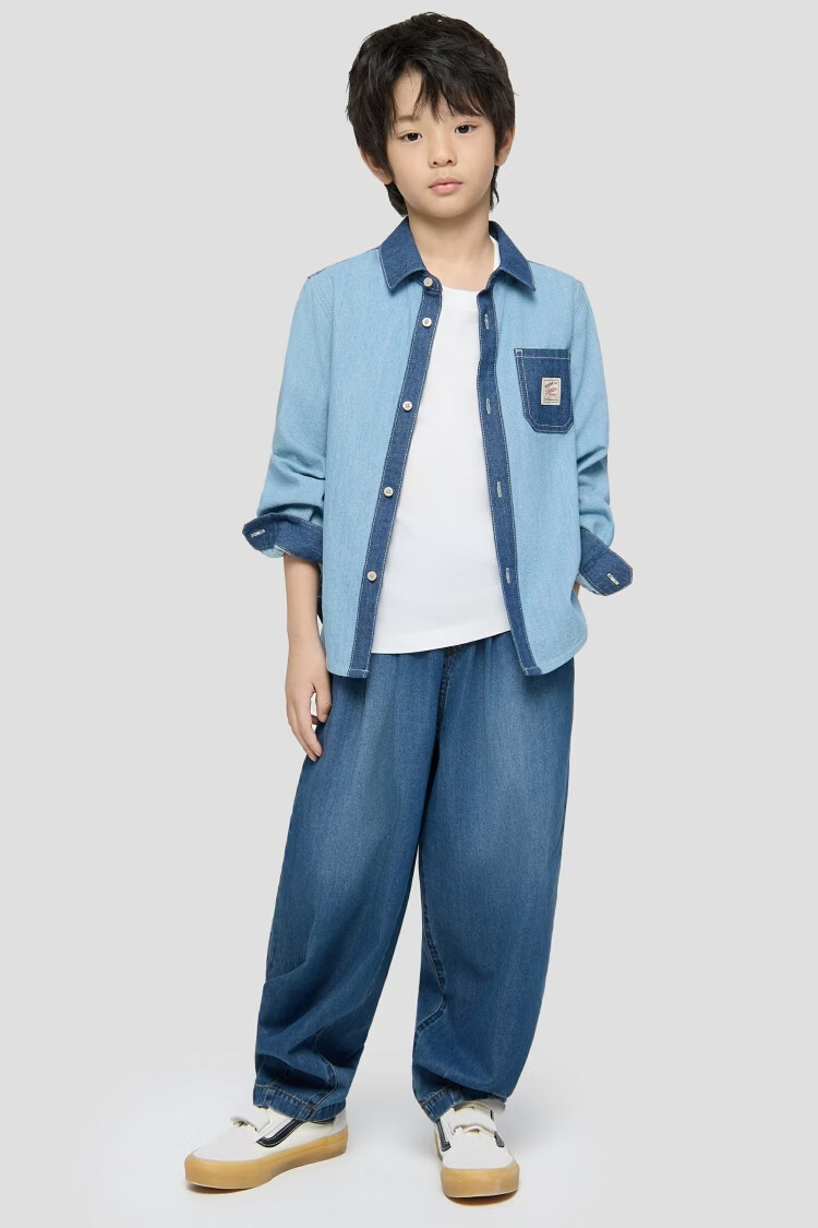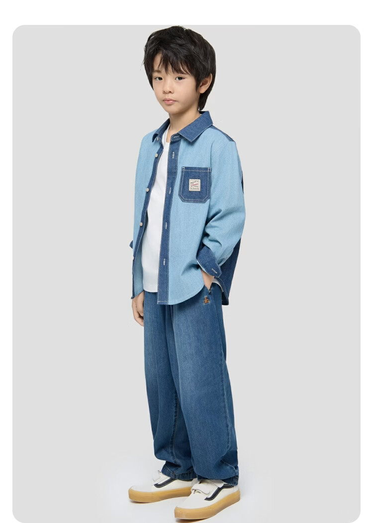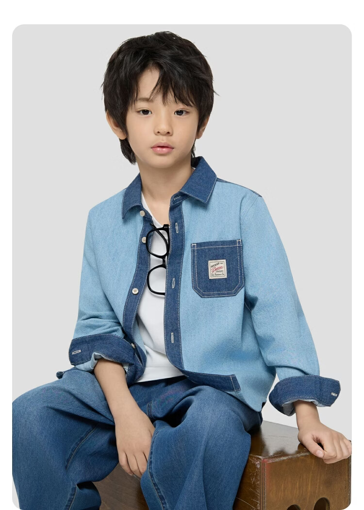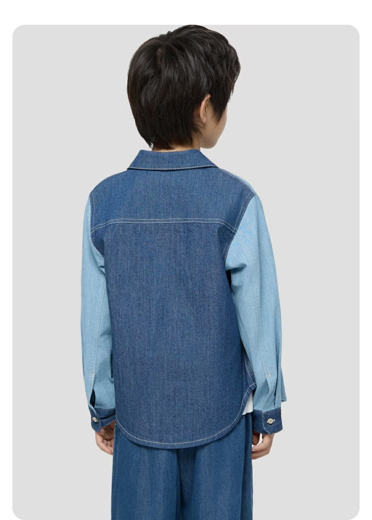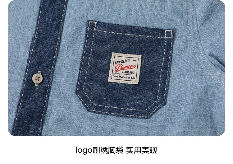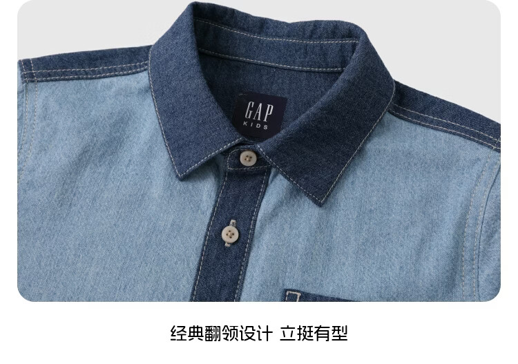 Gap Gap boys and girls 2026 spring new logo embroidered chest bag splicing denim shirt children's wear 861378 blue 120 cm (6-7 years old) Asian size