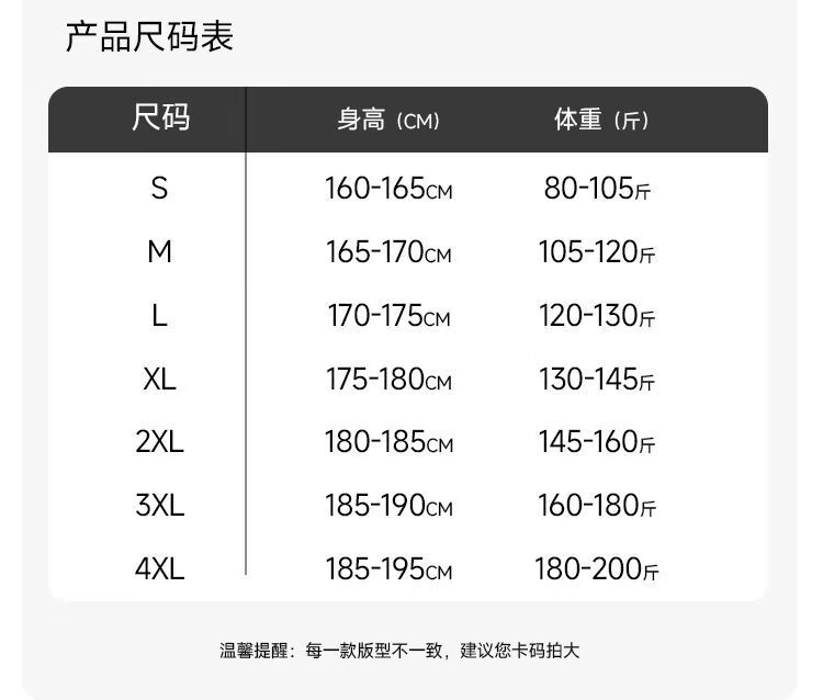 China (cm) 165 / 88-90 170 / 96-98 175 / 108-110 180 / 118-122 185 / 126-130