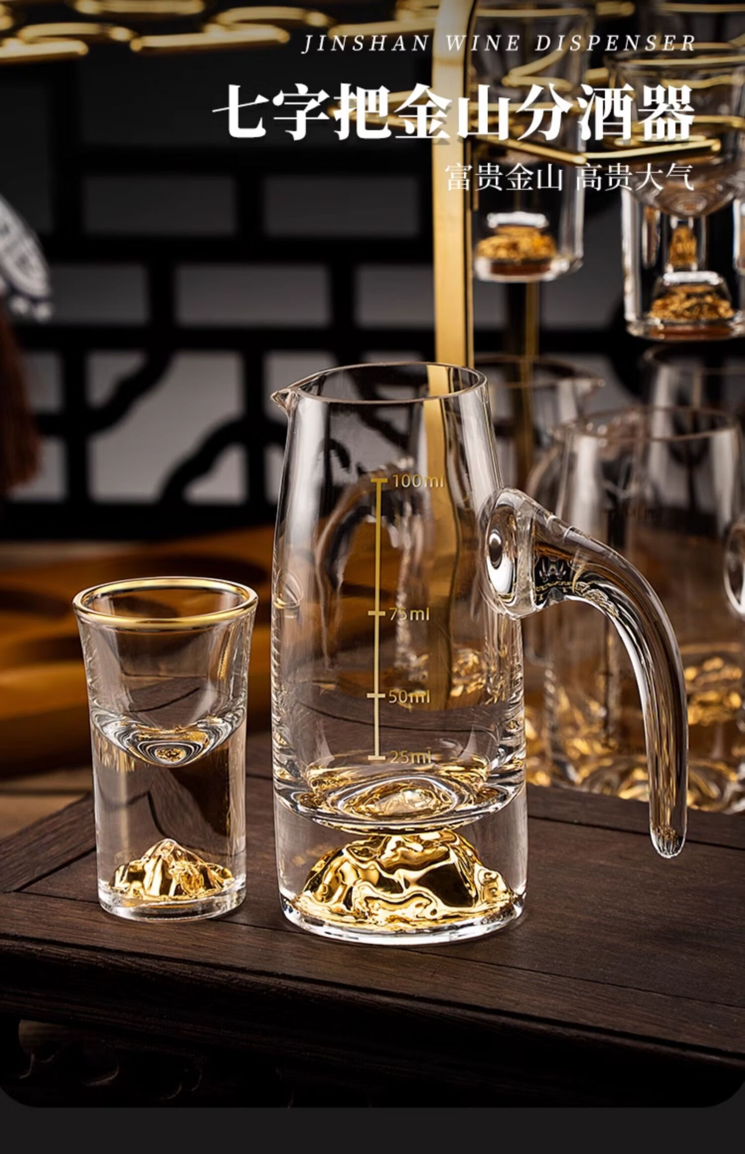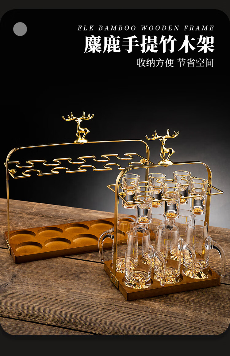 High-end light luxury crystal glass white wine glass set, household Chinese-style one-cup, small wine glass, two-quarter wine set, transparent handleless, 6 pots, 6 cups + golden deer cup holder