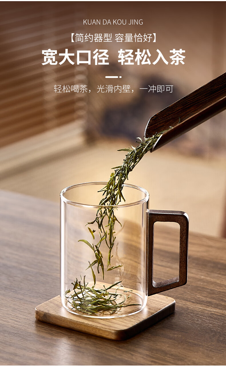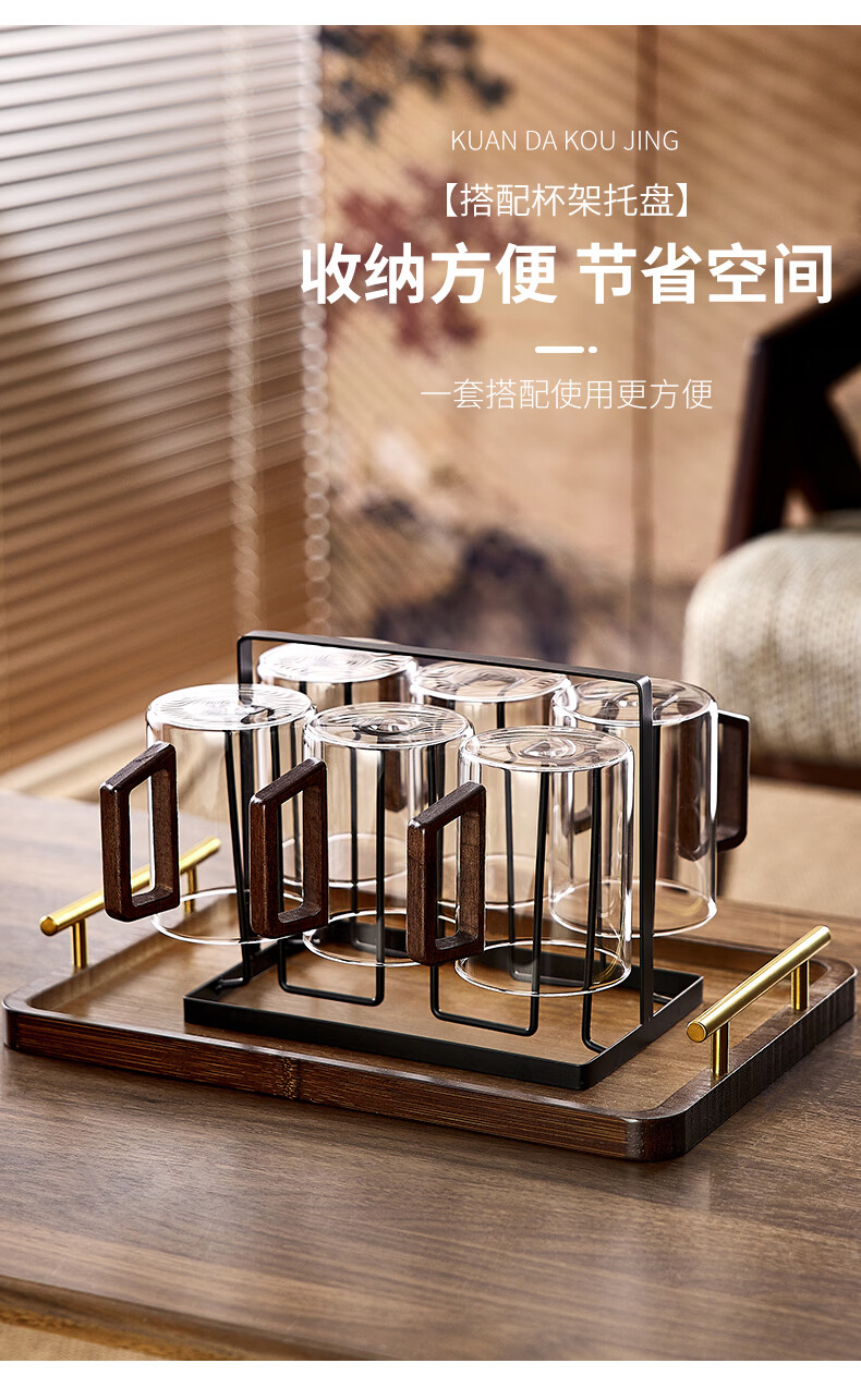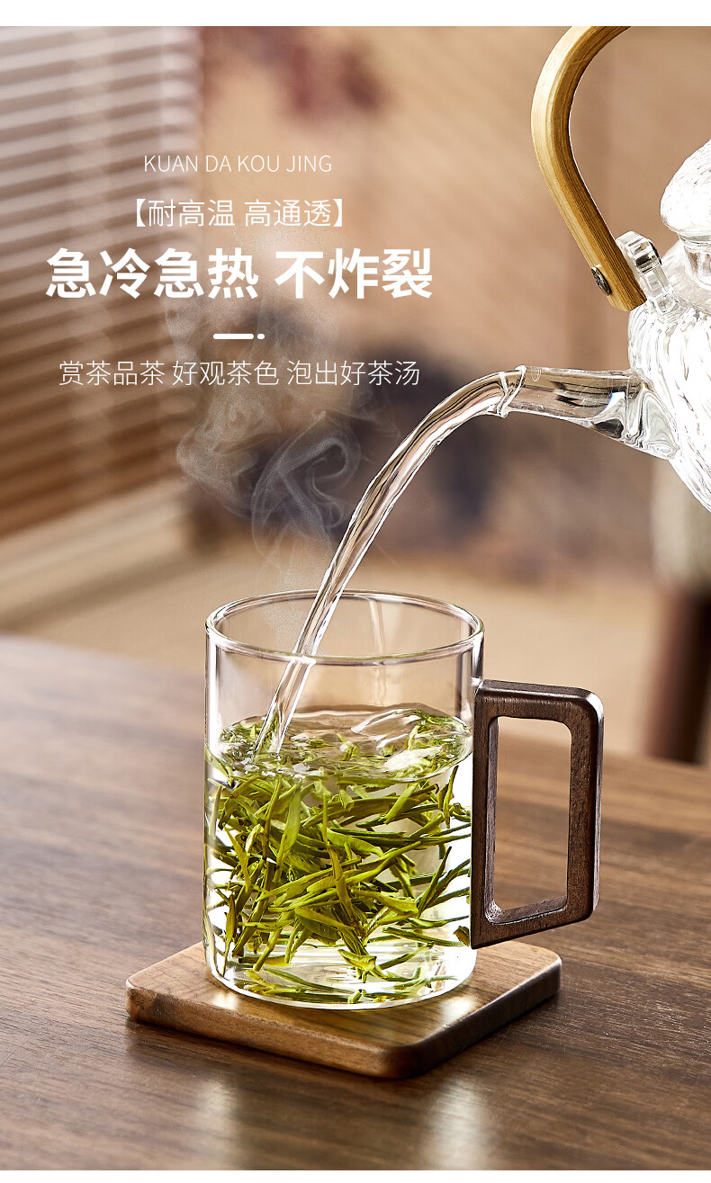 Green apple glass set household high temperature resistant drinking cup household green tea cup with handle hospitality cup office transparent wooden handle cup 300mlx6