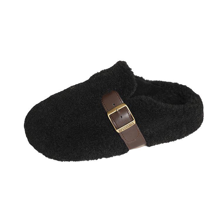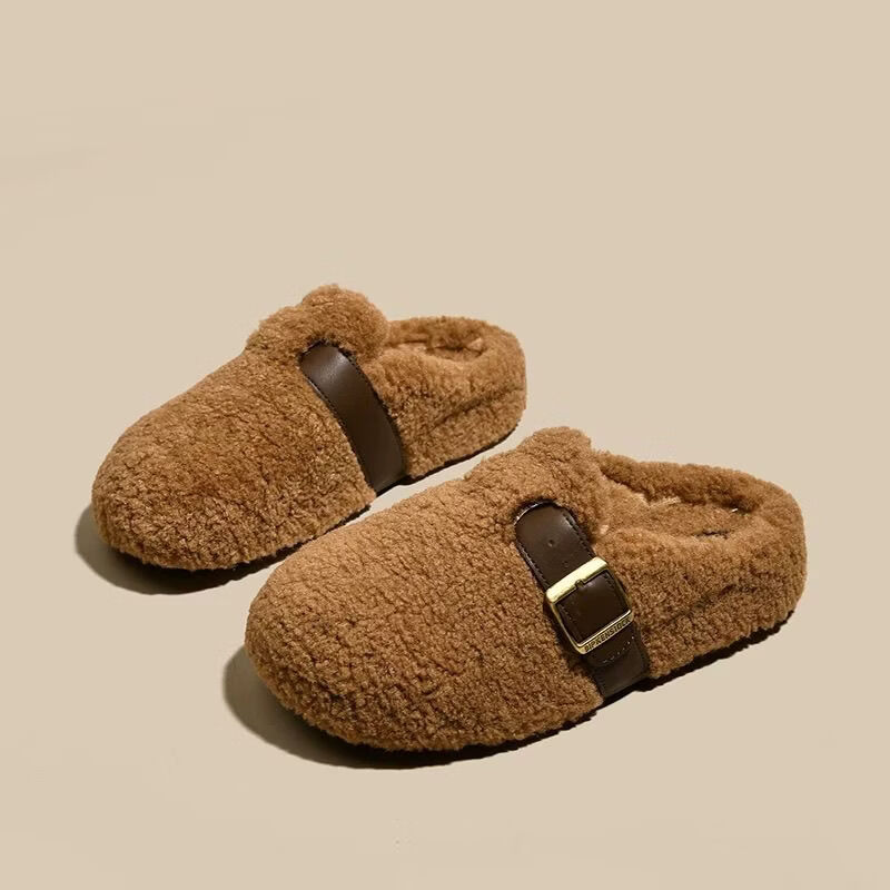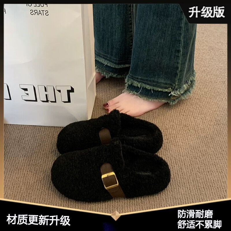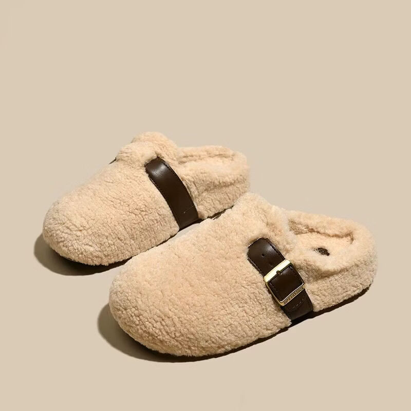 Scarecrow Thick-Soled Inner Height Furry Slippers for Women 2026 New Autumn and Winter Baotou Half-Toe Cotton Slippers Counter Model Beige 35