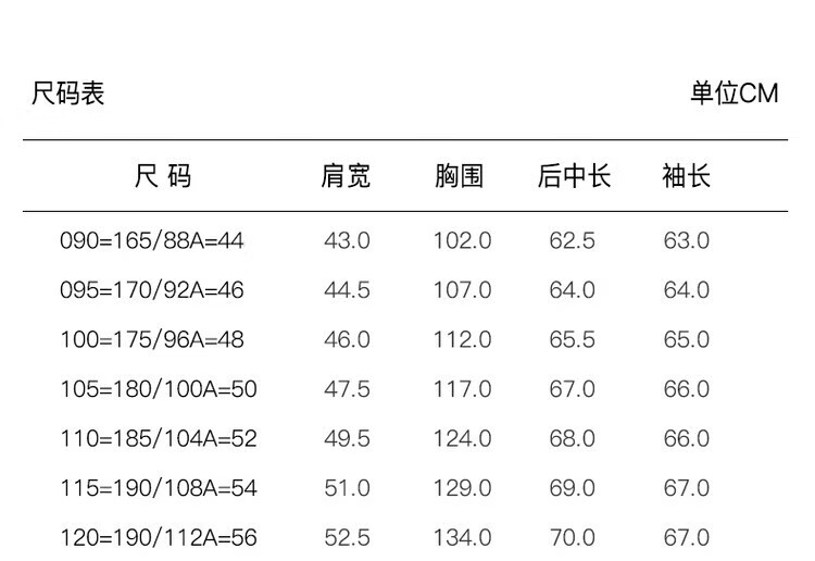 China (cm) 160-165/84-86 165-170 / 88-90 167-172 / 92-96 168-173 / 98-102 170-176 / 106-110