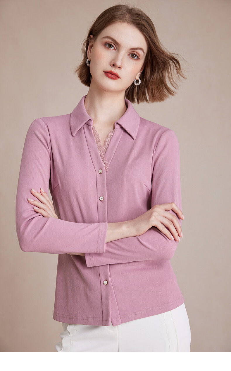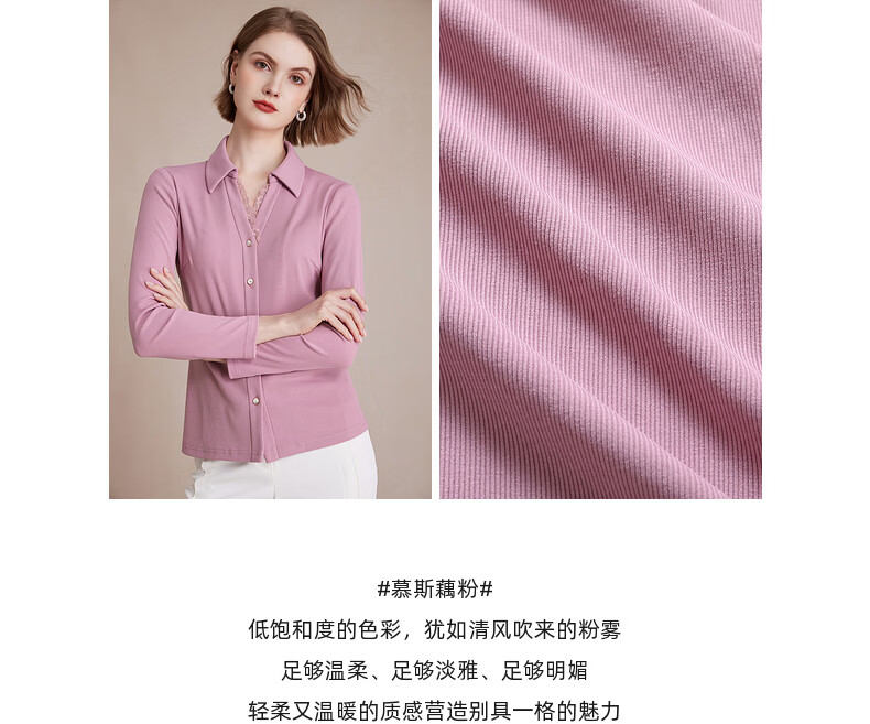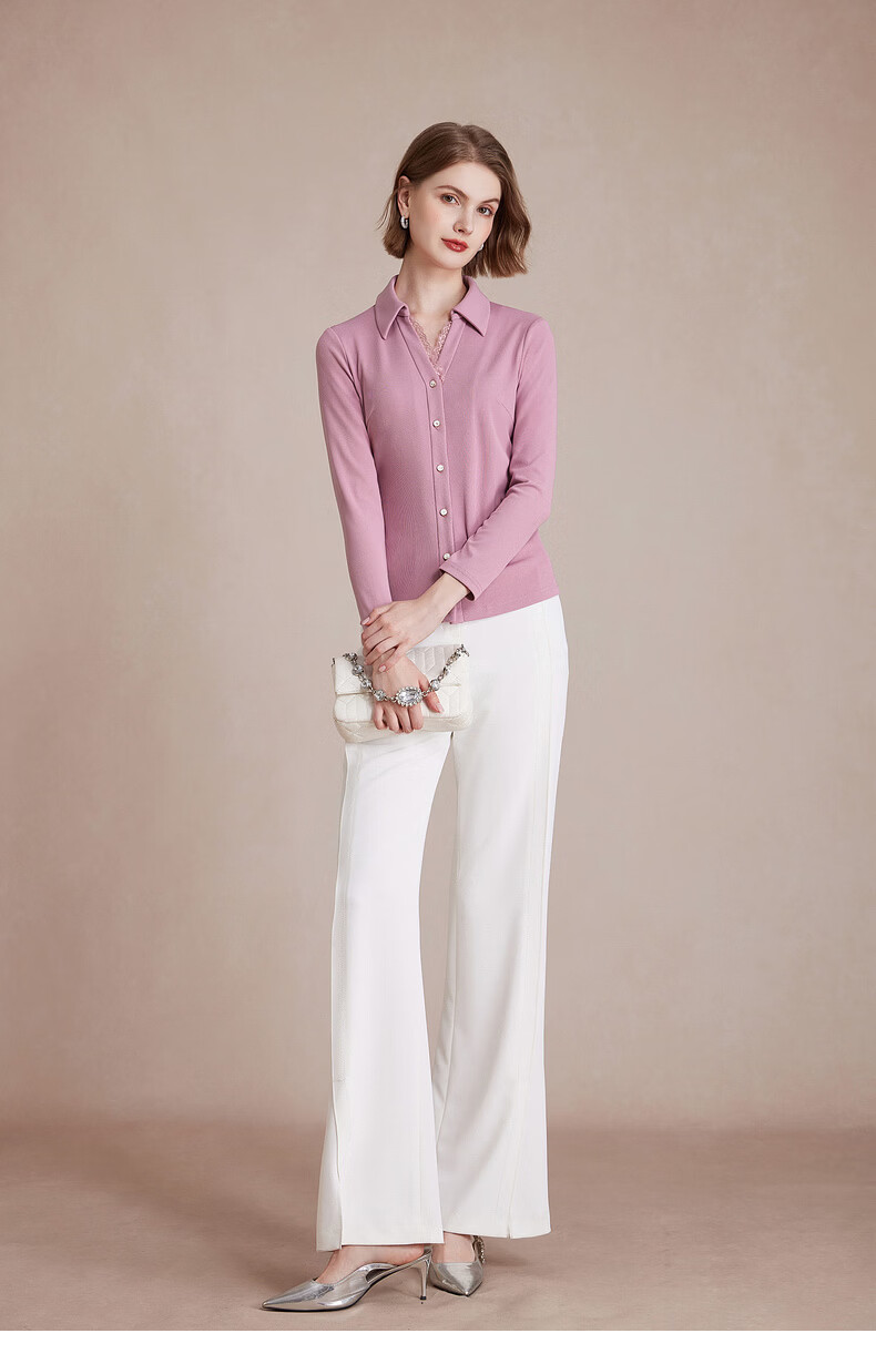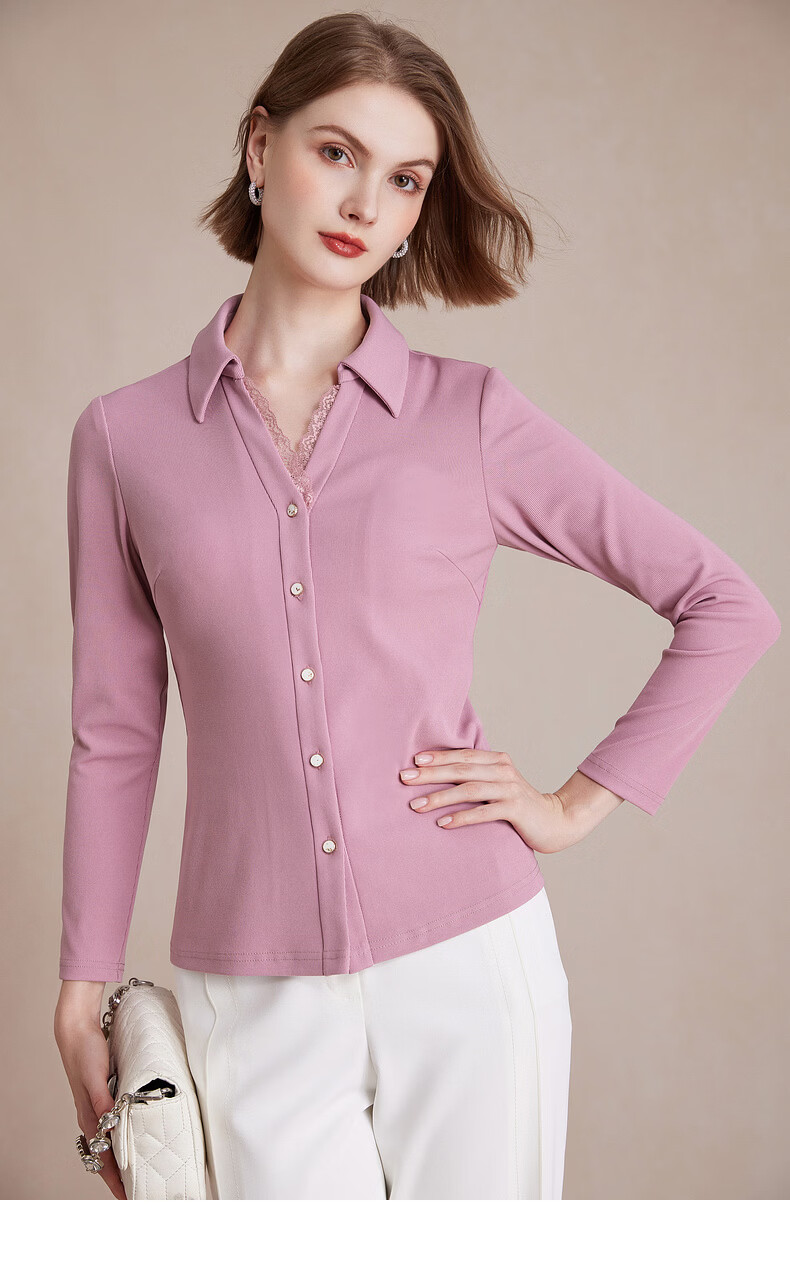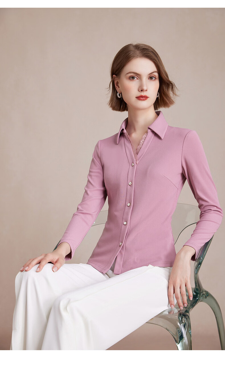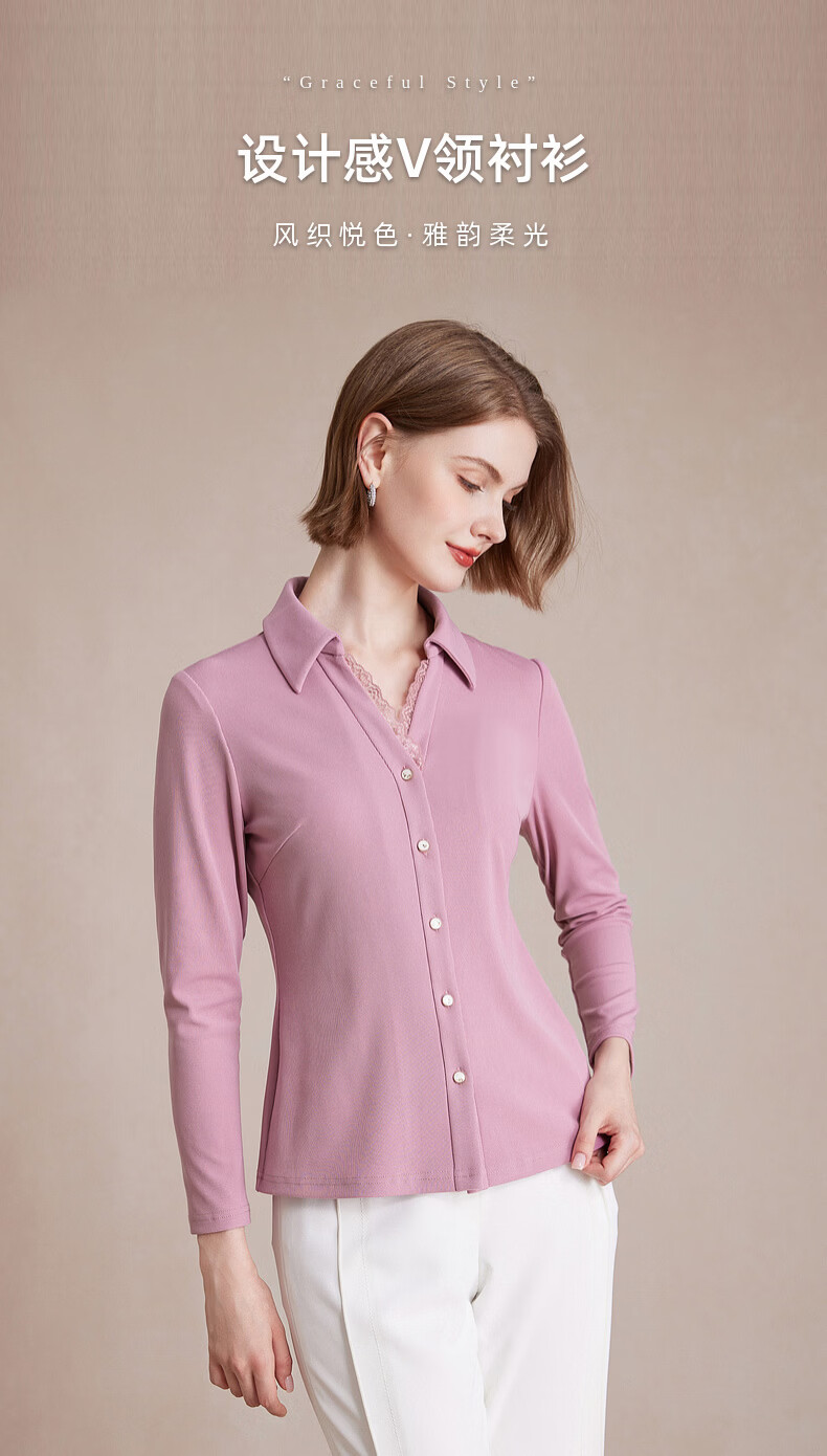 MORELINE Mulan French Elegant V-neck Long Sleeve Shirt Women's 2026 Spring New Simple Age-Reducing Slimming Shirt Mousse Lotus Root Powder M