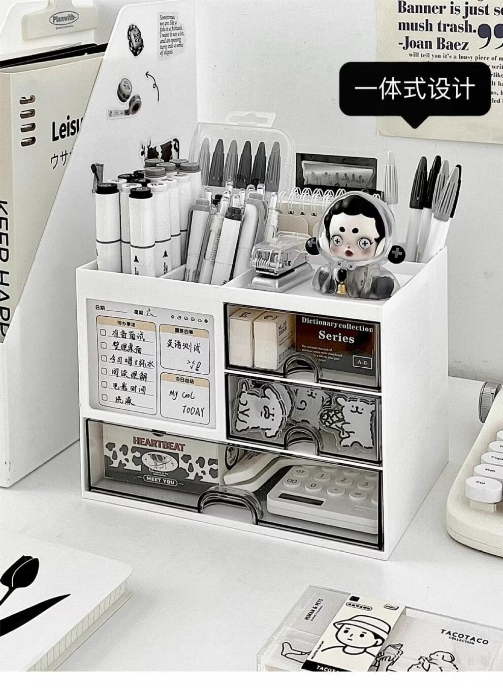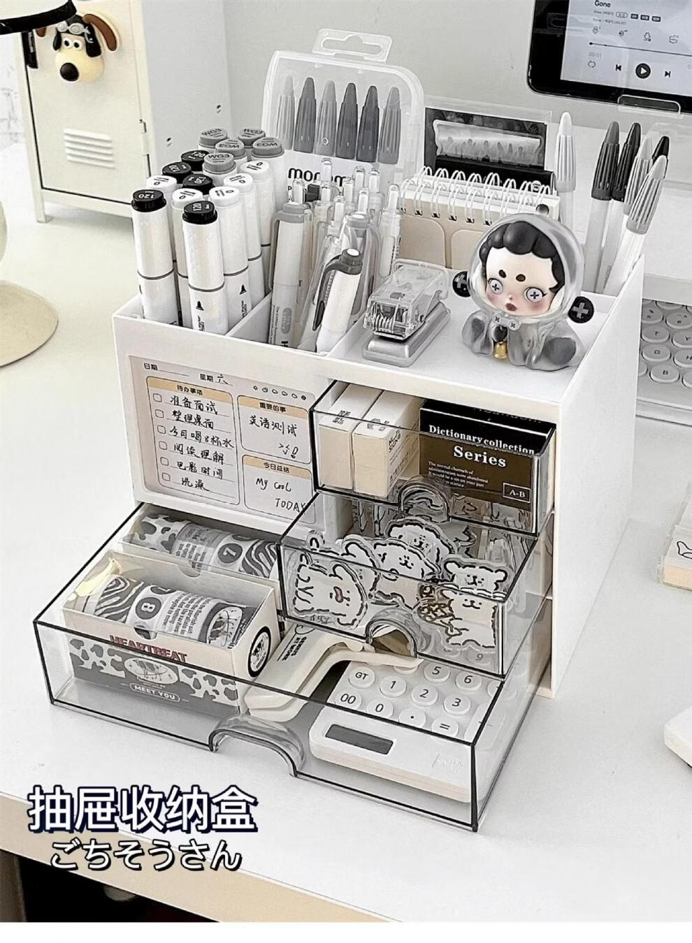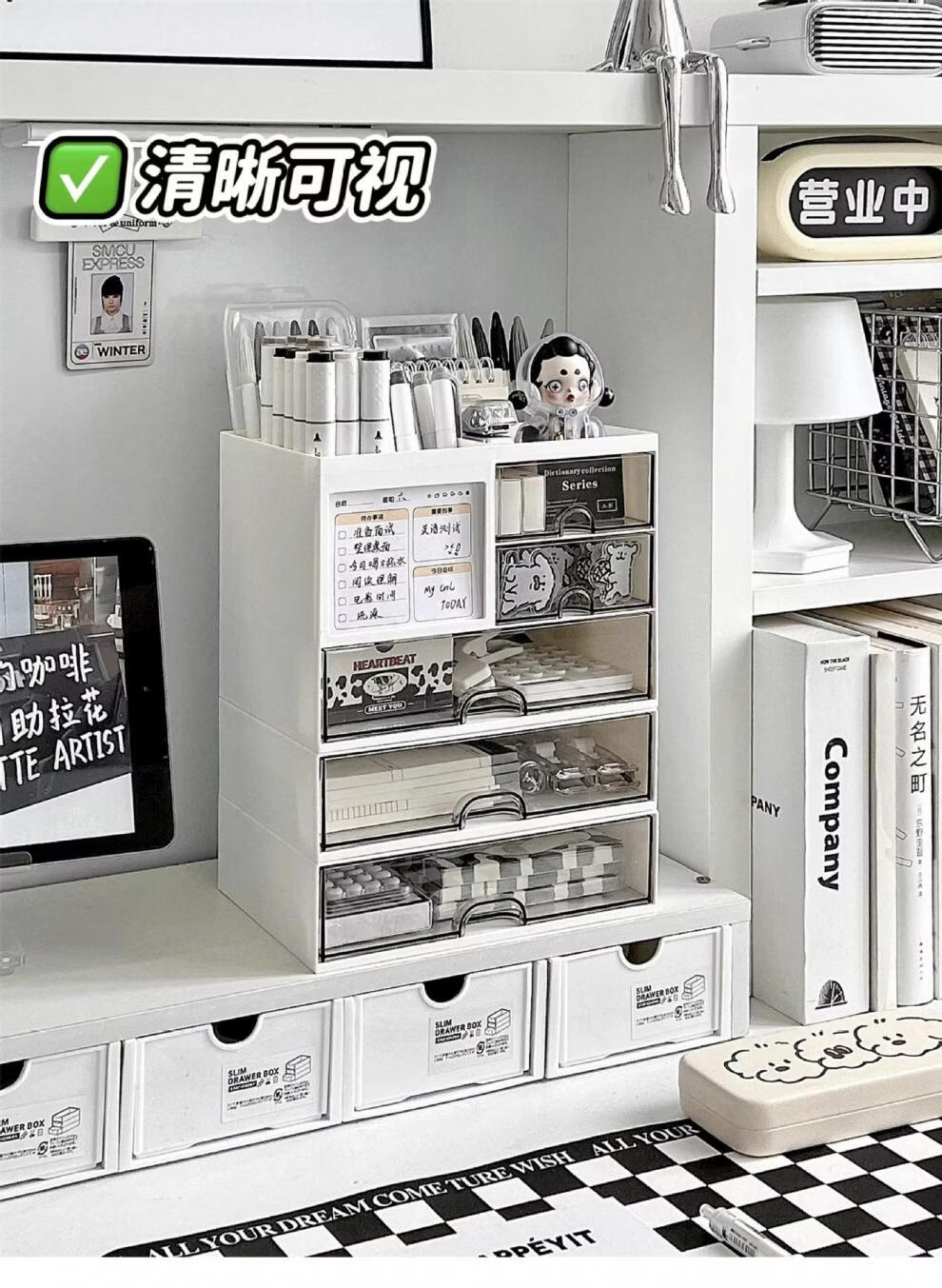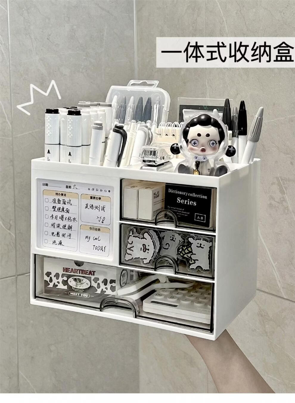 Shijanu Genuine Desktop Storage Box Drawer-Type Student Pen Holder Office Work Position Rack Acrylic Desk Text Vertical Stripe Multi-Function Pen Holder * Rotating Pen Holder_Cream