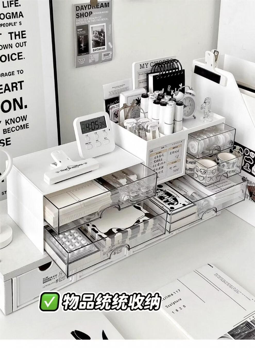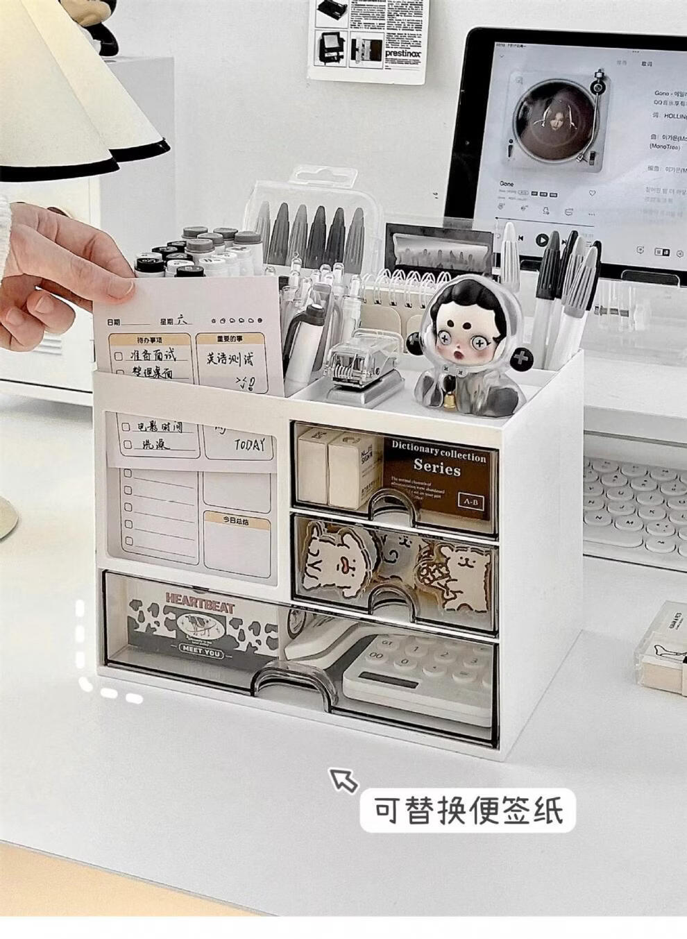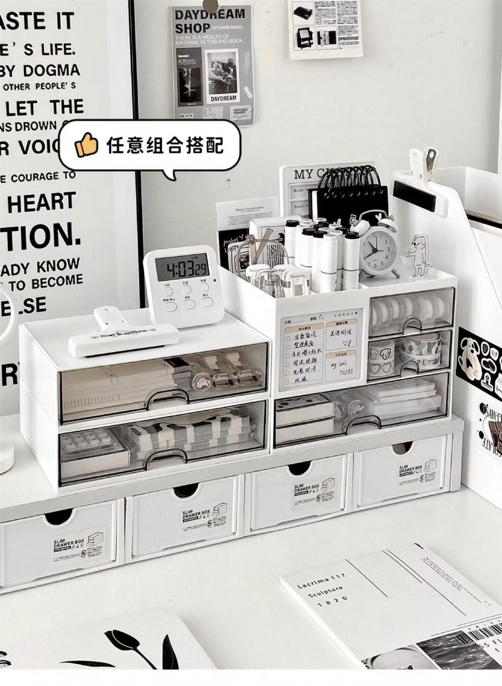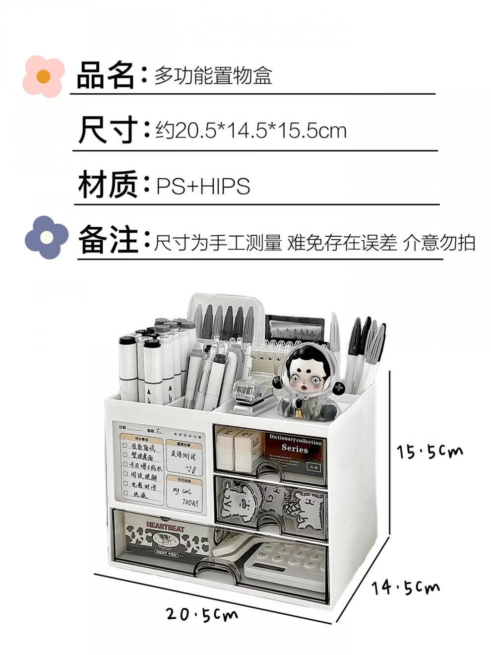 Shijanu Genuine Desktop Storage Box Drawer-Type Student Pen Holder Office Work Position Rack Acrylic Desk Text Vertical Stripe Multi-Function Pen Holder * Rotating Pen Holder_Cream