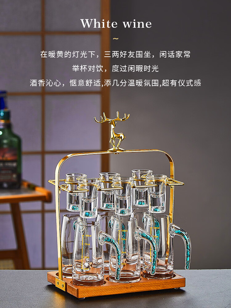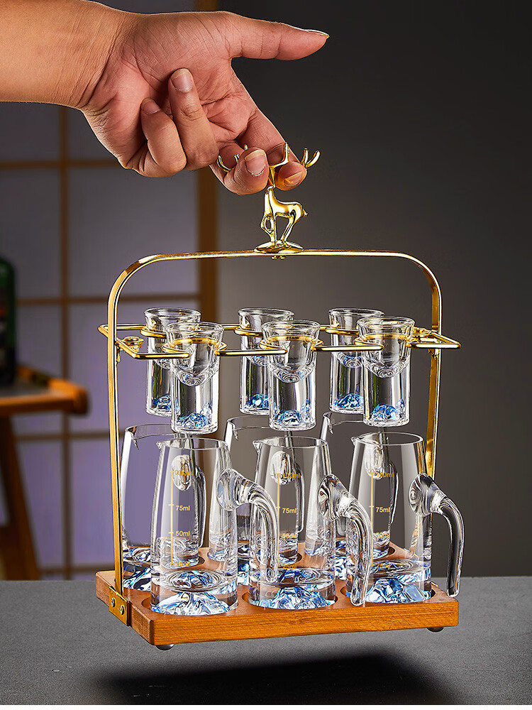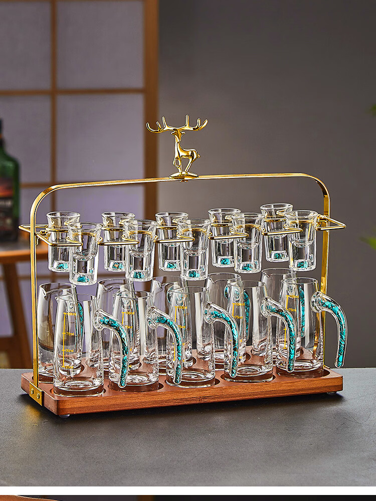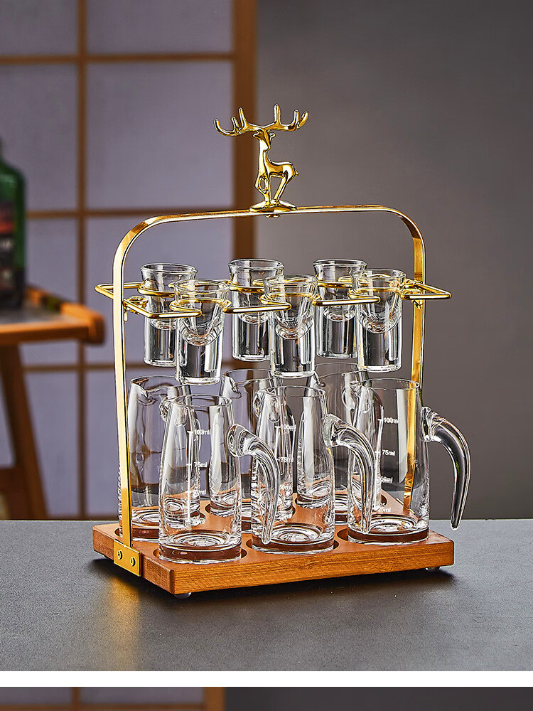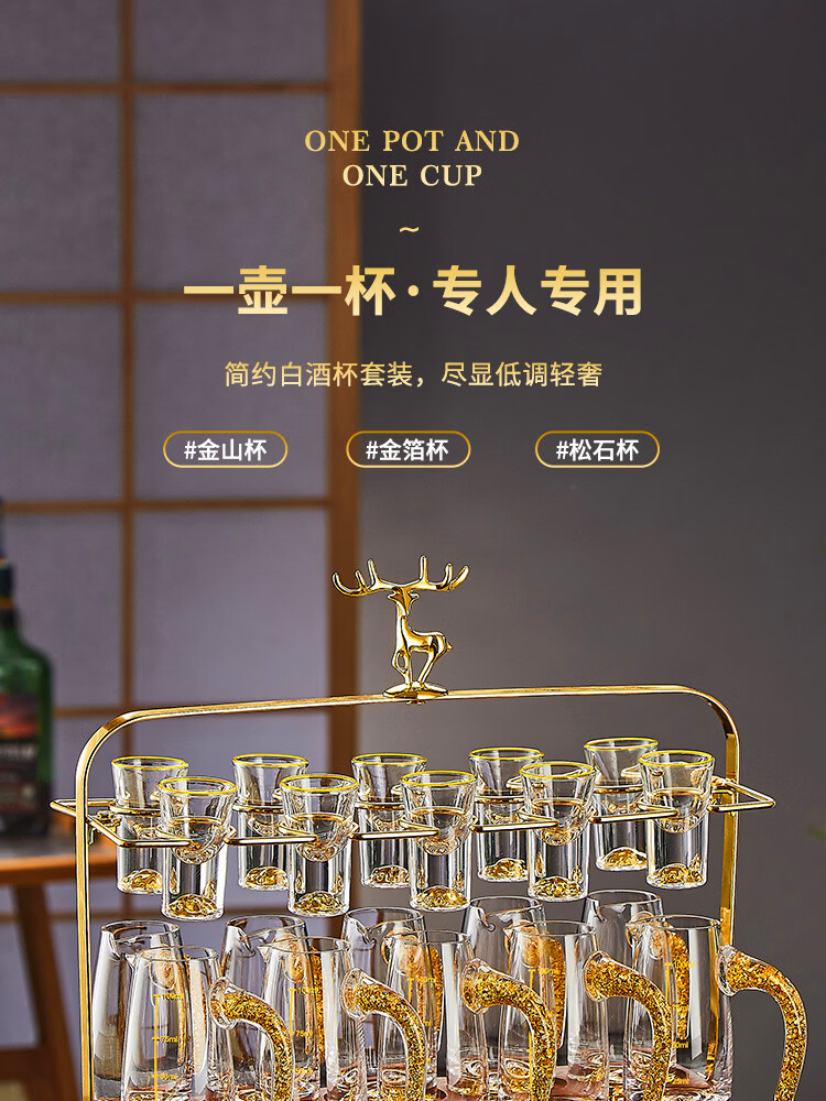 Jingyan gold foil high-end liquor cup set, household high-end two-two-point wine vessel, light luxury high-end wineware, bullet cup, one-cup cup, transparent style, small tall cup/10 pots, 10 cups + golden deer cup